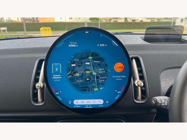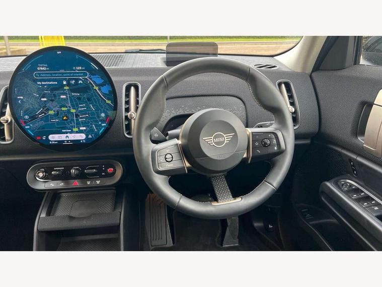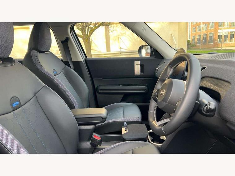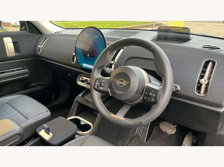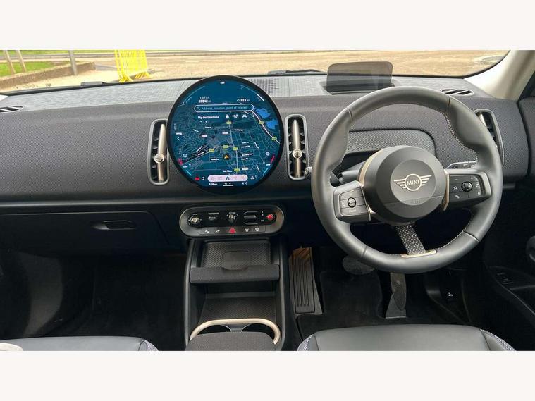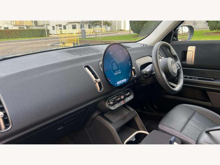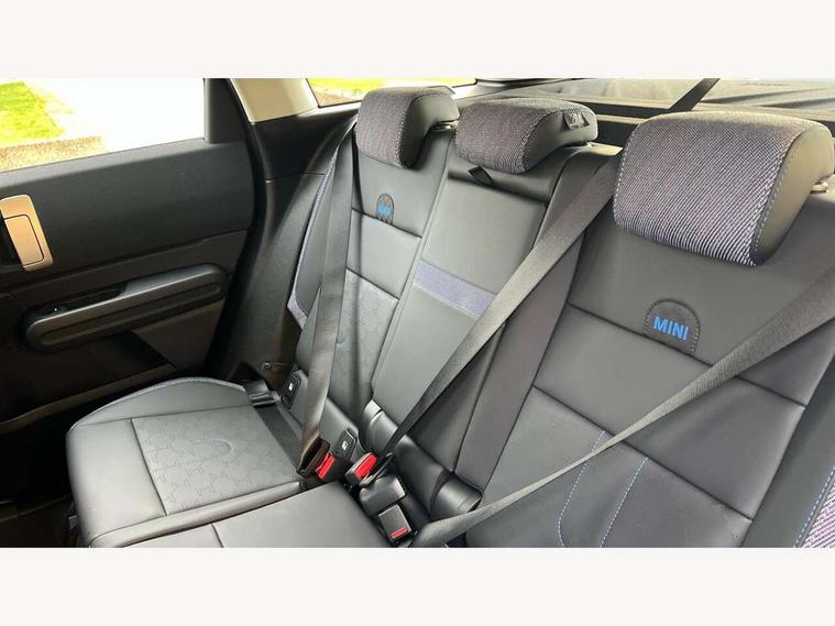 Bluetooth connection, Circular OLED Screen, Compatible mobile phone bluetooth with audio streaming, Cruise Control (DCC), Digital dashboard display, Driving assistant, Driving Assistant Plus Preparation, E-call, Electro-mechanical speed dependant steering assistance, MINI Experience Modes, MINI Head up display, Mini navigation system, MINI TeleServices, Parking assistant in camera and ultrasound based assistance system, rear view camera, parking aid and distance control, Auto transmission with Paddles, Larger capacity fuel tank, 6 speakers, DAB Digital radio, Personal eSim, Auto tailgate, Electric adjustable heated door mirrors, Front and rear electric windows, Heated rear window, High beam assistant, Interior rear-view mirror with automatic anti-dazzle function, LED daytime running lights, LED headlights with extended contents including Adaptable light signatures, LED rear lights, LED third brake light, Rain sensor with auto headlights, Rear side wing doors, Rear window wiper, Roof rails, 3 Seat sliding rear bench in 2nd row, 60/40 split rear bench seat, Auto air conditioning, Driver and front passenger seat heating, Floor mats, Front armrest, Front headrests, Heated steering wheel, Height and length steering column adjustment, Light headliner, Luggage compartment separating net, Rear headrests, Seat adjustment for rear seats, Single front passenger seat, Sport Vescin Steering Wheel, Sunvisors with vanity mirrors, Vescin/Cloth upholstery, Wireless charging tray, Interior and exterior mirror package - Mini Countryman, 3x3 point rear seat belts, 6 Airbags - front, side, head and seat belt tensioners, ABS, DSC - Dynamic Stability Control, Electronic handbrake, Electronic Stability Programme (ESP), Front ISOFIX (iSize), Hill descent control, Hill hold assist, Hill start assist, Manual rear child locks, Traction control, Tyre pressure monitoring system, Warning triangle, Alarm system with tilt sensor, monitoring doors, bonnet interior and tailgate, Auto drive away locking, Comfort access system, Deadlocking function, Electronic vehicle immobiliser, Locking wheel bolts, Remote control locking, Start/stop toggle with keyless go, Black/Blue dashboard knit, MINI Mobility Kit,