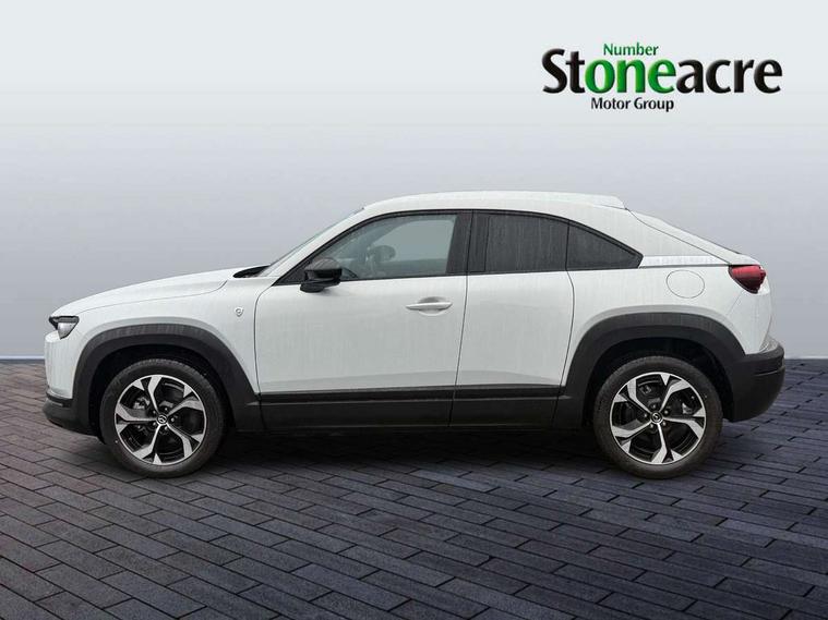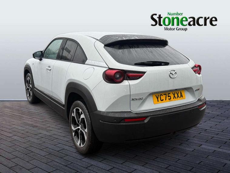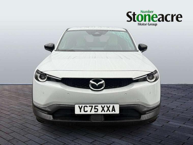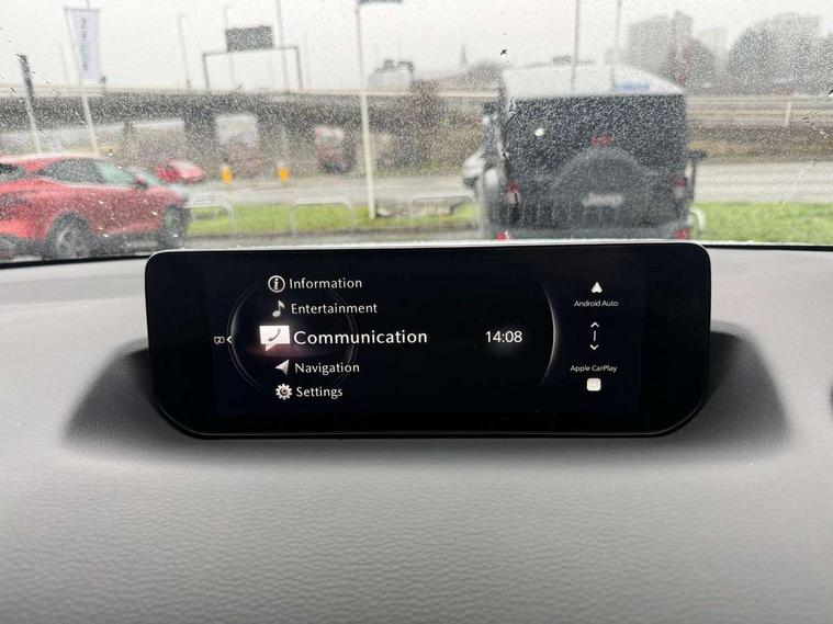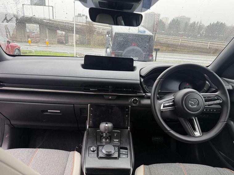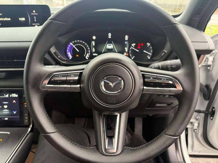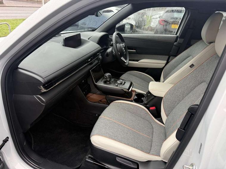 10.25" TFT colour centre display with Mazda Connect infotainment, 7" TFT Colour driver instrument panel display, Adaptive cruise control (Mazda radar cruise control) features stop and go, Apple car play/Android Auto, Blind spot monitoring with rear cross traffic alert, Drive mode switch, Driver attention alert system, E-call with GPS, Emergency lane keeping with blind spot assist and road keep assist, Emergency stop signalling system, Front and rear parking sensors, Integrated bluetooth, Integrated Mazda navigation system, Intelligent speed assist, Lane keep assist system (LAS) with Lane departure warning system (LDWS), PAS, Power start/stop button, Reversing camera, Service indicator, Trip computer, Windscreen projected colour active driving display (head up display) with traffic sign recognition, 11 kW triphase onboard charger, DC socket for rapid charging up to 40KW, Internal Combustion Engine Sound Emulator, Type 2 for mode 2 AC charging via 3-point plug, Type 2 for mode 3 AC charging via home or public charge points, 8 Speakers, DAB Digital radio, FM, Multimedia Commander including separate volume dial, Steering wheel mounted audio/bluetooth controls, Satin black - Lower bumper and wheel arch and side mouldings, Auto dimming driver's door mirror, Auto headlight levelling, B-pillar and C-pillar garnishes in gloss black finish, Black front grille, Body coloured bumpers, Coming/leaving home lights, Door mirrors with adjustable memory and tilt down function when in reverse, Dusk sensing headlights, Electric front windows with one touch auto up/down, Electrically adjustable door mirrors, Frameless auto dimming interior rear view mirror, Front, rain-sensing wipers with adjustable sensitivity and speed, Gloss black rear roof spoiler, Heated and auto power-folding door mirrors in black with integrated indicator lights, High beam control, Kodo turn signal, LED 3rd brake light, LED daytime running lights, LED Headlights, LED rear combination lights, Privacy glass (rear side windows and rear screen), Rear side wing doors, Rear wiper, Unique R-EV exterior badging, 12v electrical power outlet, 2x USB C and 12V Outlet, 3 seat bench in 2nd row, 60/40 split fold down rear seats, 8-way power adjustable driver seat with memory linked to door mirror and Active Driving Display, Black roof lining, Bright finish power button surround, Bright interior trim accents with steering wheel centre bezel, surround of engine start / stop button and glove box handle, Climate control air conditioning operated by the central 7" touchscreen control panel, Cloth/artificial leather upholstery, Door panel trim - cloth with artificial leather armrest and cork inserts around inner door handle, Driver and front passenger two rear grab handles with rear coat hooks, Driver, front passenger and two rear door pockets, Drivers and front passengers sun visors with vanity mirrors and driver's ticket holder, Front and rear LED lighting, Front centre armrest with storage and two cupholders, Front passenger seat manual slide, recline and height adjust, Heated front seats with 3 stage setting, Illuminated glovebox, ISOFIX child seat anchorage points attached on outer rear seats, Leather wrapped steering wheel and shift lever, Luggage compartment LED lighting, Mazda heritage cork accents on the console tray and cupholder lids, Power driver lumbar support, Rear centre armrest with two cup holders, Remote pre-heating/cooling, Roof mounted sunglasses holder, Seatback pocket at rear of the front passenger seat, Single front passenger seat, Steering wheel telescopic and tilt adjustment, Tonneau cover, Two front and three rear height-adjustable head restraints, 3 point ELR front seat belts x2 with pretensioners, 3x3 point rear seat belts, Anti-lock braking system (ABS), Collision avoidance braking, Driver central airbag, Drivers knee airbag, DSC - Dynamic Stability Control, Electric G-Vectoring control plus, Electronic parking brake with auto disengage function and auto hold function, Front and rear curtain airbags, Front dual stage driver and single stage front passenger airbags, Front passenger airbag cut-off switch, Front side airbags, Hill hold assist, Pre-crash safety system - Smart brake support (SBS) with turn-across traffic, Rear door child safety locks, Regenerative braking system (5 modes. Selected via paddle shift switches), Seatbelt reminder audible warning for driver, passenger and rear seats, Traction control system (TCS), Tyre pressure monitoring system (TPMS), Keyless Go, Remote central locking with deadlocking and automatic door lock when driving, Smart keyless entry, Thatcham accredited alarm and immobiliser, 18" Black diamond cut alloy wheels, Emergency tyre repair kit,