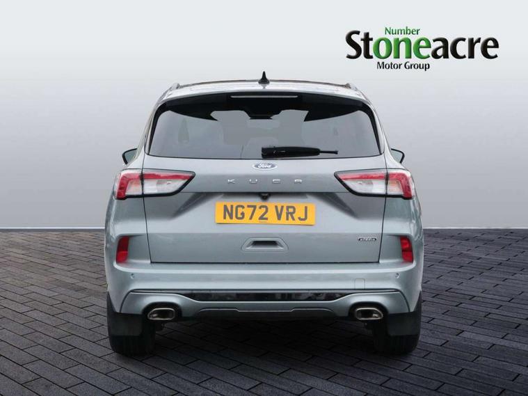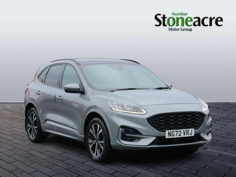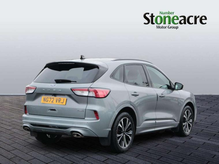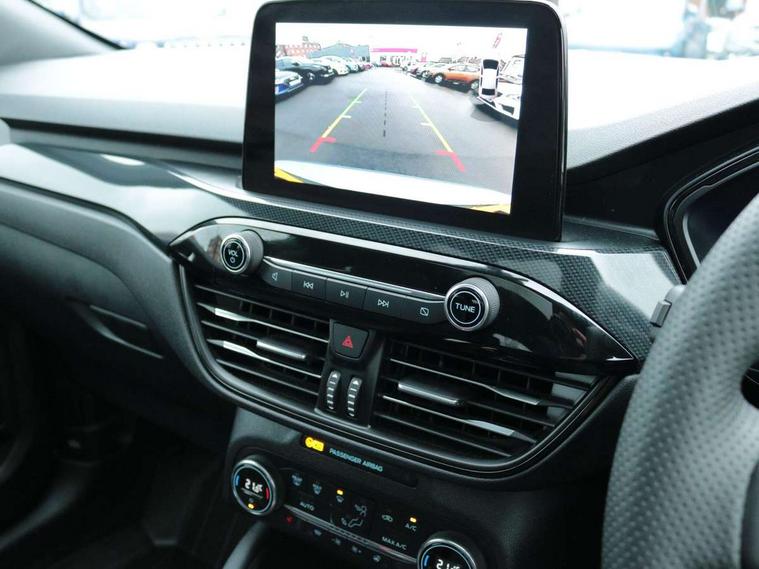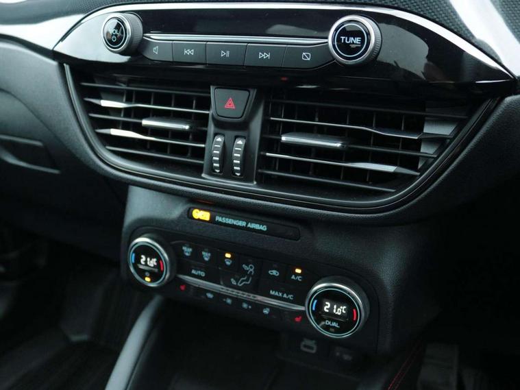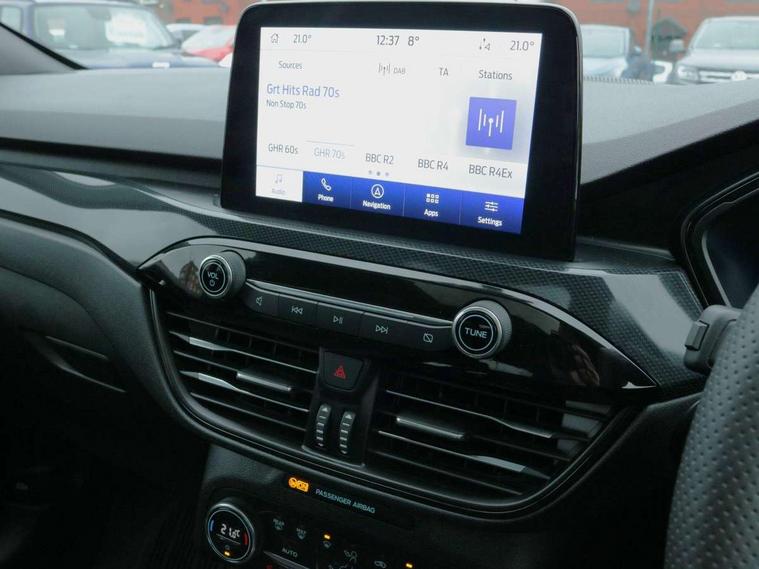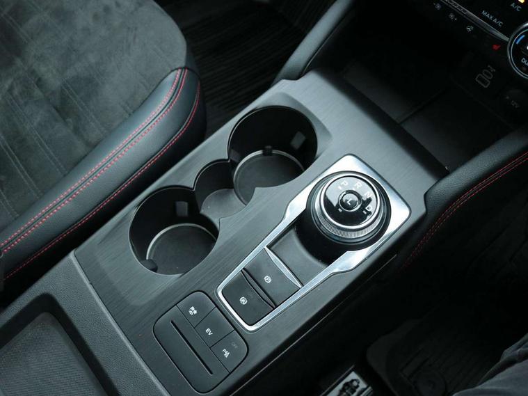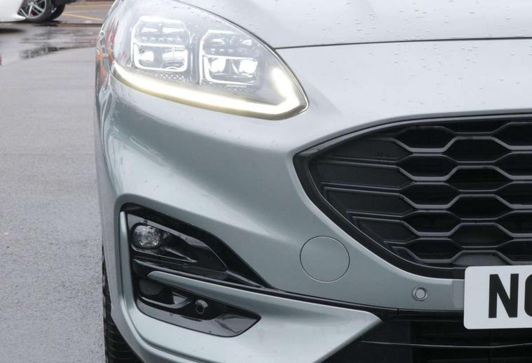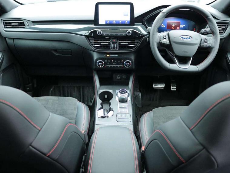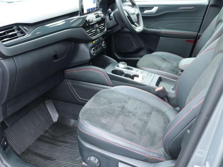 Driver impairment monitor, Ford easy fuel, Ford SYNC 3 with 8" colour touchscreen, App Link, andriod auto/apple carPlay and navigation with Ford pass connect, Front and rear parking sensors, Hands free power tailgate, Intelligent speed assist, Lane keeping aid with lane departure warning, Mobile phone wireless charging pad, Power assist steering, Selectable drive modes, 3-Pin Home charge cable (230V/16A Domestic socket), Sports suspension, Ford DAB audio system with 6 speakers, Auto dimming rear view mirror, Auto headlamps with high and low beam, Auto wipers, Black roof rails, Front LED fog lights with cornering function, Full LED headlamps, Large rear spoiler, LED daytime running lights, LED rear lights, Power folding heated door mirrors with puddle lights, Power front/rear windows with global close, Power opening panoramic roof, Privacy glass, Quickclear heated windscreen, ST Line body styling kit with unique front and rear fascia and bumper, rear painted diffuser, front painted skid plates, dark mesh upper grille, ST Line front scuff plates, Twin exhausts, 10 way power adjustable drivers seat, 2nd row sliding seats, 8 way manual passenger seat including lumbar support and height adjust, Alloy pedals, Ambient lighting, Centre console with electronic parking brake, Dark headlining and pillars, Dual electronic automatic temperature control, Flat bottomed leather steering wheel in sensico with red stitching, Front and rear head restraints, Heated passenger and driver seats, Rear charging point, Sensico partial premium leather upholstery, Sports seats, ST Line front and rear floor mats, B&O with large instrument cluster pack - Kuga, 3x3 point rear seatbelts, Airbags - front driver/passenger, front and rear curtain, Drivers knee airbag, Electronic stability control (ESC) and ABS, Ford MyKey Gen 2 safety system, Post collision braking, Powered child proof rear door locks, Pre collision assist with autonomous emergency braking, Red brake calipers, Tyre pressure monitoring system, Engine immobiliser, Keyless entry, Keyless start with 'Ford Power' starter button, Locking wheel nuts, Remote powered central double locking doors, Thatcham category 1 alarm,