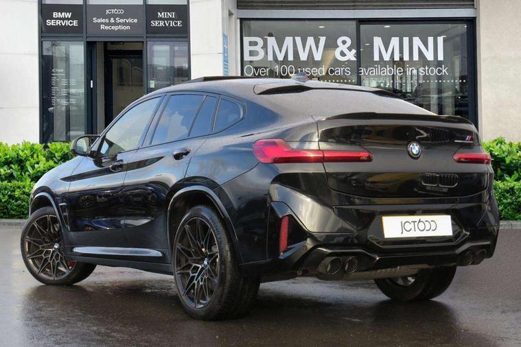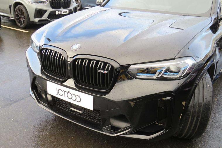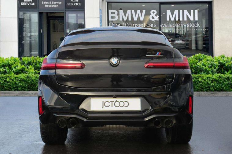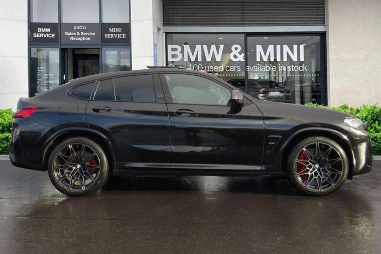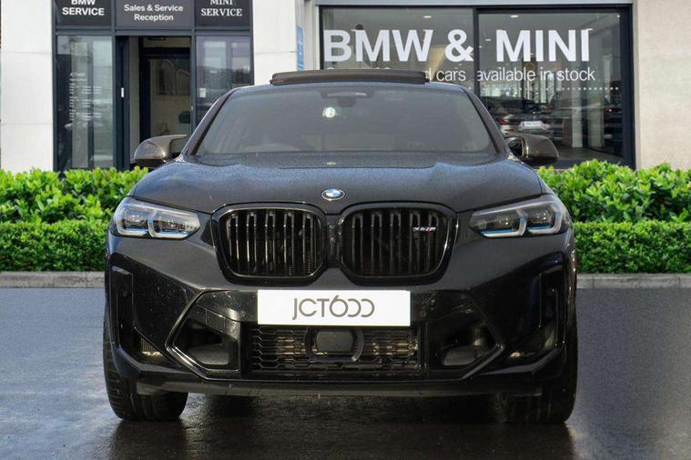 Active Guard Plus incl front collision warning with brake intervention, Attentiveness assist, Auto start-stop, Automatic tailgate operation, BMW ConnectedDrive online services, BMW gesture control, BMW Live Cockpit Professional Nav with 12.3" instrument display + 12.3" control display, Intelligent Voice Assist, BMW OS 7, HDD, 2USB, 4G LTE connect, BMW service history, BMW Teleservices, Brake pad wear indicator in front and rear, Check Control warning system for monitoring of lights and door/luggage compartment open warning, Condition based service, Cruise control with brake function + speed limiter, Electronic Power Steering (EPS), Enhanced bluetooth with wireless charging, Front/rear park distance control (PDC), Head up Display, iDrive touch controller with 8 favourite buttons, Integrated owner's handbook, Language version English, Lights on warning by audio warning signal when ignition is switched off, M drive buttons, Oil sensor for level and grade, warning by check control system, On board computer - average speed+fuel consumption, service interval, clock/date, odometer/trip meter, outside temperature display and ice warning, Personal Profile - automatic lock when driving away selectable, Shifting point display, Variable sport steering, Wifi hotspot preparation, Activation of safety battery terminal clamp, Active M differential, Adaptive M suspension, Double joint spring strut front axle, Drive experience mode switch - Comfort mode, ECO PRO mode and SPORT mode, Electronic differential lock, EU6 emissions management, Incorrect fuelling protection, M Sport differential, Performance Control, Sport automatic transmission with steering-wheel mounted gearshift paddles and launch control, 2 USB ports for charging in rear of centre console, 2x USB Type C ports in front centre console for charging and data transfer, DAB tuner, Electronic service booklet, Harman Kardon loudspeaker system, Acoustic glazing, Auto dimming rear view mirror, Automatic headlight beam throw control with load dependent regulating reaction, dynamic compensation of braking dive and acceleration squat, Black finish on B pillars, Body colour door handles, Body colour front and rear bumpers, Direction indicator, side repeaters, integrated in exterior mirrors, Dynamic brake lights, Electric front and rear windows with fingertip open/close + anti-trap facility and comfort closing function, Electrically adjustable and heated door mirrors, Folding wing mirror with auto dimming, Follow me home headlight function, Front and rear bumper system with replaceable deformation elements, Green tinted heat protection glazing, Heated windscreen washer jets, High beam assistant, High gloss shadowline exterior trim in decorative moulding side frame/recess cover/guide rail/B, C pillars/mirror frame and triangle with mirror base, High level 3rd brake light incorporating LED Technology, LED tail lights, Lightweight engineering, M competition bodystyling, M door entry sills, M Double slat kidney grilles in High Gloss Black with black slats, M Exhaust tailpipes - Quad, round, split left and right with high gloss black finisher 100mm, M Sport exhaust system, Model inscription logo on right tailgate, Rain sensor including auto headlights activation, Rear side wing doors, Rear wiper, Reversing lights, Shark fin antenna, Sun protection glass, Visible VIN plate, Welcome lighting, Windscreen wipers with adjustable interval, 2x 12V power socket in luggage compartment and front centre console, 3 seat bench in 2nd row, 3 zone automatic air conditioning, 40/20/40 split folding rear seats with backrest, Anthracite headlining, Battery in luggage compartment, Electric seat adjustment with memory, Floor mats in velour - Front and rear colour co-ordinated with all standard carpet colours and front with M stripes, Foldable boot floor with storage compartment, Four grab handles integrated in roof lining, Four-way electrically adjustable front lumbar support, Front and rear bottle holders integrated into door trim storage compartments, Front and rear side armrests integrated into door trim, Front centre armrest with storage compartment, Front cupholders x 2, Front head restraints, Front M sport seats with electrically adjustable headrests and illuminated M logo in headrests, Glove compartment with illumination, Heated front and rear seats, High gloss black front door sill finishers with X4 M competition designation, Luggage compartment lighting, M Gear knob, M sport leather steering wheel, Microfilter and active carbon filter, Multifunction steering wheel, Parcel shelf removeable and storable under boot floor, Reach and rake adjustable steering column, Rear seat centre armrest with two cupholders, Single front passenger seat, Steering wheel heating, Storage compartment in rear centre console, front and rear door trims and under luggage compartment, Sunvisors with illuminated vanity mirrors and ticket pocket, Three rear headrests, Through loading system with 40/20/40 split folding rear seat, Toolkit located in luggage compartment, Ambient light pack - X3/X4 M, Connected package professional - X3 M/X4 M, Extended storage pack with Stainless steel door sills - X4 M, Interior and exterior mirror pack - X3/X4 M, Interior lighting pack -X3/X4 M, Active protection, ADB - Automatic Differential Brake, Airbags - Front driver/passenger, front and rear curtain head protection, front side, manual deactivation of front passenger airbag, Anti lock braking system (ABS) with brake assist, Automatic Stability Control (ASC), BMW emergency call, Brake drying, Brake energy regeneration, Braking pre-tensioning, Child proof locking system in rear door, Child seat ISOFIX attachment rear outer seats, Compound structure brake discs, Cornering brake control (CBC), Crash Sensor - activation of airbags, Crash Sensor - activation of central locking release, hazard warning light and interior lighting, Crash Sensor - Deactivation of the high voltage system, Deactivation of fuel pump in the ev