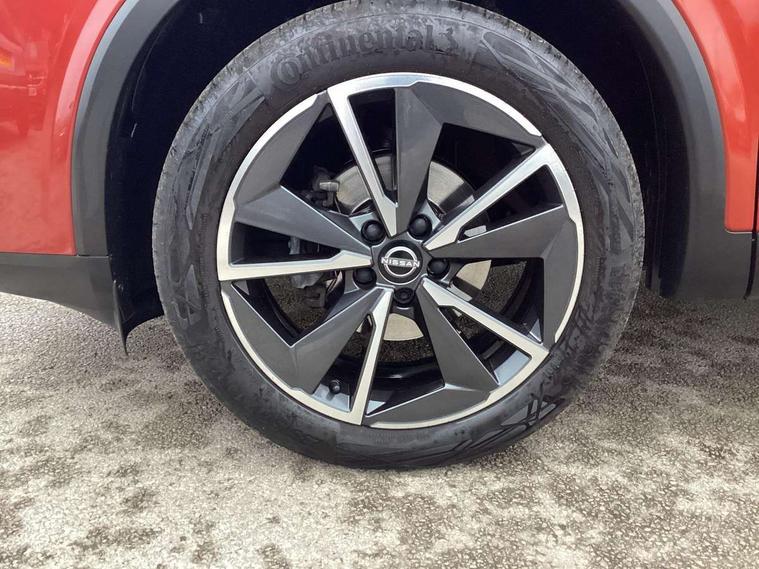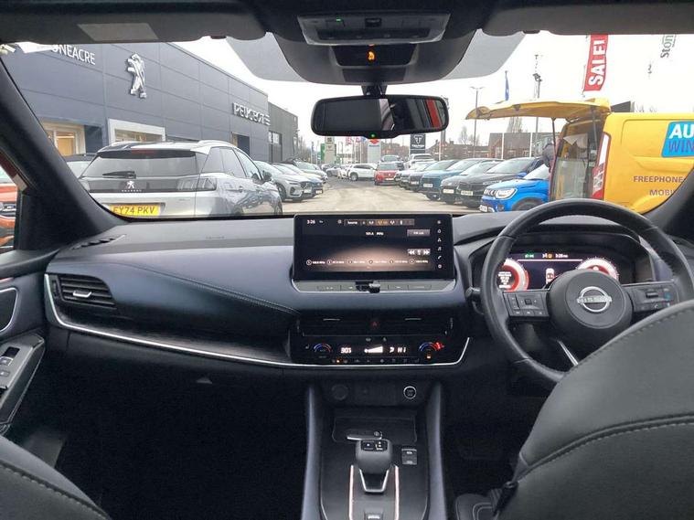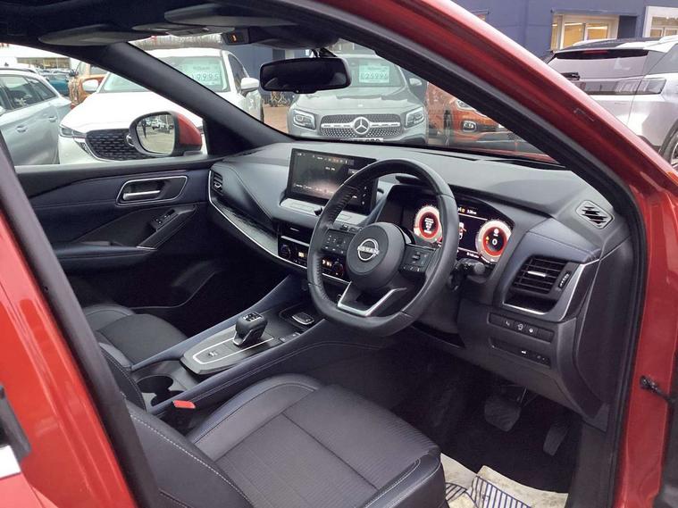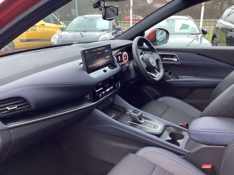 Advanced windscreen head up display, Android auto/Apple CarPlay (Wired), Blind spot warning, Drive modes (sport, normal, eco), Electric speed sensitive power steering, Emergency and breakdown call, Front and rear parking sensors, Full Digital 12.3" TFT Digital Combimeter, Google maps services - search, weather, 3D maps and Google street view, Hands free power tailgate, Idle stop/start system, Intelligent around view monitor, Intelligent Cruise control (ICC), Intelligent driver alert system, Intelligent forward collision warning, Intelligent lane intervention, Lane departure prevention, Lane departure warning system, Lane keep assist, Moving object detection, Nissan connect 12.3 inch touchscreen infotainment system, Nissan connect navigation, ProPilot, Push button starter, Rear cross traffic alert, Rear view camera, Remote control services - door locks, lights, horn and car locator, Telematics - notifications and connectivity services, TomTom live traffic services, Traffic jam pilot, Traffic sign recognition with legal speed adjustment, Trip computer, Virtual personal assistant and firmware over the air capability, Wireless apple carplay, Wireless charging pad, 6 speakers, AM/FM audio system with DAB, Bluetooth audio streaming, Front USB connections (Type-A and Type-C), Rear USB charging only ports (Type-A and Type-C), Auto dimming rear view mirror, Auto rear wiper when reversing, Automatic hazard signal with emergency stop signal, Body colour mirror caps, Body coloured door handles, Bodyside mouldings, Chrome side window finisher, Door handle with button, Electric auto folding door mirrors, Electrically adjustable and heated door mirrors with LED turn indicator, Follow me home headlights, Front and rear LED turning signals, Headlights auto levelling system, Intelligent auto headlights, LED daytime running lights, LED headlights with adaptive driving beam, LED rear lights, One touch front and rear electric windows with remote opening and closing, Partially body coloured bumpers, Privacy glass, Rear bumper with graphite insert, Rear reversing light (bulb lighting), Rear roof spoiler, Rear side wing doors, Rear styling plate, Shark fin antenna, Splash free rain sensing wipers, Super UV and infrared cut glass, Thermaclear heated windscreen, Three blink turn signal, 12v power socket in dashboard and luggage, 2x Rear coat hooks, 3 bench rear seats in 2nd row, 3 rear headrests, 4 folding assist grip, 6 Luggage hooks - 4 on floor, 2 on side, 60/40 split folding rear seat bench, Ambient lighting around centre console, Ambient lighting in front doors, Centre console storage tray, Chrome interior door handles, Cloth/syntech leather monoform upholstery, Dark black/blueish PVC wrapping, Dark headlining, Driver and front passenger sunvisors with illuminated vanity mirrors, Driver seat back pocket, Dual zone automatic climate control with pollen filter, Electrically adjustable driver seat, Electrically adjustable lumbar support for driver, Front and rear door storage, Front centre console and armrest, Front cupholders x 2, Front door with bottle holders, Glovebox with light, Hard trunk cover, Heated front seats, Heated steering wheel, Height adjustable driver's seat, Height adjustable front headrests, Height adjustable passenger seat, Leather steering wheel, Luggage board system, Luggage space lighting, Manual lumbar support on passenger seat, Manually adjustable passenger (slide recline + lifter), Multifunction steering wheel, Passenger seat back pocket, Rear armrest with 2 cupholders, Rear door bottle holders, Single front passenger seat, Soft PVC kneepad, Steering wheel gearshift paddles, Steering wheel switches, Tilt/telescopic adjustable steering wheel, Two rear isofix child seat anchorage points with top tether, Welcome light and doors with console tray ambient lighting, Glass roof pack with roof rails - Qashqai, 3x3 point rear seatbelt pretensioners + load limiters, ABS with EBD and brake assist, Active brake limited slip, Auto hold function, Child locks on rear doors, Curtain and front side, far side airbags, Driver and passenger airbags, Driver, passenger and 2nd row rear seat belt reminder, Electronic parking brake, Front seatbelt pretensioners + load limiters, Height adjustable front seatbelts, Hill start assist, Intelligent blind spot intervention, Intelligent front emergency braking with pedestrian, cyclist recognition and junction assist, Intelligent rear automatic braking, Tyre pressure monitoring system, Vehicle dynamic control, Capless fuel filler, Engine immobiliser, Intelligent Key, Remote central door locking with deadlocking, Thatcham Cat.1 alarm, Interior instrumental panel C finisher, 19" Alloy wheels, Tyre puncture repair kit,