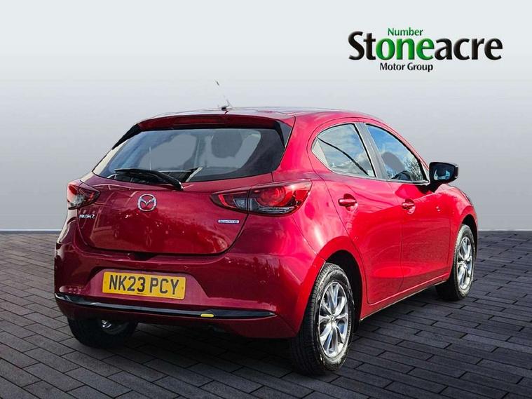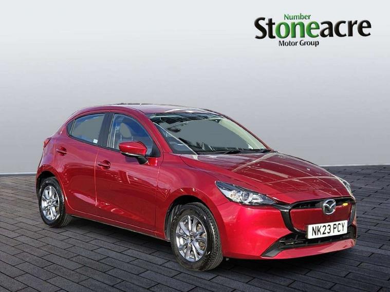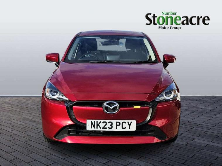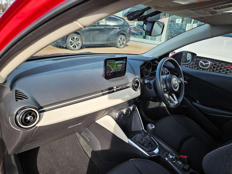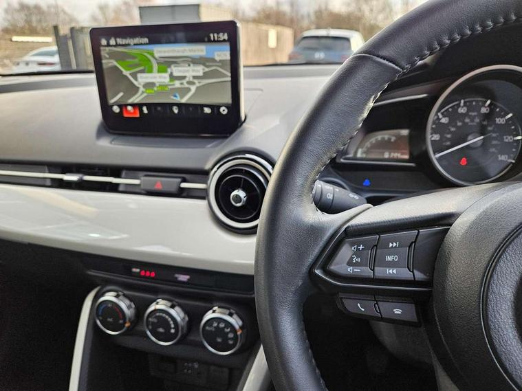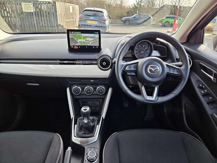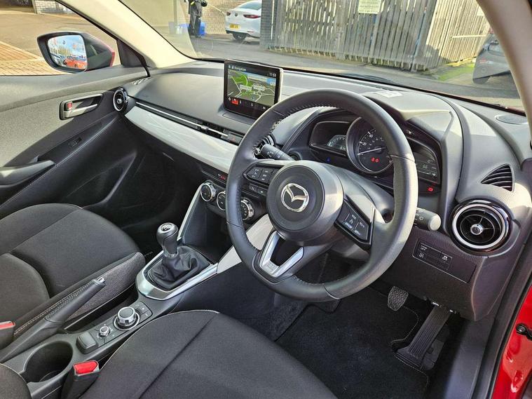 Adjustable speed limiter, Analogue speed display meter, Cruise control, Digital instrument cluster, Digital rev counter, E-call, Emergency stop signalling system, Engine start/stop button, Integrated bluetooth, Mazda connect with 8" colour touch screen, Navigation system, PAS, Rear parking sensor with audible and visual warning, Service indicator, Tailgate, Trip computer, Wireless Apple CarPlay and wired Android Auto, i-stop, AM/FM/DAB radio with 6 speakers with USB and AUX inputs, Multimedia Commander including separate volume dial, Steering wheel mounted audio/bluetooth controls, Auto dimming rear view mirror, Auto headlight levelling, Body colour door mirrors, Body coloured front bumper with black lower bezel, Body coloured rear bumper with black lower mouldings and yellow accent, Coming/leaving home lighting function, Dusk sensing headlights, Electric adjustable/heated/folding door mirrors, Electric front/rear windows with one touch auto up/down for driver's window, Gloss black finish signature wing, Halogen daytime running lights, Heated rear window, LED Headlights, LED indicator lights, LED third brake light, Rain sensing front wipers with adjustable sensitivity and speed, Rear side wing doors, Rear wiper, 3 seat bench in 2nd row, 60/40 split rear seats, Black/white air vent accents, Climate control air conditioning, Driver, Front passenger and two rear grab handles with coathooks, Drivers seat manual slide recline and height adjustment, Drivers/front passengers covered vanity mirrors and drivers ticket holder, Front centre storage with two cupholders, Front head restraints, Front passenger and driver door pockets, Front passenger seat manual slide, recline and height adjust, Front passenger seatback pockets, Gear shift indicator, Glovebox, Interior courtesy light with integrated spotlight, ISOFIX child seat anchorage points attached on outer rear seats, Leather handbrake, Leather steering wheel and gear knob, Luggage compartment light, Premium cloth upholstery, Single front passenger seat, Three height adjustable rear head restraints, Tilt/telescopic adjustable steering wheel, 2x3 point front seatbelts with pre-tensioners, 3 point seatbelts on all rear seats, Anti-lock braking system (ABS), Collision mitigation braking system, Dynamic stability control + Traction control, ESP, Front and rear curtain airbags, Front driver, passenger and rear seat seatbelt warning, Front dual stage driver and single stage front passenger airbags, Front side airbags, G-Vectoring control plus, Hill launch assist, Manual child lock in rear doors, Passenger airbag cut-off switch, Tyre pressure monitoring system, Deadlocking system, Power door locks, Remote central locking, Thatcham accredited alarm and immobiliser, 15" Silver alloy wheels, Emergency tyre repair kit,