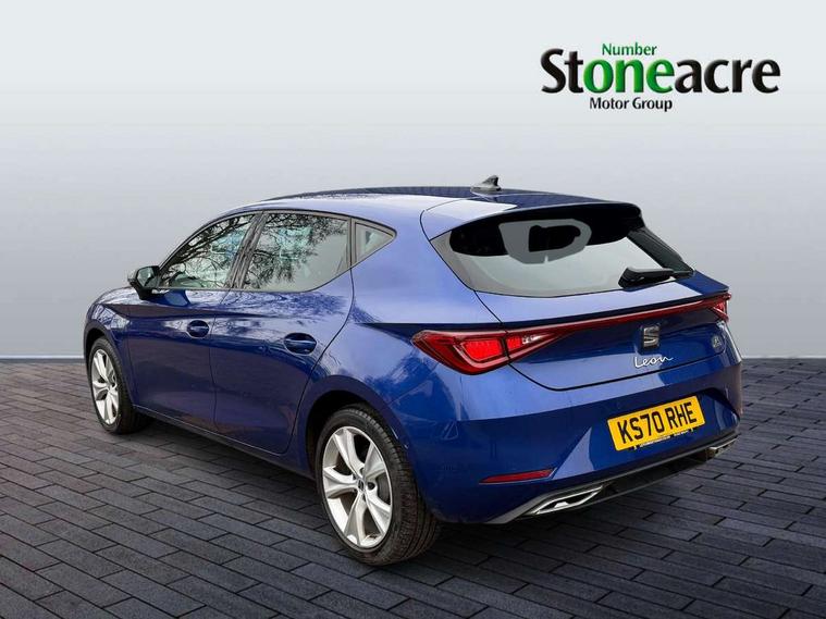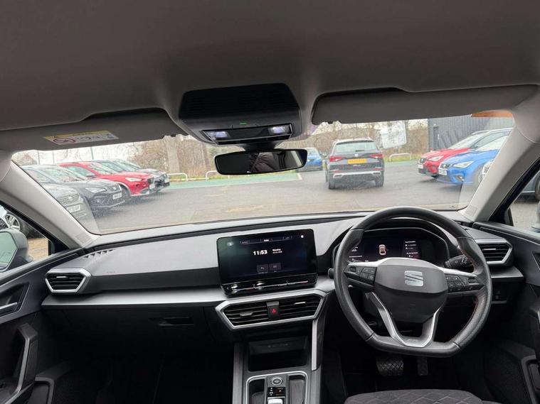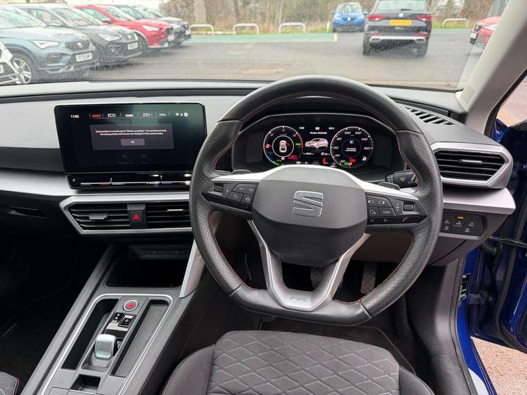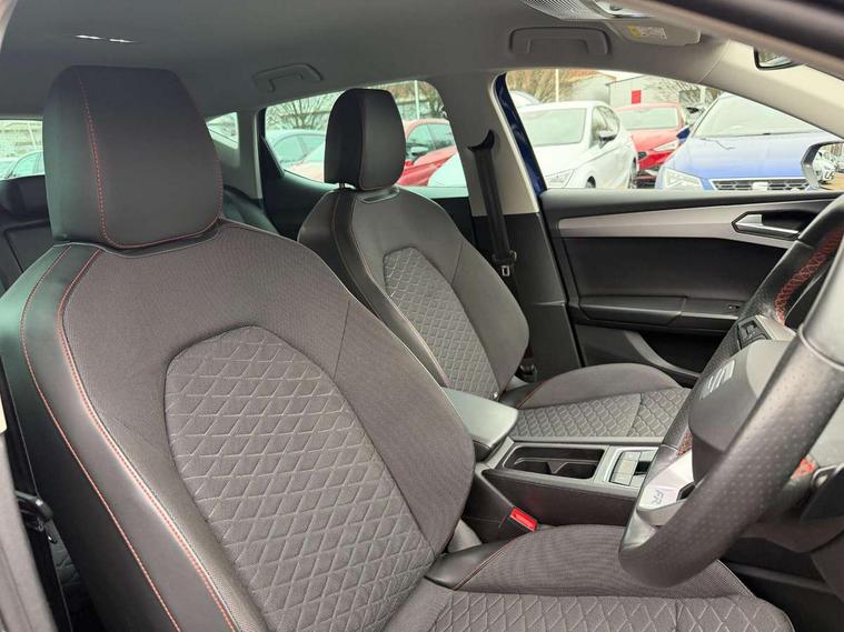 Digital cockpit, Front assist with forward collision warning braking reaction to vehicles, pedestrians and cyclists, Full link smartphone integration with Mirror Link, wireless Apple CarPlay and wired Google Android Auto, Lane keeping system, Park assist (inc front/rear parking sensors), Power assisted speed sensitive electro-mechanical steering, RPM, trip computer, outside temp gauge, instrument light brightness, low fuel warning light, lights on reminder, gearshift indicator, SEAT drive profile with 4 modes (Eco/Normal/Sport/Individual), throttle response and gearshift mode, Service interval indicator, Start/stop system with regenerative braking, 10 amp mode 2 charging cable, Sports suspension, XDS electronic differential lock and dynamic traction support, Auxiliary input socket, Auto dimming rear view mirror, Body colour door handles, Body coloured bumpers, Cosmo grey exterior mirrors with integrated LED indicators, Dark tinted rear windows, Electric front/rear windows, Electrically adjustable, heated and folding door mirrors, FR sports bumper, Illuminated front door sill, LED front fog lamps with cornering function, LED headlights and tail lights with dynamic turn signals, welcome light silhouette from exterior mirrors and dynamic headlight range control, LED rear fog lamp, Rain sensing wipers, Rear wash/wipe, Separate daytime running light with automatic headlight control and coming home feature, 12v power point in centre console, 60/40 split rear bench seat with armrest, Ambient lighting in door trim, Cloth upholstery, Driver/passenger manual seat height adjustment, Dust/pollen filter, Folding boot cover, Front and rear height adjustable headrests, Front and rear reading lights X 4, Front centre armrest, Front seatback storage pockets, Height/reach adjust steering wheel, Interior lighting with LED lighting in sunvisor, glovebox and rear headlining, ISOFIX points in outer rear seats with top tether anchorage points, Luggage tie-down hooks, Lumbar adjustment for front seats, Sunvisors with covered illuminated mirror, Three zone climate control, Tool kit, Media system plus with navigation - Leon, 3 point seatbelts on all rear seats, ABS, Brake control system - ESC and brake booster, Child proof door locks, Driver and front passenger airbags with front passenger airbag de-activation, front side and curtain airbags, Electronic parking brake, Extended safety system - seat belt tensioner, window closure and hazard lights, Hill hold control, Rear disc brakes, Seat belt reminder for front and rear seats, Tiredness recognition system, driver alert system, Tyre pressure monitoring system, Anti theft alarm system with interior monitoring in cab, backup horn and towing protection, KESSY Go (Keyless start), Lockable tailgate, Locking wheel bolts, Wireless phone charging, Chrome interior detailing, 17" Dynamic Bi-spoke alloy wheels with 91W tyres, Emergency tyre repair kit,