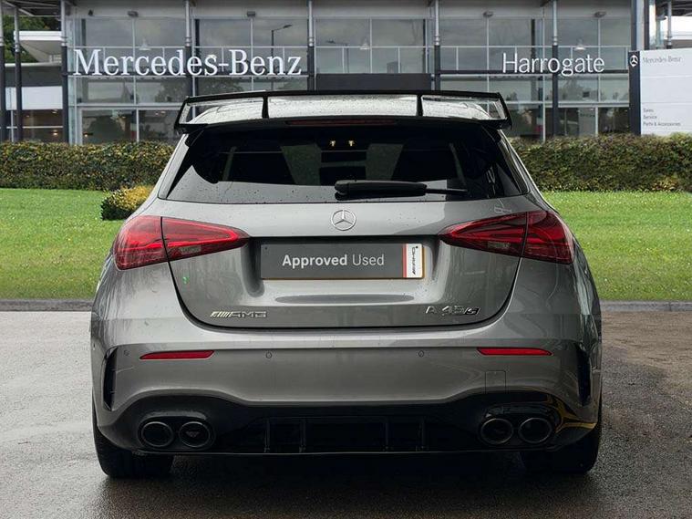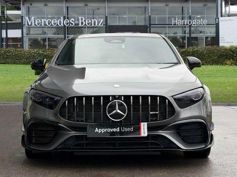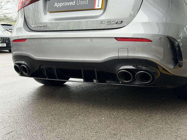 10.25 inch touchscreen central media display with AMG specific, AMG start up logo, visualisation of the AMG drive programs, vehicle and engine data, 10.25" Digital instrument cluster display screen, AMG DYNAMIC SELECT with drive modes(Slippery, Comfort, Sport, Sport+, Individual and Race) incl drift mode via steering wheel shift paddles+Race Start, AMG menu with sporty additional information - Gear indicator with yellow M symbol manual mode, Warm Up menu and Set Up menu, AMG speed sensitive steering with two sets of steering characteristics, Attention assist, Brake pad wear indicator warning light, Car wash mode, Direct steering, Dual bluetooth interfaces, ECO start/stop function, Engine start/stop button, Fingerprint scanner, Fluid level warning indicator for fuel, oil, coolant and washer fluid, Fluorescent jacket for driver, Hard-disk navigation, Head up Display, Hey Mercedes Voice activation, Lamp failure indicator, MBUX augmented reality for navigation, MBUX Interior assistant, Mercedes me connect including emergency call system, accident recovery, breakdown and maintenance management, Mercedes me remote services, Outside temperature gauge, Owners manual in English, Pre-installation of private car share, Preinstallation for Mercedes Benz link, Remote boot closing, Service indicator (ASSYST), Smartphone integration with Apple CarPlay and Android auto, Speed sensitive power steering, Tailgate, Traffic sign assist, Trip computer in multifunction display with current consumption indicator, Wireless charging, AMG performance 4MATIC+ with torque control, AMG suspension including AMG specific axles and sporty spring/damper setup, Suspension with adaptive damping system, Burmester surround sound system (590W) with Dolby atmos, speakers - 1 center+4 doors+2 in C pillars, tweeter, subwoofer, DSP amp, burmester lettering, DAB Digital radio, MBUX multimedia system, 4 Electric Front and Rear windows, Adaptive brake lights, AMG A45 S bodystyling -rear apron, four vertical fins, side sill panels, roof spoiler lip, specific front apron, diffuser look and S label on boot lid, AMG real performance exhaust sound system, AMG specific radiator grille in high gloss chrome with AMG lettering, Beltline strips in High gloss Black, Body colour bumpers, Body colour door handles with chrome inserts, Body colour side skirt, Electric adjustable and heated door mirrors with integrated LED side indicators, Headlamp assist automatic headlamp activation, Heat insulating dark tinted rear and rear side windows, Heated glass rear windscreen + timer control, LED daytime running lights, LED High level third brake light, LED tail lamp, Multibeam LED headlamps with adaptive highbeam assist and cornering function, Panoramic sliding sunroof, Privacy glass, Radio aerial, Rain sensing windscreen wipers with two sensitivity settings, Rear fog lights, Rear side wing doors, Rear windscreen wiper, Surround lighting with logo projection, Two round twin tailpipe trim elements each measuring 90 mm in diameter and AMG lettering plus ribbing on the inside of the pipe, Valve control dependent on drive program, Wider wheel arches for AMG wheels, Window line trim strip in black, 3 seat bench in 2nd row, 3 Spoke flattened lower section sporty design AMG Performance steering wheel in nappa leather/microcut microfibre, 40:20:40 split folding rear seats, Air conditioning - Two zone thermotronic luxury automatic climate control with display, AMG brushed stainless steel sports pedals with rubber studs, AMG centre console finished with trim in silver chrome, AMG floor mats, AMG performance seats, AMG sporty centre console with raised front section and integral control switched for manual transmission mode, AMG steering wheel buttons, Automatic child seat recognition sensor, Black air vents with surround in silver chrome, Black roof lining, Electrically adjustable front memory seats including lumbar support and backrest inclination, Front centre armrest with stowage, Front seat head restraints, Height/reach adjustable steering column, Illuminated AMG front door sills with changeable cover, Interior lighting - 64 colour Ambient lighting, Interior mirror with reading lamps in black and frameless, Rear armrest with 2 cupholders, Rear head restraints, Seat occupancy sensor for front passenger seat, Silver coloured aluminium gear shift paddles on steering wheel, Single front passenger seat, Stowage compartment in centre console with retractable cover, Sunvisors with illuminated vanity mirrors, Twin front cupholders, Aerodynamic pack - A Class, AMG Driver's pack - A Class, AMG night pack - A Class, AMG performance high-end seat pack - A Class, Light and sight package - A Class, Mirror package - A Class, Multi-contour seat pack - A Class, Parking pack with 360 degree camera - A Class, Seat comfort pack - A Class, USB pack plus - A Class, Winter pack - A Class, 3 rear 3 point seatbelts, 3 stage electronic stability programme, ABS with Brake Assist, Active bonnet, Adaptive brake assist with hold function and hill start assist, AMG high performance brake system with red painted brake callipers and black AMG lettering at the front, ventilated and perforated brake discs, Black seatbelts, Bonnet with power domes, Childproof locks manually operated for rear doors and electrically operated for rear power windows, Crash responsive emergency lighting, Driver and passenger head and side airbags, Drivers knee airbag, Dual stage driver/passenger airbags, Electronic parking brake, ESP curve dynamic assist, ESP with ASR, Exit warning, Front and rear seatbelt reminder, ISOFIX and top tether child seat fixing points in two outer rear seats, Tyre pressure monitoring system, Warning triangle and first aid kit, Window airbags, Alarm system/interior protection/immobiliser, Guard 360 degree vehicle protection, Keyless entry lock/unlock, Keyless Go, Remote central locking and crash sensor with emergency opening function, Aluminium AMG design black/silver interior trim, 19" AMG