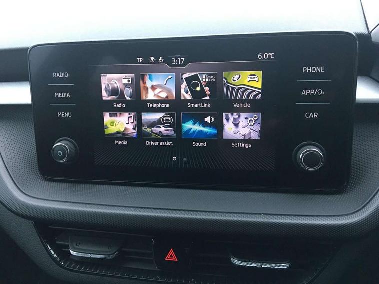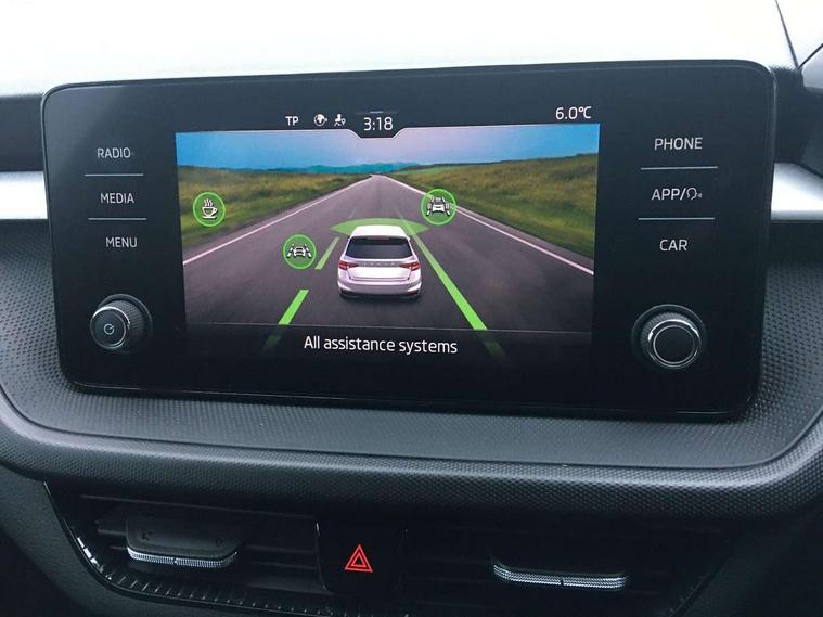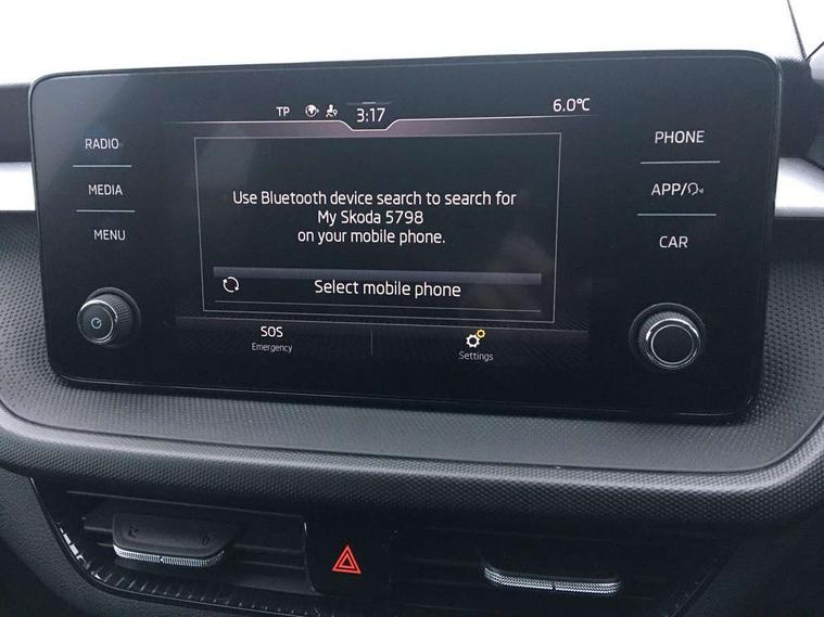Bluetooth connection, Driver alert system - DAS, Electromechanical power steering, Exterior temperature gauge, Lane assist including road edge detection, Service interval indicator, Virtual cockpit with 10.25" colour display, 2x USB-C in the front (for data transmission and charging), 6 Speakers (4 in front and 2 in rear), Auxiliary socket for external MP3 player, Bolero radio with 8" colour display, DAB digital radio reception, Basic rear lights, Body coloured bumpers, Dimming rear view mirror with black frame, Door mirror integrated indicators, Electrically adjustable and heated door mirrors, Electrically adjustable front windows with function auto up/down, Front window wiper intermittent control, Headlight range control - Automatic, Ice scraper in fuel cap, LED daytime running lights with coming and leaving home feature, Mechanical adjustable rear windows, Privacy glass, Rear LED fog light, Rear side wing doors, Rear window wiper with washing nozzles, Roof colour door mirrors, Roof mounted spoiler, SKODA tailgate lettering in chrome, Third brake light, 3 rear headrests, Backrest split and folding, Central console with fixed cup holder and storage box, Chrome handbrake release button, Fabric upholstery, Gearshift knob/handle in leather, Grain satin black interior door handles, Hand brake lever handle in leather, Height adjustable front headrests, Height adjustable steering wheel, ISOFIX and TopTether anchorage points to the outer rear seats, ISOFIX and TopTether on the front passenger seat, Luggage compartment lighting, Pollen filter, Rear seat bench unsplit, Single front passenger seat, Storm grey headlining, Sun visors with mirror and airbag label on passenger side, Ticket holder, Umbrella in drivers door, 3-point height adjustable front seats belts with pretensioner and force limiter, Automatic warning lights in case of crash, Driver and passengers airbag with switch off function, e-Call+, ESC including ABS, MSR, ASR, EDS, HBA and XDS, Front and rear seat belt warning, FRONT ASSIST (AEB City and AEB Inter Urban), Front side airbags, Head airbags, One tone horn, Pedestrian protection, Three rear 3-points safety seat belts with pretensioner and force limiter including stop function for outer rear seat belts, Tyre pressure monitoring system, Anti-theft alarm system including immobiliser, interior monitoring, backup horn, and towing protection, Anodized cross line upper decorative trim, Colour Edition air vents, Grain satin black central console cover, Grain satin black lower decorative trim, Satin black door and side trim panel in front, Anti-theft wheel bolts protection, Super-low rolling resistance tyres,
