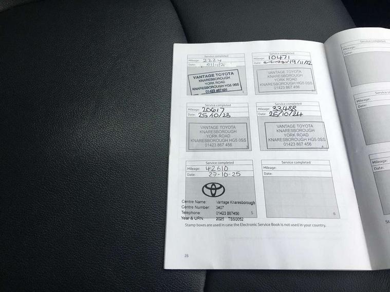 7" TFT multi information display, Analog tachometer, Apple car play and Android auto, Blind spot monitoring with rear cross traffic alert, Bluetooth system, Cyclist Detection, Drive mode selector, eCall emergency call system, ECO-driving indicator, Electric power steering, EV audible alert, Front parking sensors, Full range intelligent adaptive cruise control, Hybrid system indicator, Lane departure warning system, Lane trace assist, Lights on warning, Low screen washer fluid warning, Memory on adjustable speed limiter, My T Connected services, Night Time Pedestrian Detection, Power boot opening and closing, Push button start, Rear parking camera, Rear parking sensors, Remote boot door release in cabin, Remote boot door release in key, Road sign assist - RSA, Touch 2 Go navigation system including 3D maps and voice control, Traffic sign recognition, Trip computer, Voice control system, Vehicle Stability Control (VSC), 6 speakers, 8" Multimedia display touch screen, Auxiliary socket for external MP3 player, DAB audio, Toyota touch media system, USB connection, Adaptive automatic high beam, Automatic headlamp levelling, Automatic headlights, Automatic wipers, Automatically retractable door mirrors, Black roof rails, Body colour door handles, Body colour door mirrors, Body colour rear spoiler, Body colour roof, Body coloured bumpers, Body coloured Shark-fin antenna, Door mirror puddle lights, Dual exhaust pipes, Electric adjustable door mirrors, Electrochromatic rear view mirror, Emergency brake-light signal (EBS), Follow me home headlights, Front fog lights, Front wiper de-icer, Headlight cleaners, Heated door mirrors, LED daytime running lights, LED High mounted stop lamp, LED rear combination lights, Meshed upper front grille, Power front windows, Power rear windows, Privacy glass, Projector LED headlights, Rear screen wiper - intermittent, Rear windscreen defogger, Silver front under-run, Silver rear under-run, Trailer Sway Control, Turning signal integrated indicators in door mirrors, 3 rear headrests, 60/40 split fold rear seat back, Boot light, Clean air filter, Driver and front passenger personal light, Driver and front passenger Whiplash Injury Lessening seats, Driver and passenger sunvisors with illuminated vanity mirrors, Driver seat memory function, Dual sided deck board in boot, Dual zone automatic air conditioning, Floor mats, Folding rear centre armrest, Front and rear bottle holders, Front centre armrest, Front footwell lights, Front headrests, Front seat and rear pockets, Front/rear roof mounted assist grips, Grey roof lining, Heated driver and front passenger seats, Heated steering wheel, Illuminated entry system, Isofix child seat preparation, Leather gear shift with chrome surround, Leather upholstery, Light blue ambient lighting on front cupholders and open tray, Manual telescopic and tilt 3-spoke leather steering wheel with Chrome insert, Manually reclining and sliding front passenger seat, Multimedia switches on steering wheel, Pollen filter, Power height-adjustable sliding reclining and lumbar support for driver seat, Rear coat hooks, Rear door armrests, Rear passenger air vents, Rear view display in display audio screen with dynamic guide lines, Reclining rear seats, Satin chrome interior door handles, Sunglasses holder, Telephone and voice recognition switches on steering wheel, 3x3 point rear seatbelts, ABS/EBD, Acoustic vehicle alerting system, Adjustable front driver and passenger seat belt extender, Brake assist function, Brake hold function, Child proof door locks, Collision mitigation braking system, Driver/Front Passenger airbags, Driver/front passenger side airbags, Drivers knee airbag, Electronic parking brake, Electronic Stability Programme (ESP), Front and rear curtain airbags, Front and rear seatbelt reminder, Front passenger airbag detector, Hill start assist, Passenger airbag cut-off device, Pedestrian detection, Pre collision system, Seatbelt pretensioners with load limiters, Toyota safety sense, Traction control, Tyre pressure warning, Glass-breaking alarm sensors, Immobiliser, Intrusion alarm, Light - on and Key in reminder, Motion sensor alarm, Remote central locking, Smart entry + Smart start, Speed sensitive auto door locking, Tilt detection sensors, Piano black centre console with silver insert, Soft-touch black lower dashboard, Soft-touch black upper dashboard with silver insert, 19" 5 spoke silver alloy wheels, Full size spare wheel,