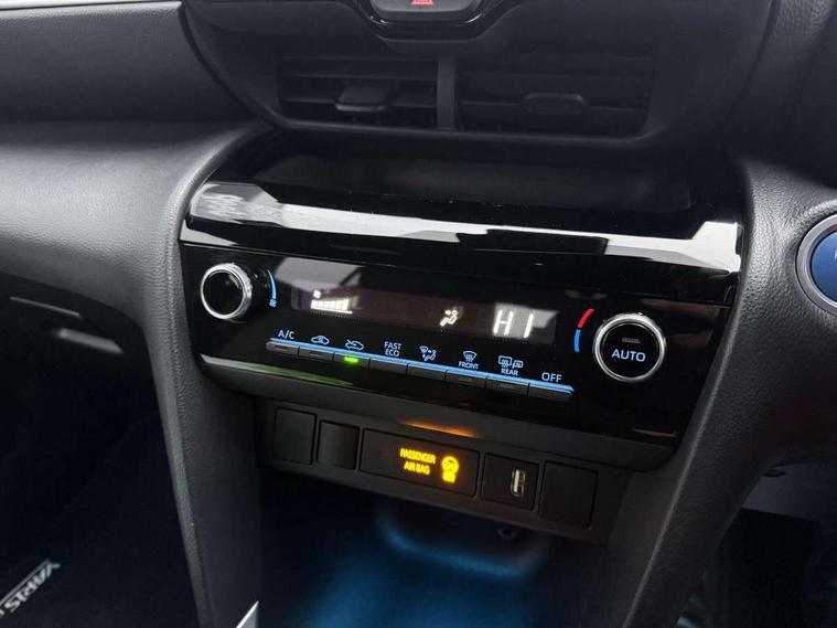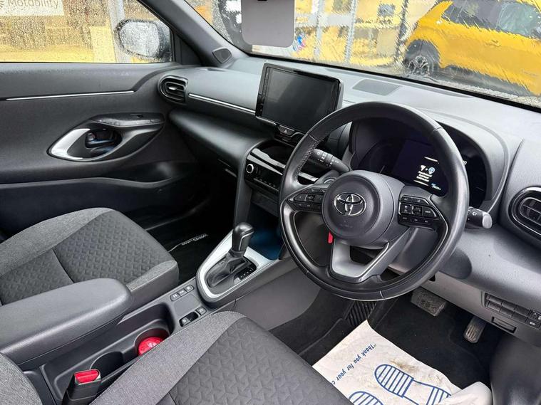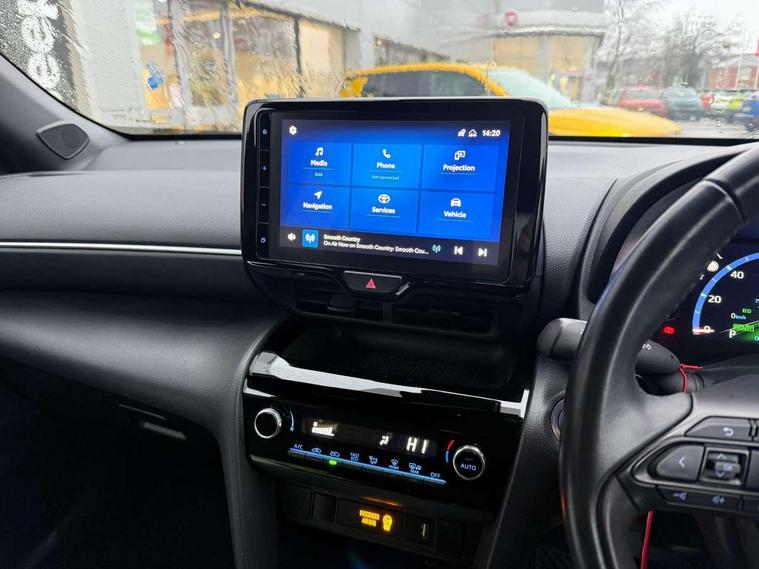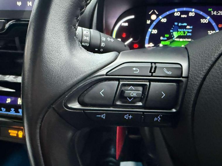 7" Multi information display screen, 8" Toyota touch 2 multimedia system with Smartphone integration with Apple CarPlay and Android auto, Adjustable speed limiter, Bluetooth connectivity, Driver attention alert system, eCall emergency system, Electric power steering, Full range intelligent adaptive cruise control, Hybrid system indicator, Key reminder warning, Lane trace assist, Multimedia, audio, telephone and voice recognition switches on steering wheel, My T Connected services, Pre-collision system enhanced with emergency steering assist, Reversing camera, Road sign assist - RSA, Steering assisted vehicle stability control, 6 speakers, DAB Digital radio, USB connection, 3rd brake light, Acoustic windscreen glass, Aluminium roof rails, Anti-jam protection on power windows, Auto high beam [AHB] with on/off switch, Automatic headlights, Black lower front grille, Black Shark-fin antenna, Black upper front grille, Black wheel arch mouldings, Body colour door handles, Body colour front bumper, Body colour rear bumper, Electric adjustable heated door mirrors, Follow me home headlights, Front and rear electric windows with auto up/down function, Front intermittent wipers, Headlight cut off reminder, Indicators integrated on door mirrors, Intermittent rear wiper, LED daytime running lights guide, LED front fog lights, LED front light guide, LED Indicators, LED projector headlights, LED rear light guide, Manual headlight levelling, Manually retractable door mirrors, Noise reduction layer on windscreen, Privacy glass, Rain sensor, Rear LED lights with sequential indicators, Rear side wing doors, Rear spoiler, Rear window defogger, 12v power outlet - front, 2x Rear coat hooks, 3 seat bench in 2nd row, 3 spoke leather steering wheel, 40:20:40 split folding rear bench seat, Adjustable speed limiter switch on steering wheel, Auto air conditioning, Black roof lining, Boot light, Central armrest, Centre console in light blue ambent lighting, Driver and front passenger personal lights, Fabric door trim, Fabric upholstery, Footwell in light blue ambient lighting, Front console box, Front cup holders, Front head restraints, Glovebox, Height adjustable driver's seat, Height adjustable front passenger seat, Hooks for luggage holding belts, ISOFIX child restraint system, Lane departure alert switch on steering control, Leather gearshift, Light blue ambient lighting on front doors, Manual telescopic and tilting steering wheel, Mirror on driver and passenger sun visor, Pollen air filter, Rear cup holders, Rear head restraints, Single front passenger seat, Soft tonneau cover, 3x3 point rear seat belts, ABS+EBD+Brake assist, Driver and passenger central airbags, Driver and passenger front airbags, Driver and passenger side airbags, Electronic parking brake, Emergency brake light system (EBS), Front seat belt reminder, Hill start assist control (HAC), Passenger airbag on/off switch, Pre-collision system with pedestrian and cyclist detection, Rear door child safety locks, Rear passenger side airbags, Rear seat belt reminder, Traction control, Tyre pressure warning system, Immobiliser, Intrusion alarm, Keyless smart entry with push button start, Power door locks, Power passenger window lock, Remote door lock, Tyre repair kit,