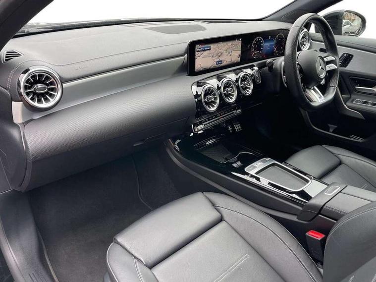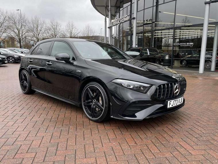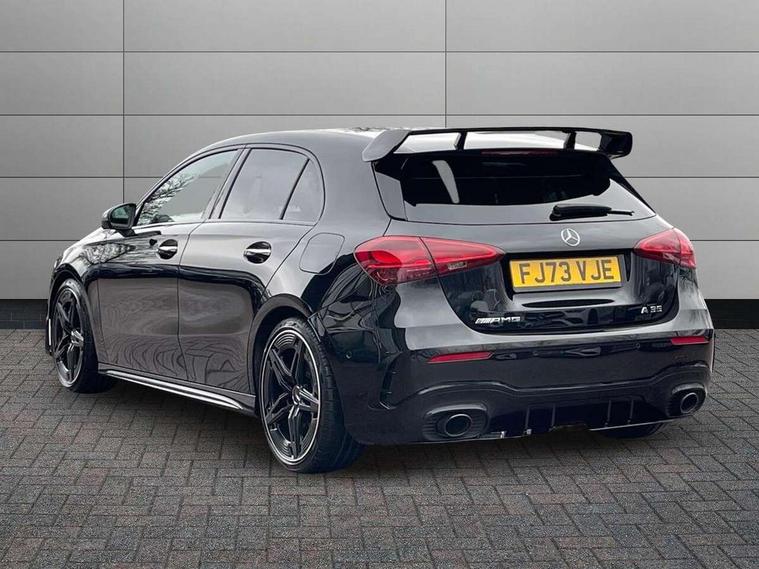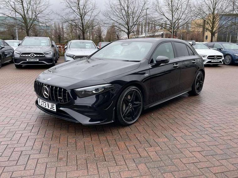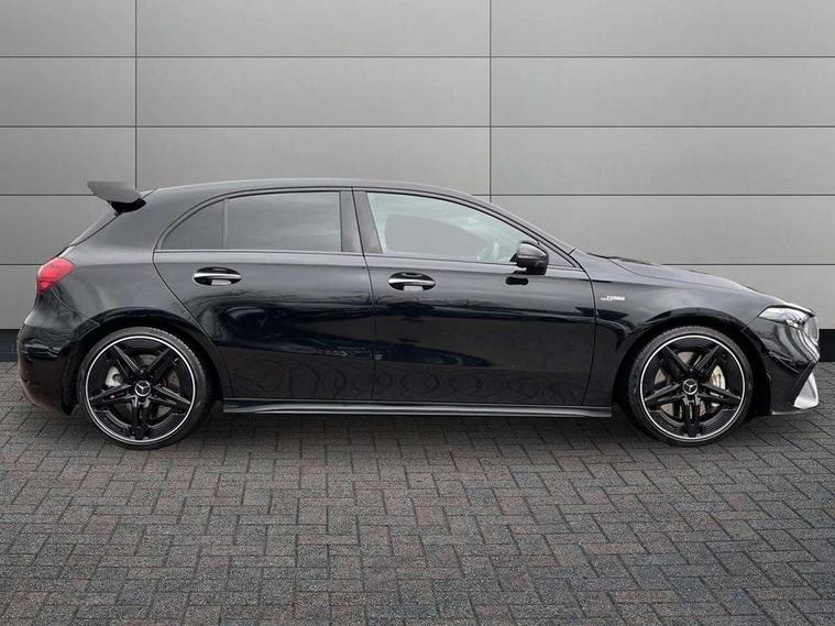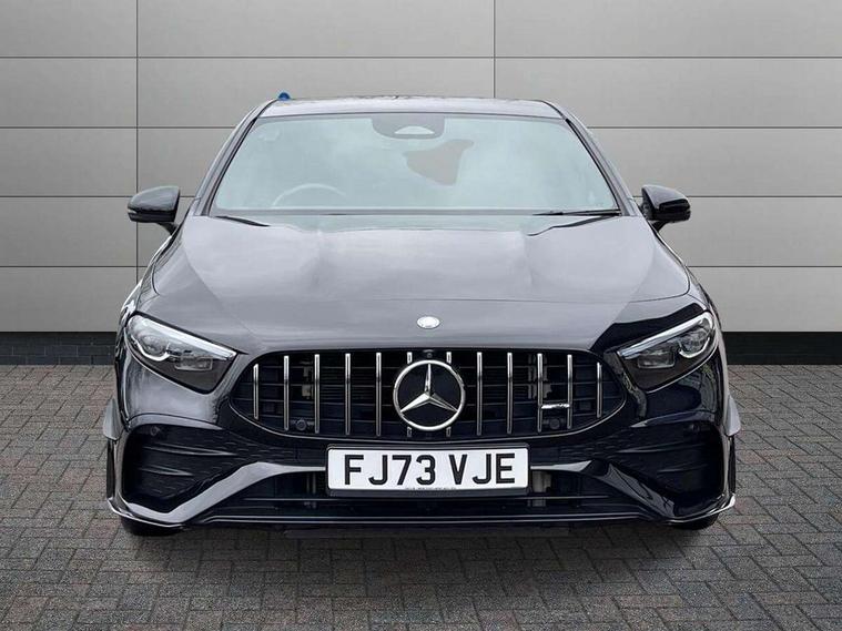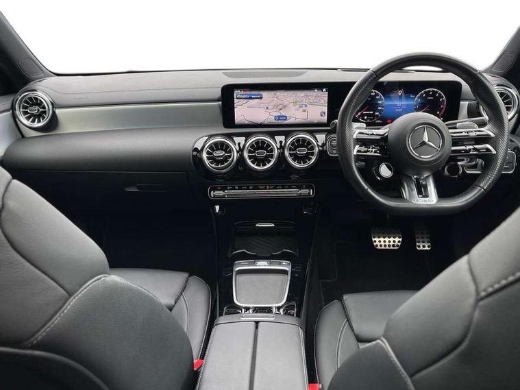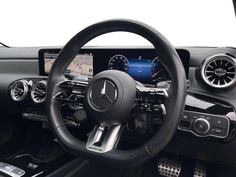 10.25 inch touchscreen central media display, 10.25" Digital instrument cluster display screen, Attention assist, Brake pad wear indicator warning light, Car wash mode, Cruise control + speed limiter, Direct steering, Direction indicators with lane change function, Dual bluetooth interfaces, DYNAMIC SELECT with driving programs (Slippery, Comfort, Sport, Sport+ and Individual), Easy pack tailgate hands-free access, ECO start/stop function, Engine start/stop button, Fluid level warning indicator for fuel, oil, coolant and washer fluid, Hard-disk navigation, Head up Display, Hey Mercedes Voice activation, Lamp failure indicator, MBUX augmented reality for navigation, MBUX Interior assistant, Mercedes me connect including emergency call system, accident recovery, breakdown and maintenance management, Mercedes me remote services, Outside temperature gauge, Owners manual in English, Pre-installation of private car share, Preinstallation for Mercedes Benz link, Remote boot closing, Service indicator (ASSYST), Smartphone integration with Apple CarPlay and Android auto, Speed sensitive power steering, Trip computer in multifunction display with current consumption indicator, Wireless charging, AMG suspension, Suspension with adaptive damping system, DAB Digital radio, MBUX multimedia system, Mercedes Benz advanced sound system (225 W) with 10 speakers, 1 central speaker, speakers on doors, a tweeter on door, one sub woofer + boost amplifier, 4 Electric Front and Rear windows, Adaptive brake lights, AMG body styling - AMG front apron with front splitter and AMG rear apron and visible exhaust tailpipe trim elements, AMG Front apron with flics as air deflector elements on the outer air intakes, AMG radiator grille with twin blade lamella and AMG Lettering, AMG Rear apron with specific diffuser look with four vertical fins and two round chrome plated tailpipe trim elements with a diameter of 90 mm, AMG spoiler lip on roof, Beltline strips in High gloss Black, Body colour bumpers, Body colour door handles with chrome inserts, Body colour side skirt, Electric adjustable and heated door mirrors with integrated LED side indicators, Front splitter and trim elements on the louvres in the outer air inlets, Front wings wheel arches with TURBO 4MATIC lettering, Headlamp assist automatic headlamp activation, Heat insulating dark tinted rear and rear side windows, Heated glass rear windscreen + timer control, LED daytime running lights, LED High level third brake light, LED tail lamp, Multibeam LED headlamps with adaptive highbeam assist and cornering function, Panoramic sliding sunroof, Privacy glass, Radio aerial, Rain sensing windscreen wipers with two sensitivity settings, Rear fog lights, Rear side wing doors, Rear windscreen wiper, Wider wheel arches for AMG wheels, Window line trim strip in black, 3 seat bench in 2nd row, 40:20:40 split folding rear seats, AMG floor mats, AMG Performance steering wheel in nappa leather, Automatic child seat recognition sensor, Black air vents with surround in silver chrome, Black roof lining, Brushed stainless steel sports pedals with rubber studs, Electrically adjustable front memory seats including lumbar support and backrest inclination, Front centre armrest with stowage, Front seat backs luggage nets, Heated front seats, Height/reach adjustable steering column, Illuminated AMG front door sills with changeable cover, Interior lighting - 64 colour Ambient lighting, Interior mirror with reading lamps in black and frameless, Rear armrest with 2 cupholders, Seat occupancy sensor for front passenger seat, Silver coloured aluminium gear shift paddles on steering wheel, Single front passenger seat, Sports seats with integrated headrests, Stowage compartment in centre console with retractable cover, Sunvisors with illuminated vanity mirrors, Twin front cupholders, Two zone thermotronic luxury automatic climate control, Aerodynamic pack - A Class, AMG night pack - A Class, Light and sight pack - A Class, Mirror package - A Class, Parking pack with 360 degree camera - A Class, Seat comfort pack - A Class, USB pack plus - A Class, 3 rear 3 point seatbelts, ABS with Brake Assist, Active bonnet, Adaptive brake assist with hold function and hill start assist, Black seatbelts, Bonnet with power domes, Childproof locks manually operated for rear doors and electrically operated for rear power windows, Crash responsive emergency lighting, Driver and passenger head and side airbags, Drivers knee airbag, Dual stage driver/passenger airbags, Electronic parking brake, ESP curve dynamic assist, ESP with ASR, Exit warning, Front and rear seatbelt reminder, Front brake calipers with AMG lettering, ISOFIX and top tether child seat fixing points in two outer rear seats, Tyre pressure monitoring system, Warning triangle and first aid kit, Window airbags, Alarm system/interior protection/immobiliser, Guard 360 degree vehicle protection, Keyless entry lock/unlock, Keyless Go, Remote central locking and crash sensor with emergency opening function, Light longitudinal grain aluminium trim, 19" AMG 5 twin spoke light alloy wheels aerodynamically optimised painted in matt black with high sheen rim flange, Summer tyres, Tirefit sealant kit,