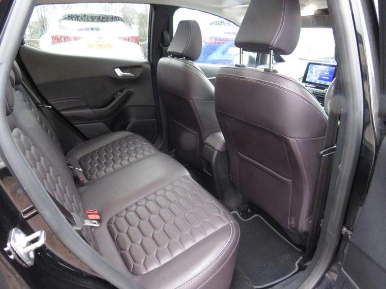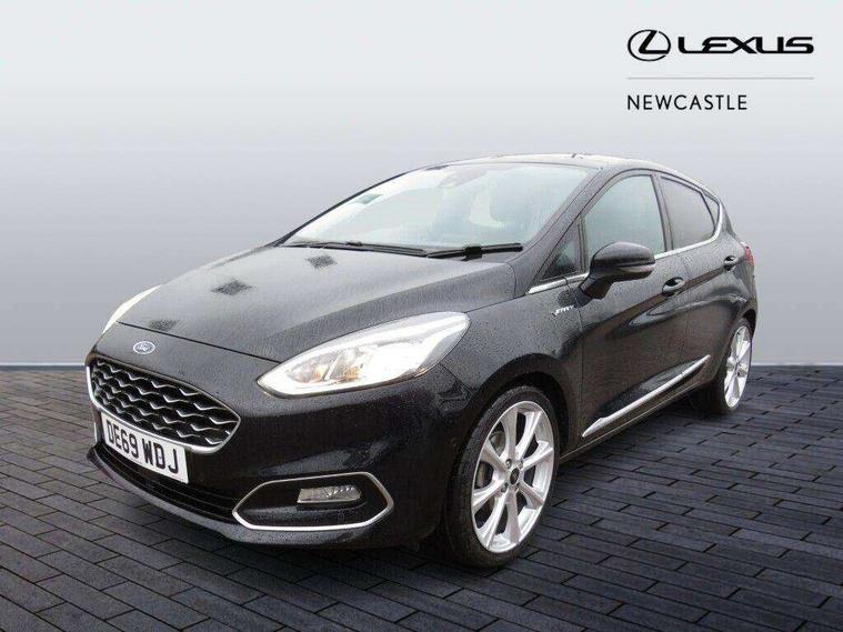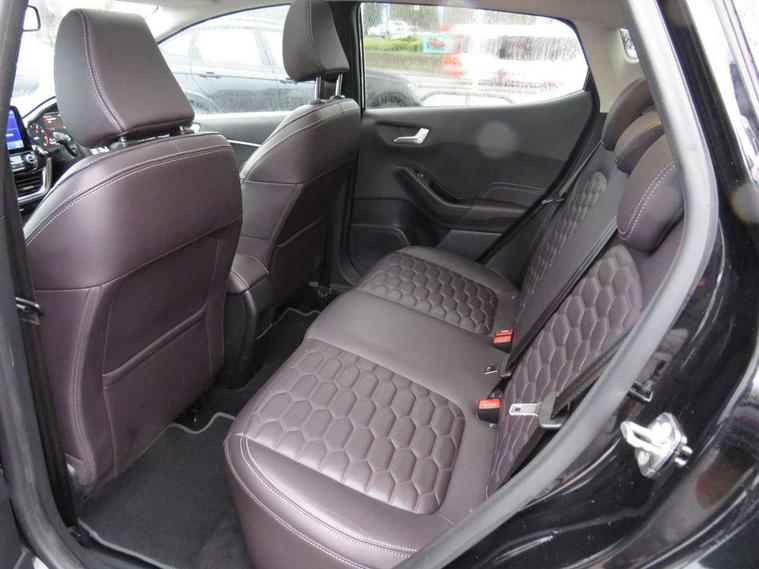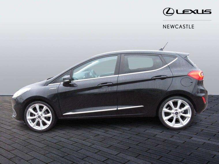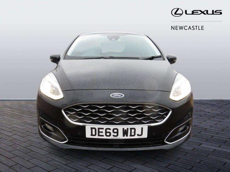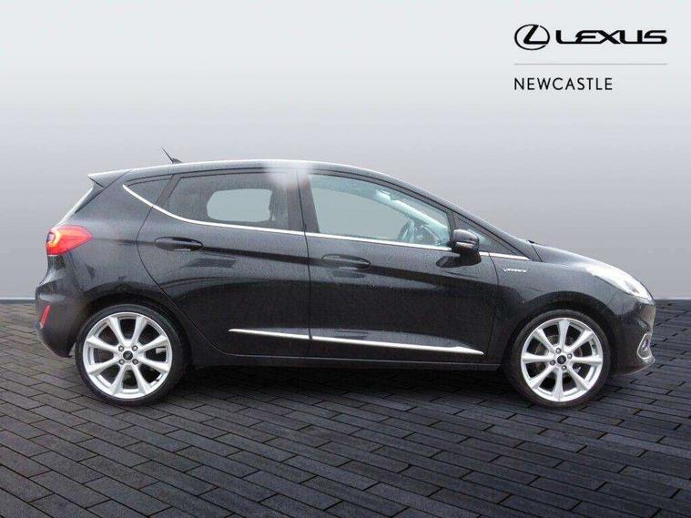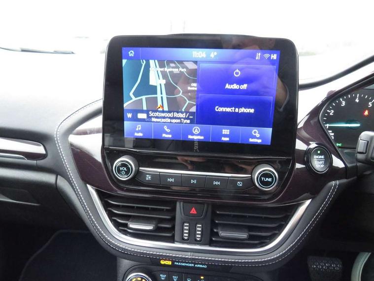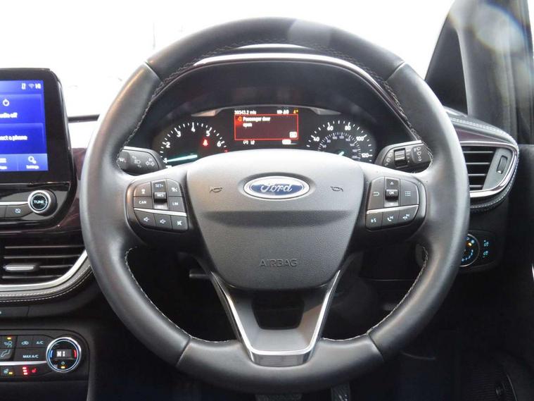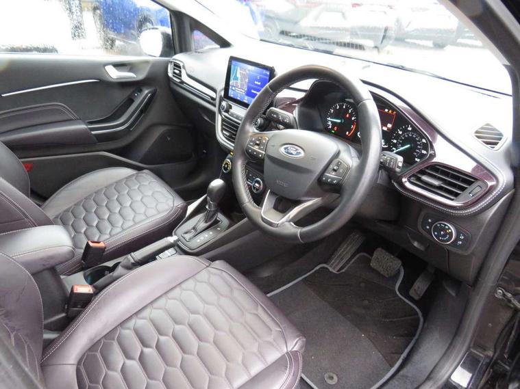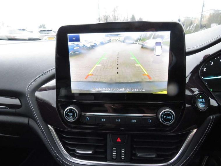 Bluetooth system, Electric power steering, Ford easy fuel, Trip computer, 2 USB ports, Auxiliary input socket, B&O Premium audio system with 8" touchscreen, 10 speakers, 360 degree sound system, Ford SYNC 3 navigation system and Ford pass connect, DAB Digital radio, Steering wheel mounted controls, Auto dimming rear view mirror, Body colour bumpers, Body colour door handles, Body colour electric adjustable heated door mirrors with integral indicators, Body colour rear spoiler, Chrome beltline trim, Chrome door handles, Chrome lower window surround, Cornering front fog lights, Electric front windows/one touch facility, Electric rear windows, LED Night signature to rear lights, LED rear lights, Openable panorama roof, Power foldable door mirrors with puddle lights, Privacy glass, Quickclear heated windscreen, Rain sensing wipers and auto dimming rear view mirror, Rear privacy glass, Rear wiper, Tinted glass, Unique Vignale front grille & bodystyling, Vignale front door threshold plates, Vignale rear & wing badges, 12V Accessory socket in centre console, 3 spoke leather trimmed steering wheel with audio control, 60/40 split folding rear seat, Adjustable head restraints, Air conditioning + Electric Auto Temperature Control (EATC), Ambient lighting, Boot carpet, Centre console with armrest and illuminated cupholders, Chrome inner door handles, Drivers and Passenger lumbar support, Footwell illumination, Front map reading lights, Front seat and rear pockets, Front/rear floor mats, Illuminated glovebox, Leather gear knob, Leather trimmed handbrake handle, Leather upholstery, Load area light, Luxury woven headliner, Overhead console with sunglasses holder, Pollen filter, Rake/reach adjustable steering wheel, Rear centre head restraint, Comfort Pack - Fiesta, NCAP Pack - Fiesta, Rear view camera pack - Fiesta, 3 point seatbelts on all rear seats, ABS+EBA, Curtain airbags, Driver and passenger airbags, Drivers knee airbag, Electronic stability control with hill start assist, Front passenger airbag deactivation, Front side airbags, Seatbelt warning, Tyre pressure monitoring system, Ford keyfree system with Keyless entry and keyless start with two remote keys, MyKey system, Remote central locking & engine immobiliser, Thatcham Cat.1 alarm, Tyre repair kit,