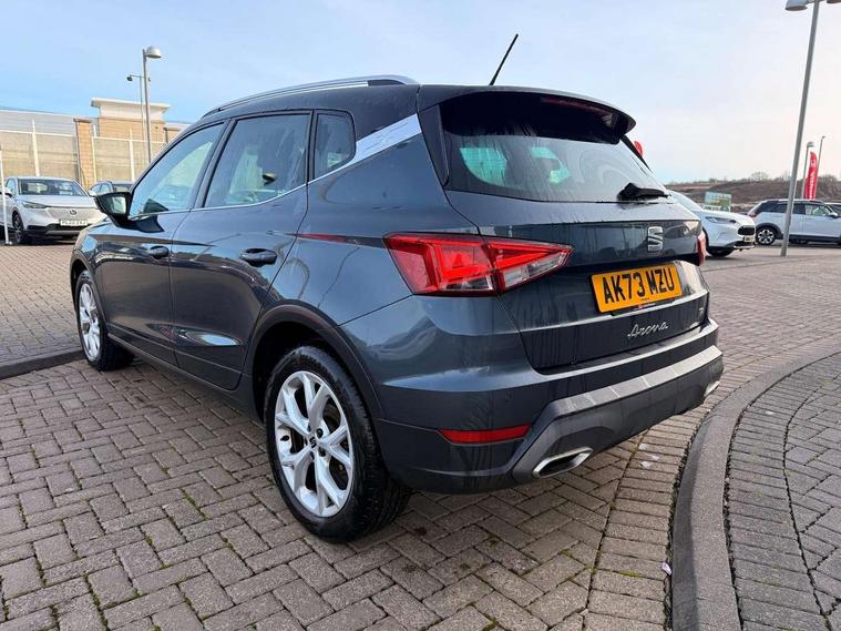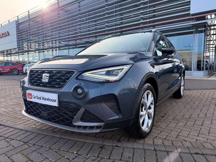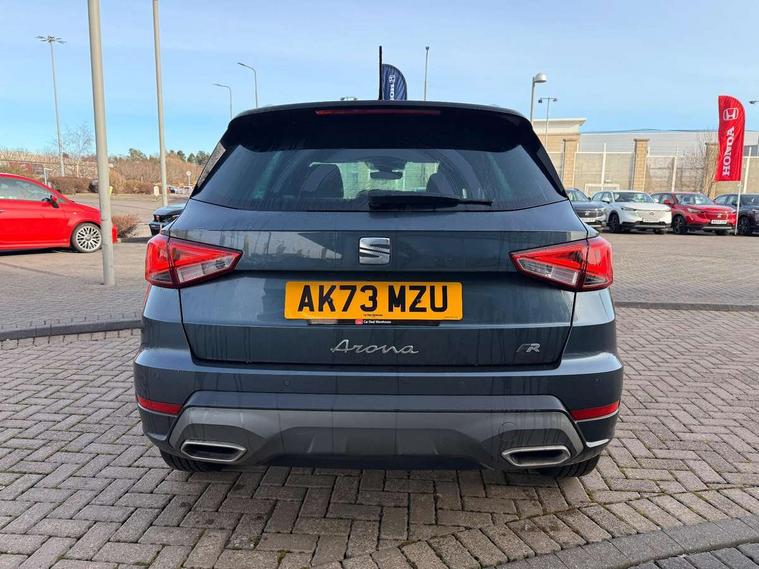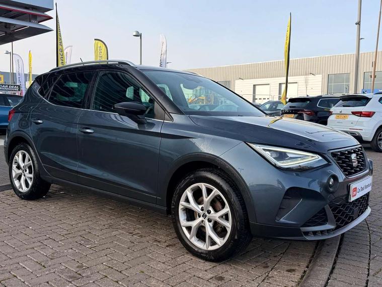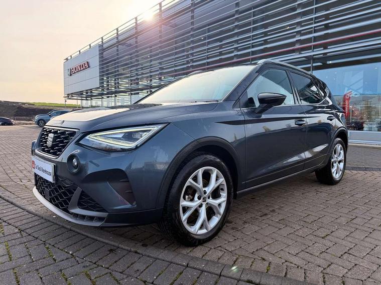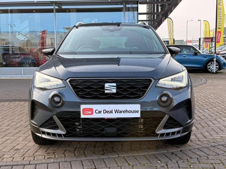 'Lights On' Reminder warning buzzer, 8" Digital cockpit, Digital clock, E-call, Electric speed sensitive power steering, Full Link Smartphone Integration with Mirror Link, Apple Car Play, Google Android Auto with USB Type C cable for Apple and Android compatibility, Lane keeping system, Low fuel warning light, Outside temperature display, Rear parking sensor, RPM counter, Seat connect with safety, service, remote and online, SEAT Drive profile - Four different models normal-sport-eco-individual, steering response, throttle response, Trip computer, Wireless phone charger, 9.2" colour touchscreen with navigation system, voice control and USB port (type c), Bluetooth interface for hands free and audio streaming, DAB digital radio and AM/FM radio, Steering wheel mounted audio controls, Anti theft roof antenna, Auto dimming interior rear view mirror, Automatic activation of hazard warning lights, Body coloured bumpers, Body coloured door handle inserts, Chrome roof rails and window surrounds, Dark tinted rear windows, Electric front/rear windows, Electrically adjustable, heated and folding door mirrors, Front fog lights with cornering function and rear fog light, FULL LED automatic headlights with dynamic headlight range control, coming and leaving home, LED daytime running lights, LED rear tail lights and licence plate lights, Protective side mouldings, Rain sensing wipers, Rear side wing doors, Rear spoiler, Rear window wash/wipe, Roof colour door mirrors, Third brake light, Twin exhaust pipe styling hidden exhaust pipe, Visible VIN plate, Windshield wiper with intermittent control and potentiometer, 2 cupholders, 3 seat bench in 2nd row, 60/40 split folding rear seat, Aircare filter, Black interior roof, Cloth upholstery, Double boot floor, Driver sunvisor with covered mirror + card holder, Dual zone climate control, Front courtesy light with front reading lights, Front sport seats, Gear shift indicator, Height adjustable front seats, Height/reach adjustable steering column, Illuminated boot, Instrument lighting with brightness control, Interior ambient lighting, Interior light in footwell, central console and door panel, ISOFIX points in outer rear seats with top tether anchorage points, Passenger sunvisor with vanity mirror, Perforated flat bottomed leather steering wheel/gear knob/handbrake with red stitching and FR logo, Single front passenger seat, Two front and three rear height adjustable headrests, Interior chrome pack - Arona, 3 point seatbelts on all rear seats, ABS, Active front headrests, Child locks on rear doors, Driver and front passenger airbags with front passenger airbag de activation, front side and curtain airbags, Electronic stability control, Emergency Brake Assist (EBA) and front assist, Front and rear seatbelt reminder, Hill hold control, Multi-Collision braking, Tiredness recognition system, Traction control, Tyre pressure monitoring system, Alarm with back-up horn, Electronic engine immobiliser, Locking wheel bolts, Remote central locking + deadlocks, Tow away protection, Titan black dashboard, 17" Dynamic alloy wheels,