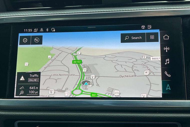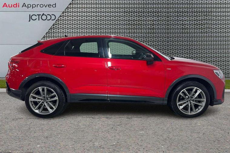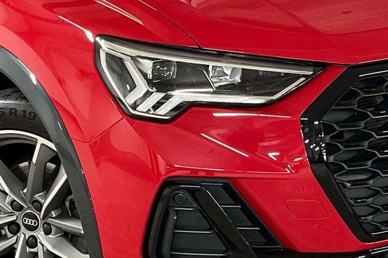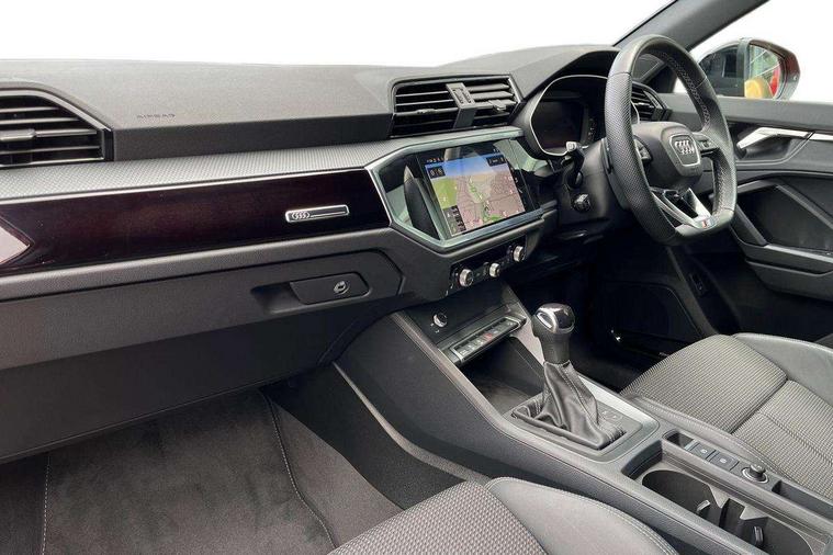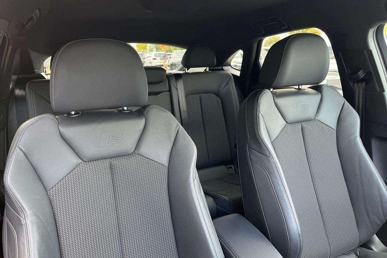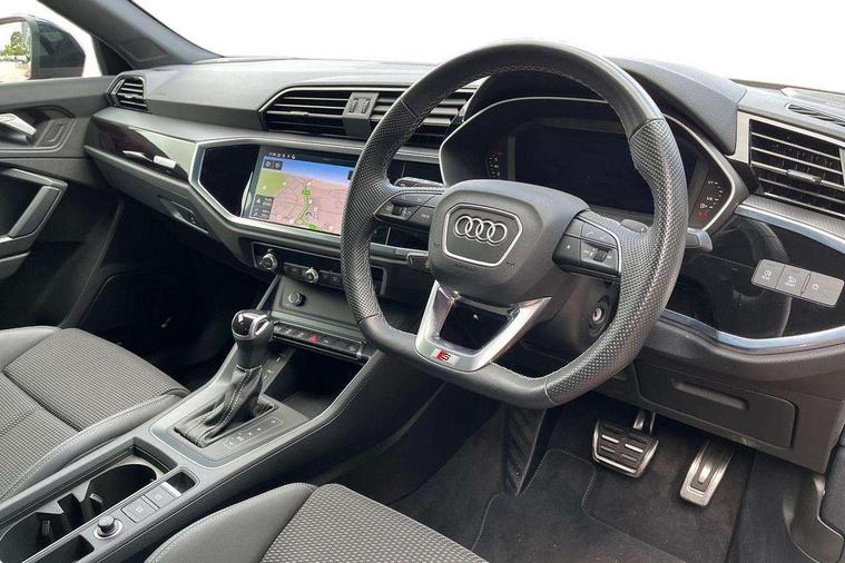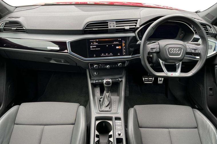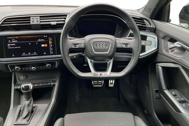 360 degree camera, Audi drive select, Audi lane departure warning, Audi Virtual Cockpit - 10.25" display, Bluetooth interface, Camera based traffic sign recognition, Legal emergency call, MMI Navigation Plus with high resolution 10.1 inch touchscreen colour display, Phonebox light with wireless charging, Power operated tailgate, Progressive steering, Service interval indicator, Smartphone interface includes wireless Apple carplay/Android Auto, Start stop system with recuperation, Voice control system with natural language interaction, Sports suspension, 2 USB-C ports with charge and data functions, DAB digital radio module, SONOS premium sound system, Acoustic windscreen, Audi Beam uses LEDs to project the Audi logo onto the ground as you exit your Q3, Auto dimming door mirrors, Auto dimming frameless rear view mirror, Diffuser grille in grained matt black, Diffuser trim in selenite silver, Electrically folding, adjustable and heated door mirrors with integrated LED side indicators and kerb view function for passenger side, Front and rear electric windows, Front fog lights, Front underbody protection in manhattan grey paint finish, High gloss black finish B and C pillars, LED Dynamic rear indicators, LED rear lights, LED third brake light, Matrix LED headlights with LED daytime running lights, Panoramic glass sunroof, Privacy glass dark tinted rear and rear-side windows (from B-pillar backwards), Rain and light sensors, Rear side wing doors, Rear underbody protection in matt black, Rear wiper, S line front and rear bumpers and side skirts in contrasting Manhattan grey paint finish, Variable front intermittent wipers, 12V socket in rear centre console, 3 seat bench in 2nd row, 40:20:40 folding with manual adjustment for 60:40 forwards/backwards position and backrest angle, Adjustable rear seat bench/backrest with centre armrest and cupholder, Black cloth headlining, Dual zone electronic climate control, Electric lumbar support, Electrically adjustable front seats, Front and rear black floor mats with contrast stitching, Front and rear headrests, Front centre armrest, Heated front seats, Height and reach adjustable steering wheel, Illuminated door sill trims with S logo, ISOFIX child seat mounting for front passenger with airbag deactivation and outer rear seat including top tether attachment point for outer rear seats, Luggage compartment sill protection in stainless steel, Perforated leather gearknob, Single front passenger seat, Stainless steel pedals, Twin leather upholstery with front sport seats + S embossing, Black styling pack - Q3, Non smoking pack - Q3, 3x3 point rear seatbelts, 6 airbags - Driver, front passenger, curtain and side windows, Audi pre-sense front with pedestrain and cyclist recognition, Electrically operated child locks on rear doors, Electromechanical parking brake, Electronic stabilisation control including ABS, ASR and EDL, Front seatbelt reminder, Hill descent control, Hill hold assist, Pre sense basic, Seatbelt monitoring, Tyre pressure warning, Warning triangle and first aid kit, Advanced key, Anti theft alarm, Anti theft wheel bolts, Immobiliser, Remote central locking, Aluminium look interior elements, Detail dashboard around MMI touch colour display in glass look, black with surround in aluminium look, Leatherette door armrest, Piano black inlay,