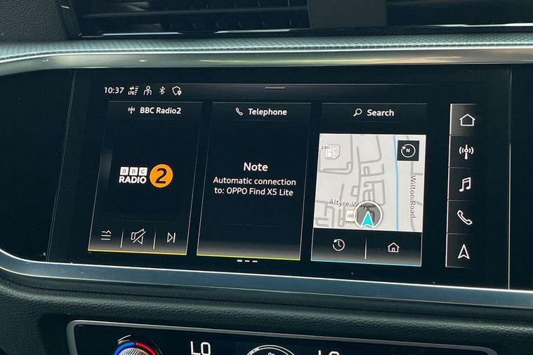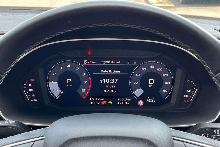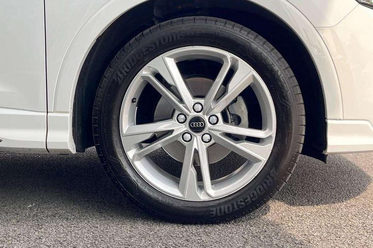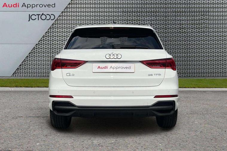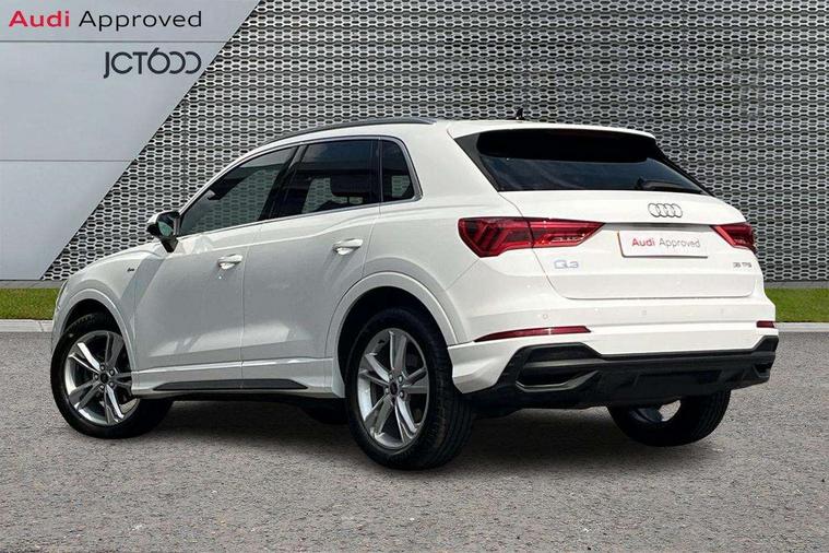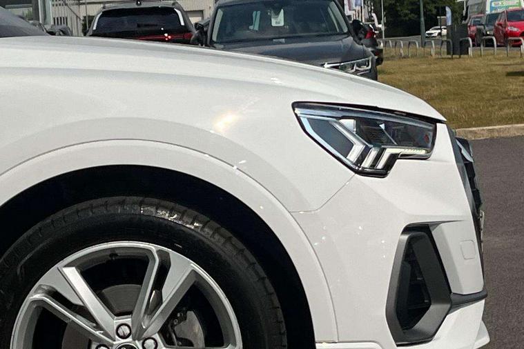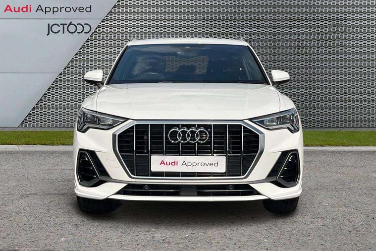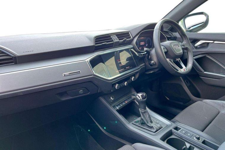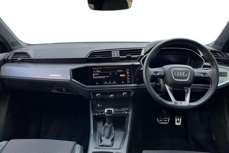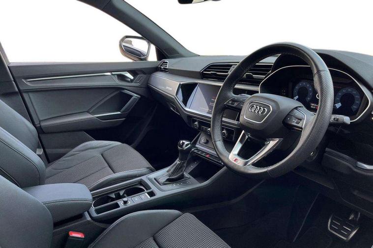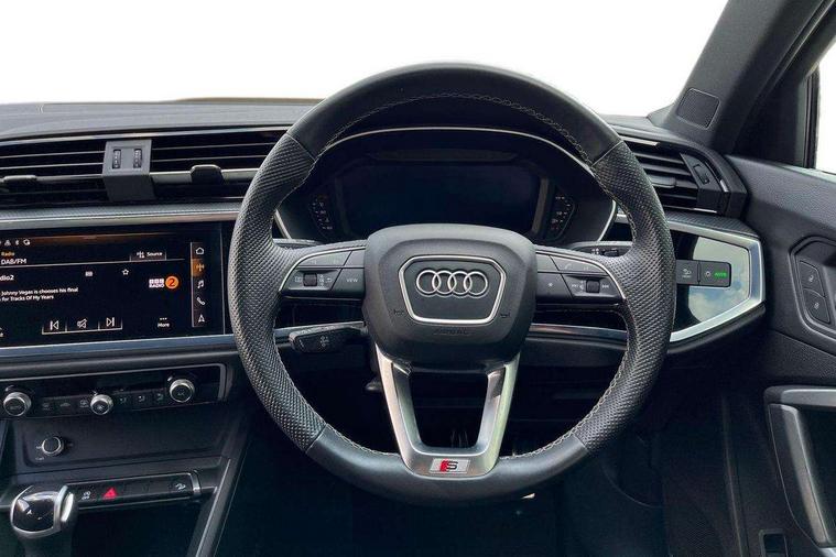 Amazon alexa Integration, Audi drive select, Audi lane departure warning, Audi smartphone interface includes wireless Apple carplay/Android Auto, Audi Virtual Cockpit - 10.25" display, Bluetooth interface, Camera based traffic sign recognition, Legal emergency call, MMI Navigation Plus with high resolution 10.1 inch touchscreen colour display, Power operated tailgate, Progressive steering, Service interval indicator, Start stop system with recuperation, Voice control system with natural language interaction, Sports suspension, 2 USB-C ports with charge and data functions, 6 passive loudspeakers, DAB digital radio module, Acoustic windscreen, Aluminium roof rails, Aluminium window trim, Anthracite black radiator grille, Auto dimming frameless rear view mirror, Body colour front spoiler blade, Body coloured bumpers, Electrically folding, adjustable and heated door mirrors with integrated LED side indicators and kerb view function for passenger side, Front and rear electric windows, Front fog lights, Front side air inlets in matt platinum grey, Grille vertical bars in aluminium silver/Matt, High gloss black finish B and C pillars, LED Dynamic rear indicators, LED headlights with LED daytime running lights, LED rear lights, LED third brake light, Privacy glass dark tinted rear and rear-side windows (from B-pillar backwards), Rain and light sensors, Rear diffuser grille in grained matt black, Rear diffuser strip in matt anthracite black, Rear side wing doors, Rear wiper, S line badges on front wings, S Line front and rear bumpers, Side skirt insert in matt Platinium grey, Variable front intermittent wipers, 12V socket in rear centre console, 3 seat bench in 2nd row, 3 spoke leather multifunction steering wheel features S badging and grips in perforated leather with contrast stitching, 40:20:40 folding with manual adjustment for 60:40 forwards/backwards position and backrest angle, Adjustable rear seat bench/backrest with centre armrest and cupholder, Black cloth headlining, Dual zone electronic climate control, Front and rear black floor mats with contrast stitching in rock grey, Front and rear headrests, Front and rear roof module including reading lights, Front centre armrest, Glove compartment lighting, Height and reach adjustable steering wheel, Illuminated door sill trims with S logo, ISOFIX child seat mounting for front passenger with airbag deactivation and outer rear seat including top tether attachment point for outer rear seats, Luggage compartment light, Manual front seats with height adjustment, Perforated leather gearknob, Single front passenger seat, Stainless steel luggage compartment sill finisher, Stainless steel pedals, Ambient lighting pack - Q3, Non smoking pack - Q3, 3x3 point rear seatbelts, 6 airbags - Driver, front passenger, curtain and side windows, Audi pre-sense front with pedestrain and cyclist recognition, Electrically operated child locks on rear doors, Electromechanical parking brake, Electronic stabilisation control including ABS, ASR and EDL, Front seatbelt reminder, Hill descent control, Hill hold assist, Pre sense basic, Seatbelt monitoring, Tyre pressure warning, Warning triangle and first aid kit, Anti theft alarm, Anti theft wheel bolts, Immobiliser, Remote central locking, Aluminium look interior elements, Dark matt brushed aluminium inlay, Detail dashboard around MMI touch colour display in glass look, black with surround in aluminium look, Leatherette door armrest,
