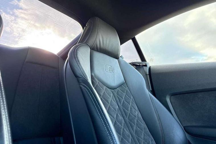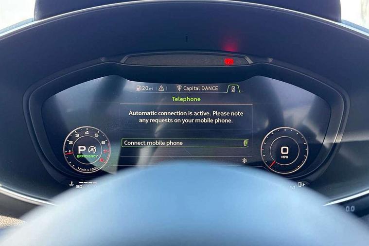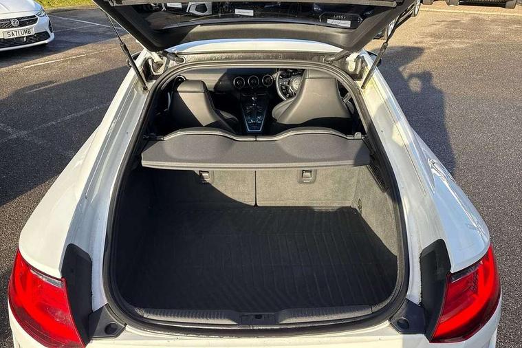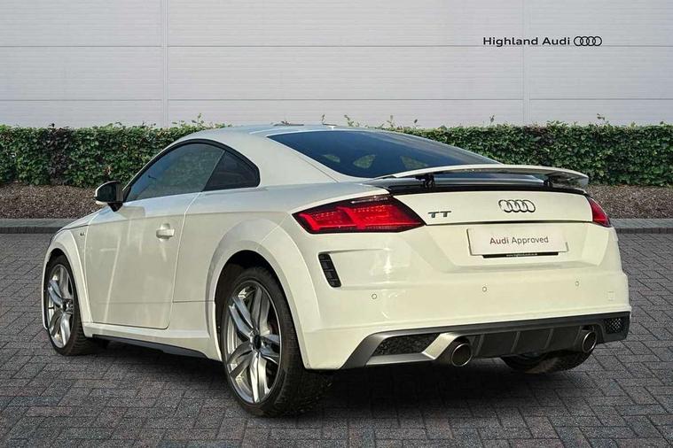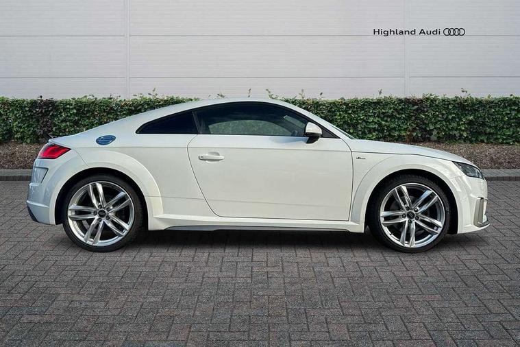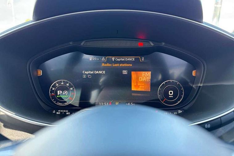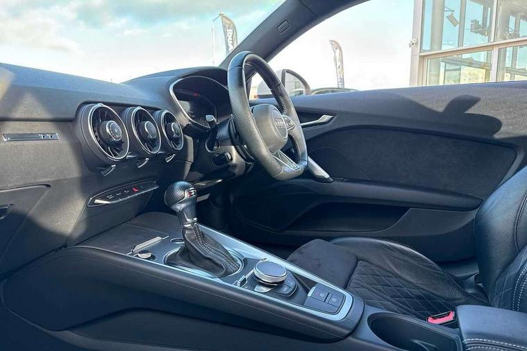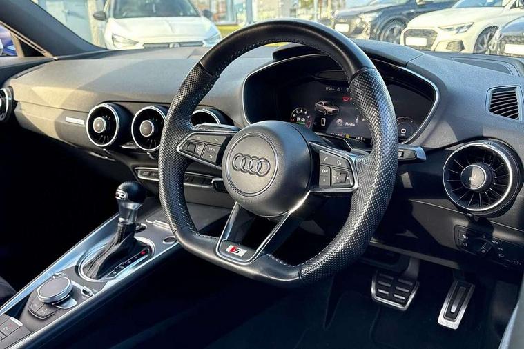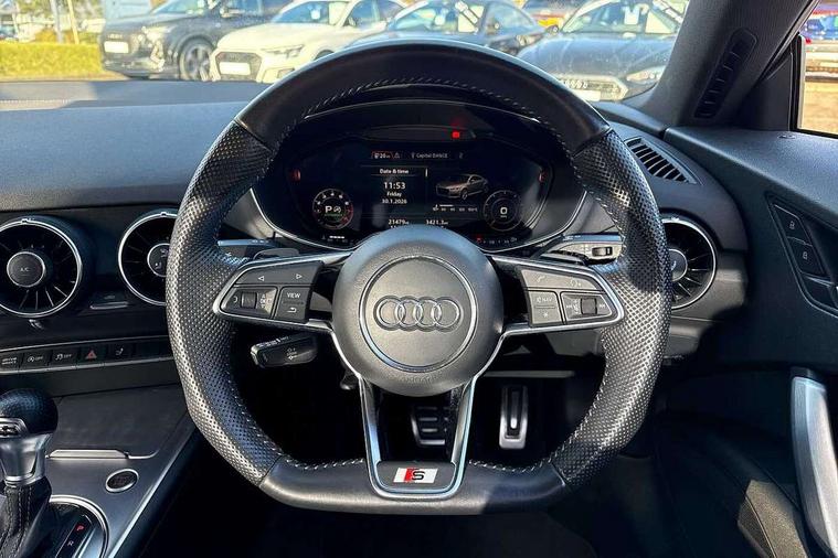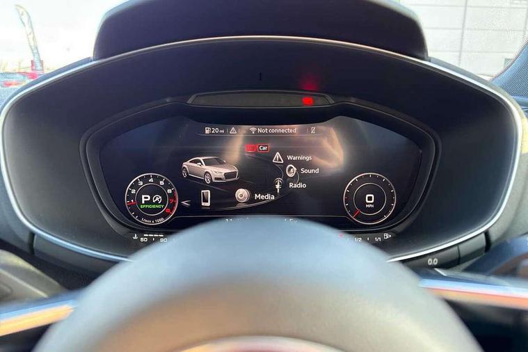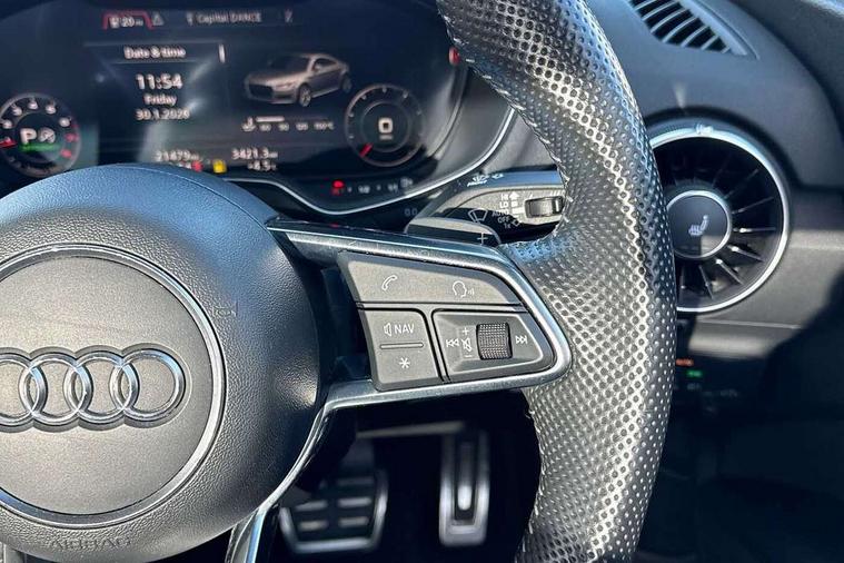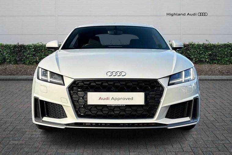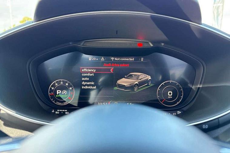 Audi drive select with 4 Pre configured modes, Audi virtual cockpit - 12.3" high-resolution LCD display with fully customisable instrument cluster, Cruise control + speed limiter, MMI touch panel, Mobile phone preparation with bluetooth interface, Progressive power assisted steering, Rear parking sensors, Service interval indicator, Start/Stop system with energy recuperation, TP memo, 8 Speakers, AM/FM radio, Audi music interface, Bluetooth audio streaming, DAB Digital radio, MMI Radio with CD player and SD/XC card slot, Auto dimming rear view mirror, Auto headlight range control, Body colour bumpers, Dynamic rear indicators, Electric front windows, Front fog lights, Green tinted heat insulating glass, Headlight wash system, High gloss black radiator grille, LED daytime running lights, Light and rain sensors, Retractable rear boot spoiler, S line badges on front wings, S Line body styling, S Line front and rear bumpers, S line rear diffuser with platinum grey insert, S line sill plates, Sunband for windscreen, 12V socket, 3 spoke flat bottomed high multi-function leather sport steering wheel with gearshift paddles, 4 way electric lumbar support for driver and front passenger, Black headlining, Door sill trims with S line logo, Extended aluminium look with stainless steel pedals, Front centre armrest, Front super sports seats, Heated front seats, Height adjustable driver's seat, Height adjustable front head restraints, Height/reach adjust steering wheel, ISOFIX child seat mounting for front passenger seat with airbag deactivation, Perforated leather gearknob, Rear top tether child seat ISOFIX attachment, S Line badge on steering wheel, Split folding rear seat, Top tether anchor plate for isofix child seat, Non smoking pack - TT/TT RS, 3 point front seat belts, ABS, ASR traction control, Brake energy regeneration, Curtain airbags, Driver and front passenger airbag with front passenger airbag deactivation, EDL traction control, Electromechanical parking brake, ESP, First aid kit, Front side airbags, Head airbags, Hill hold assist, Roll bar in glossy black, Seatbelt warning, Tyre pressure warning, Warning triangle, Anti theft alarm, Anti theft wheel bolts, Immobiliser, Keyless Go, Remote central locking, Matt brushed aluminium inlays, Tool kit, Tyre repair kit,