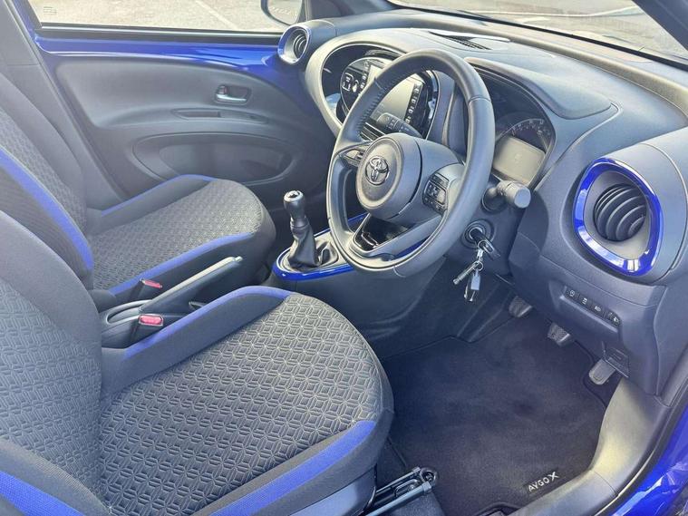 4.2" TFT colour screen, Adjustable speed limiter, Analogue speedometer, Bluetooth connectivity, Digital tachograph, Driver attention alert system, eCall emergency call system, Electric power steering, Intersection turn assist, Key reminder warning, Noise reduction kit, Pre collision system with emergency steering assist, Reversing camera with static guide lines, Smart phone integration with Apple car play/Android Auto, Speed limit display, Start and stop, Vehicle Stability Control (VSC), 4 speakers, 9" HD multimedia display touch screen with Toyota smart connect, DAB digital audio broadcast, USB connector, Auto headlights, Auto wipers, Automatic headlights cut-off, Bicycle towing hook, Black contrast roof, Black side protection mouldings, Black wheel arch mouldings, Body colour door handles, Body coloured front bumper, Boot door scuff plate, Eclipse black rear bumper, Electric heated door mirrors, Follow me home headlights, Front fog lights, Front power windows, Gloss black door mirrors, Gloss black upper front grille, Headlight cut-off reminder, LED daytime running lights, LED front light guide, LED High mounted stop lamp, Manual day/night rear view mirror, Manual headlight levelling, Pagoda roof, Power adjustable door mirrors, Power back door, Privacy glass, Projector halogen headlights, Rain sensor, Rear combination lights LED bulb type, Rear side wing doors, Rear windscreen defogger, Rear windscreen wiper, Short antenna, Variable intermittent windscreen wipers, 12v power outlet - front, 2 seat bench in 2nd row, 3 spoke leather steering wheel, 50/50 split folding rear seat, Adhesive roof headlining, Adjustable speed limiter switch on steering wheel, Audio and telephone switches on steering wheel, Auto air conditioning, Black insert on steering wheel, Black roof lining, Boot light, Centre room light, Chrome interior door handles, Chrome surround on air conditioning buttons, Clean air filter, Console box storage in body color, Fabric upholstery, Floor mats, Front and rear cup holders, Front head rest deco art, Front head restraints, Height adjustable driver seat, Intelligent adaptive cruise control switch on steering wheel, ISOFIX child restraint system on rear seats, Lane departure alert switch on steering wheel, Leather gearshift knob, Manual tilt steering wheel, Manually reclining and sliding driver seat, Manually reclining and sliding front passenger seat, Multimedia switches on steering wheel, Pollen filter, Rear door pockets, Rear head restraints, Satin silver insert on gear shift knob, Single compartment glovebox with lights, Single front passenger seat, Soft tonneau cover, Sun visors with mirror on driver and passenger side, Voice recognition switch on steering wheel, Toyota safety sense pack - Aygo X, Anti lock braking system + Electronic brake force distribution, Child safety door lock, Emergency brake light signal (EBS), Hill start assist control (HAC), Passenger airbag on/off switch, Seat belt reminder for front and rear seats, Supplement restraints system (SRS) - 6 airbags, Traction control, Tyre pressure warning system, Immobiliser, Remote power door locks, Black wheel centre caps, Tyre repair kit,