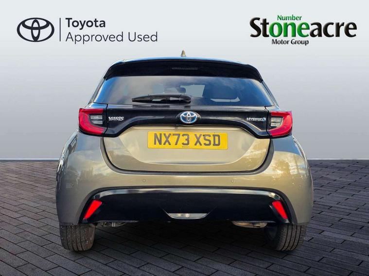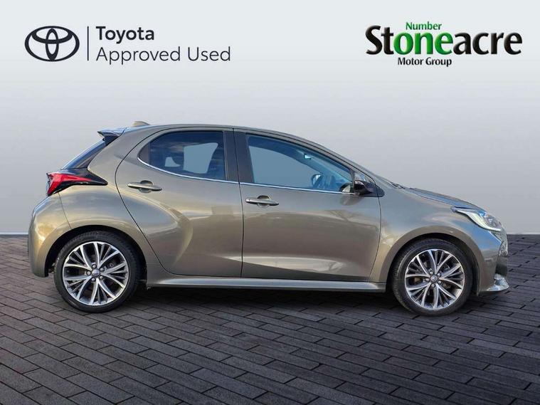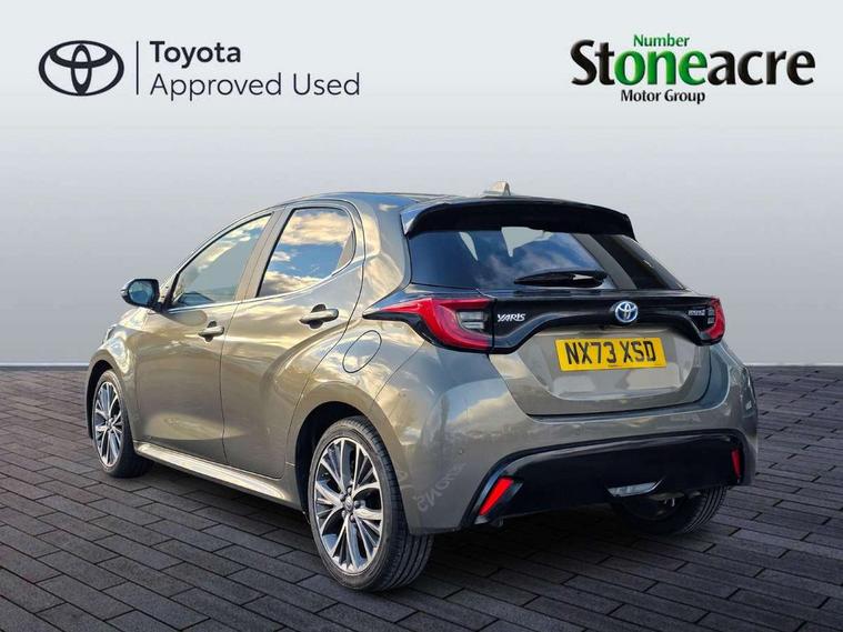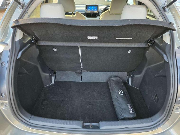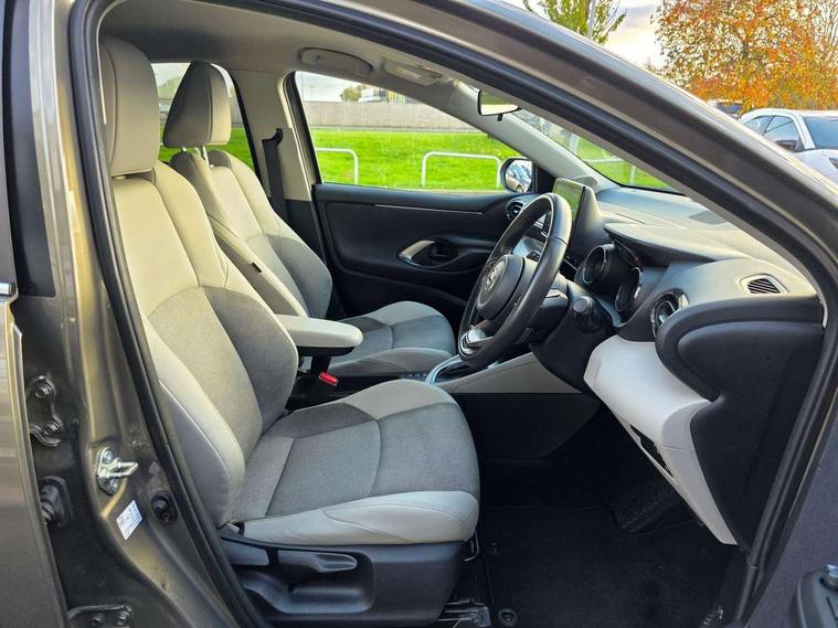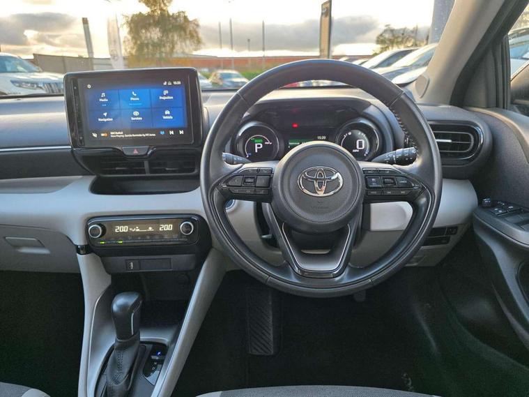 Adaptive cruise control, Adjustable speed limit with speed warning, Blind spot monitoring, Bluetooth connectivity, Colour binocular inspired displays with digital speedometer, E-call, Electric power steering, Hybrid energy display, Multi information display switches on steering wheel, Reversing camera, Smartphone integration with Apple CarPlay and Android auto, Tailgate, Touch 2 navigation system, Voice recognition, Vehicle Stability Control (VSC), 6 speakers, 9" HD multimedia display touch screen with Toyota smart connect, USB connection, Acoustic windscreen glass, Auto windscreen wipers, Automatic headlights, Automatically retractable door mirrors, Body coloured door mirrors, Electric adjustable heated door mirrors, Follow me home headlights, Front auto power windows with anti jam protection, Full LED rear lights, LED daytime running lights, LED front fog lights, LED front light guide, LED Headlights, LED High mounted stop lamp, LED Indicators, LED rear light guide, Manual headlight levelling, Painted chequered front grille, Rain sensor, Rear auto power windows with anti jam protection, Rear privacy glass, Rear side wing doors, Rear spoiler, Rear wiper, Satin lower front grille, Shark fin antenna, Turning signal integrated indicators in door mirrors, Variable front intermittent wipers, 3 adjustable rear headrests, 3 seat bench in 2nd row, 3 spoke leather steering wheel, 60/40 split folding rear seat, Active headrests, Adjustable boot height, Coat hooks in rear grab handles, Cup holders (2 front & door), Data Communication Module (DCM) connected services, Dual zone automatic air conditioning, Fabric seat with partial synthetic leather upholstery, Front armrest, Front sport seats, Glovebox, Grey roof lining, Height adjustable driver's seat, Height adjustable passenger seat, Isofix seat fixing, Leather gearshift, Map pockets on the backs of the front seats, Pollen filter, Shopping bag hooks, Single front passenger seat, Tilt/telescopic steering column, Parking pack - Yaris, 3 point seatbelts on all rear seats, ABS+EBD+Brake assist, Electronic parking brake, Emergency brake light system (EBS), Front passenger airbag on/off switch, Front seatbelt reminder, Hill start assist control (HAC), Rear child proof door locks, Rear seat belt reminder, Supplemental Restraint System (SRS) 8 airbags: Driver & passenger's airbags, dual side curtain airbags, side impact airbags, front centre airbag, Toyota Safety Sense 2, Precollison + Night time Pedestrian & Cyclist Detection, Lane Trace Assist, Auto High Beam, Intelligent ACC & Road Sign Assist, Tyre pressure warning system, 2x Master key, Alarm/immobiliser, Keyless smart entry with push button start, Remote AC via MyT, Remote locking via MyT, Remote powered central double locking doors, Satin chrome interior styling, Soft touch instrument panel, Space saver spare wheel,