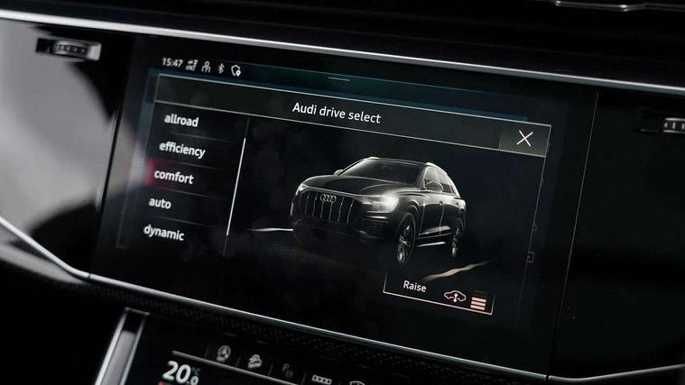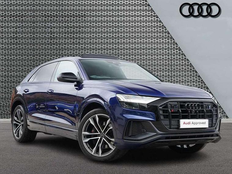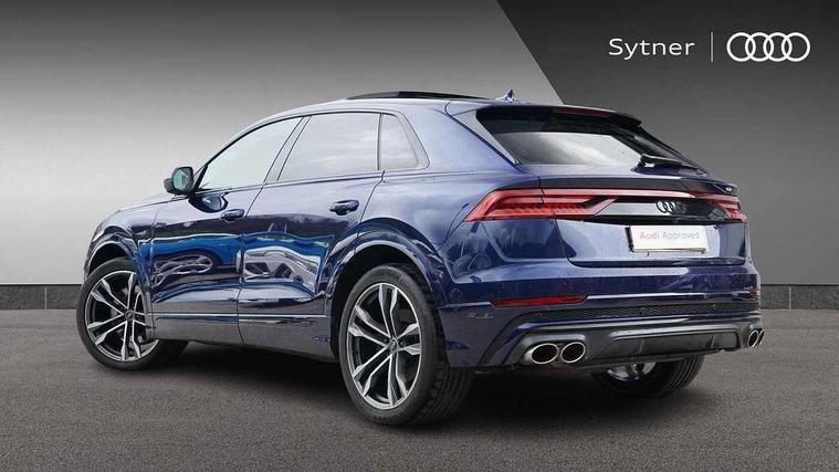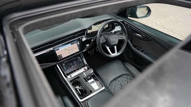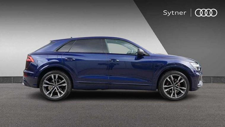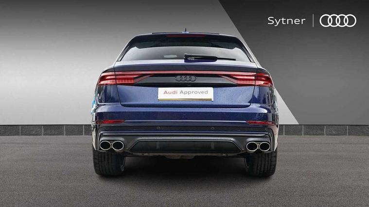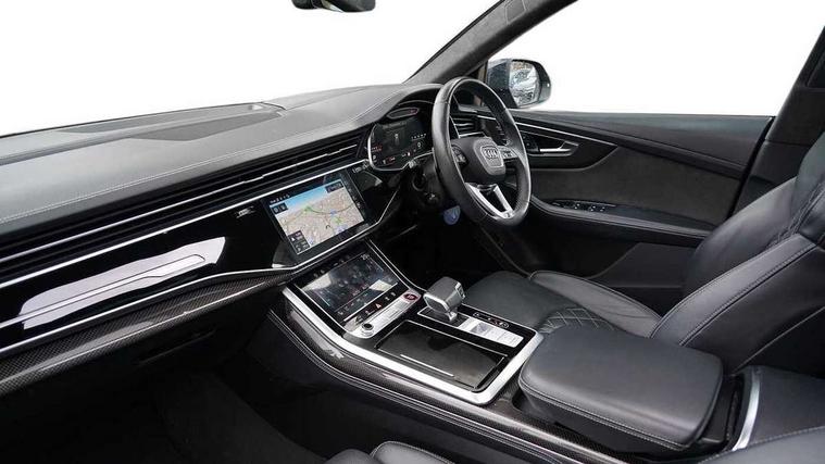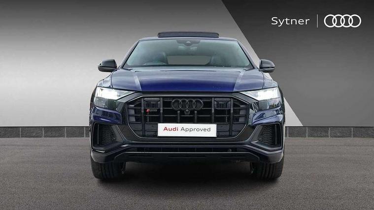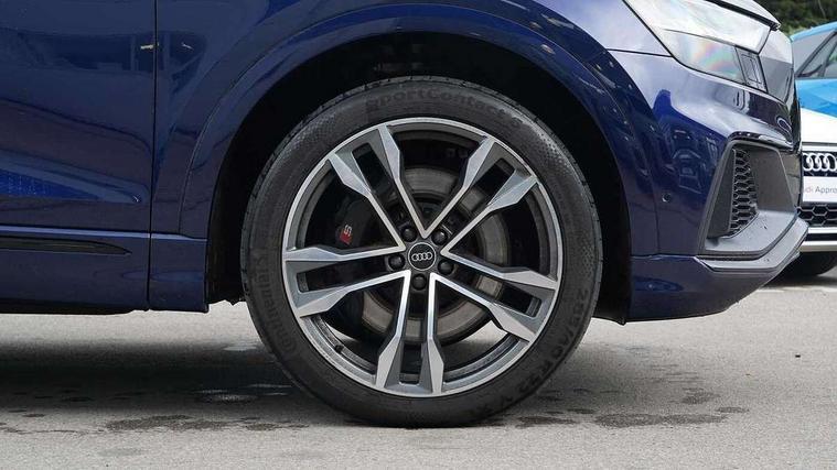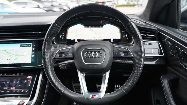 10.1" and 8.6" Dual colour touchscreens, All wheel steering, Audi connect safety and service (e-call), Audi drive select, Audi phone box with wireless charging, Audi smartphone interface with wireless Apple CarPlay, Audi virtual cockpit - 12.3" high resolution LCD display with fully customisable instrument cluster, Automatic start/stop system, Electro-mechanical PAS, Head up Display, Low washer fluid indicator, MMI - Multi Media Interface control system, MMI navigation plus with MMI touch, Natural voice recognition, On board computer, Operating buttons in black, glass look with haptic feedback, Power door closure, Power operated tailgate, Service interval indicator, 48V Mild hybrid technology, 85 litre fuel tank, Electromechanical active roll stabilisation, Quattro sports differential, S specific Adaptive air suspension, Audi music interface with 2 USB ports with charge and data functions, Audi music interface with 2 USB ports with charge and data functions in the rear, Aux-in socket, DAB Digital radio, Acoustic windscreen, Adaptive windscreen wipers with integrated washer jets, Audi Beam uses LEDs to project Vorsprung logo, Audi HD Matrix LED headlights with dynamic front and rear indicators, Auto dimming frameless rear view mirror, Body coloured bumpers, Coming/leaving home lighting function, Electric front+rear windows, Electric panoramic glass sunroof, Electrically adjustable/heated/folding/auto dimming door mirrors with integrated LED indications + kerb view function for passenger side, Headlight washers, Heat insulating glass in windshield, LED signature daytime running lights, Privacy glass - dark tinted rear and rear side windows from B-pillar backwards, Rain and light sensors, Rear wiper, S specific dual brach chrome tailpipes on both the left and right, S specific front and rear bumpers, S specific side skirts in matt selenite silver, Side air inlet grilles in matt titanium black, Trim and underbody protection in matt selenite silver, 3 spoke heated leather multi-function sport steering including paddle shift, 4 zone deluxe automatic climate control, 4-way lumbar support for front seats, 40:20:40 split folding rear bench seat, Black Alcantara headlining, Comfort front centre armrest, Double sun visor with illuminated vanity mirror on driver and passenger side extendable, Driver and front passenger seat memory function for electrically adjustable front seats, Electric adjustable steering column with memory functionality, Electric sunblind for the rear side windows and manual sunblind for the rear window, Front head restraints, Front/rear floor mats, Heated front and outer rear seats, Illuminated door sill trims, ISOFIX child seat mounting for front passenger seat and 2 outer rear seats with top tether child seat mounting for all 3 rear seats, Luggage compartment sill protection in stainless steel, Massage and ventilation function for front seats, Rear centre armrest with 2 cupholders, Rear headrests, Rear seat bench plus, Stainless steel pedals, Valcona leather upholstery + super sports seats with S embossed logo, City assist pack - Q8, Comfort and sound pack - SQ8, Extended leather pack - Q8, Multi-coloured extended LED interior lighting pack - RS Q8, Titanium Black Styling Pack - Q8, Tour pack - Q8, 3 point seatbelts on all seats, Audi pre sense front, Driver and front passenger, front side and curtain airbags, Electromechanical parking brake, Electronic Stability Control (ESC) including ABS, ASR and EDL, Front passenger airbag deactivation, Hill descent control, Hill hold assist, Predictive pedestrian protection, Seatbelt monitoring, Traction control, Tyre pressure loss indicator, Warning triangle and first aid kit, Anti theft alarm with tow away protection, Anti-theft wheel bolts and wheel loosening detection, Immobiliser, Keyless go with remote central locking, Carbon vector inlays, 22" x 10J 5 V spoke star design alloy wheels in gloss anthracite black, Tool kit, Tyre repair kit,