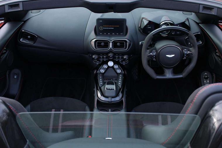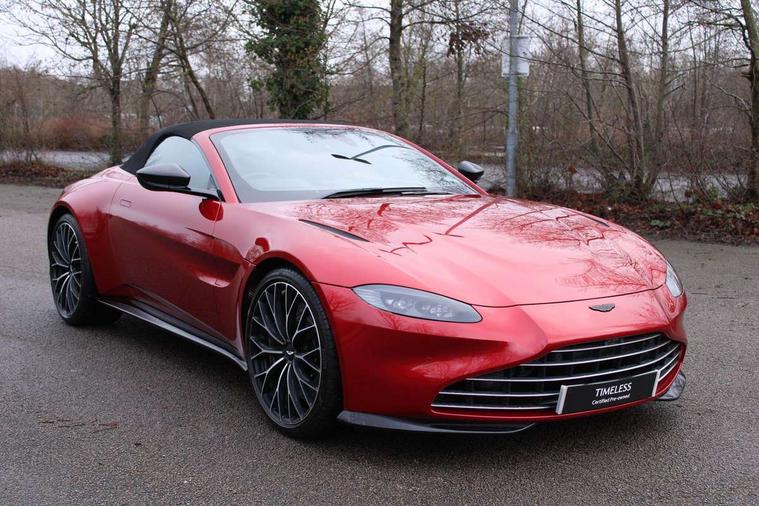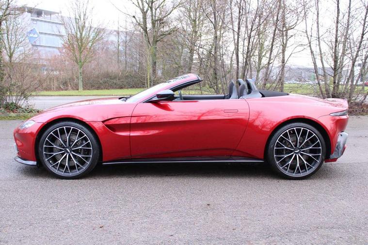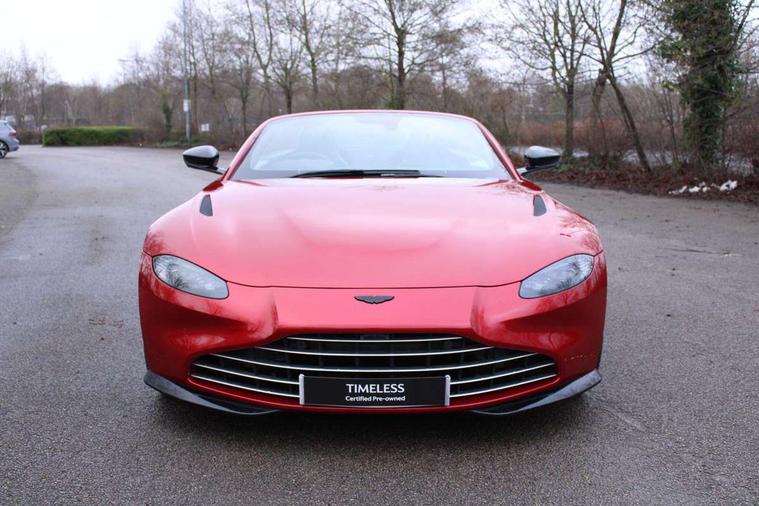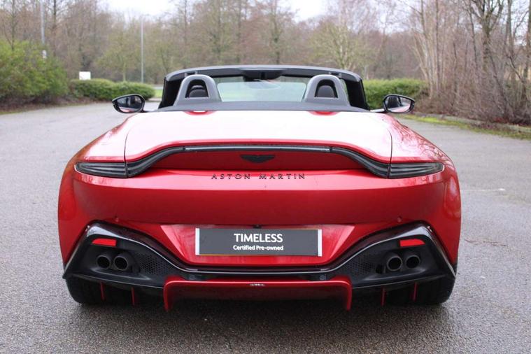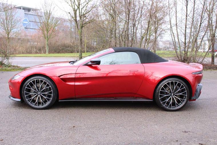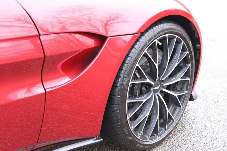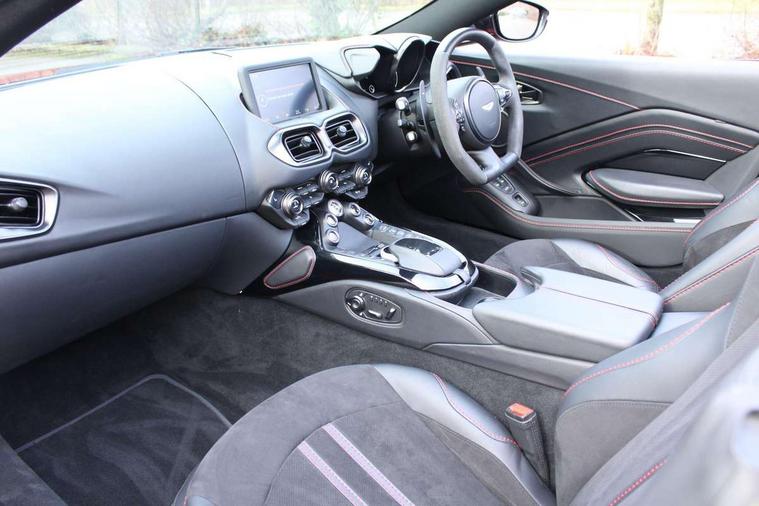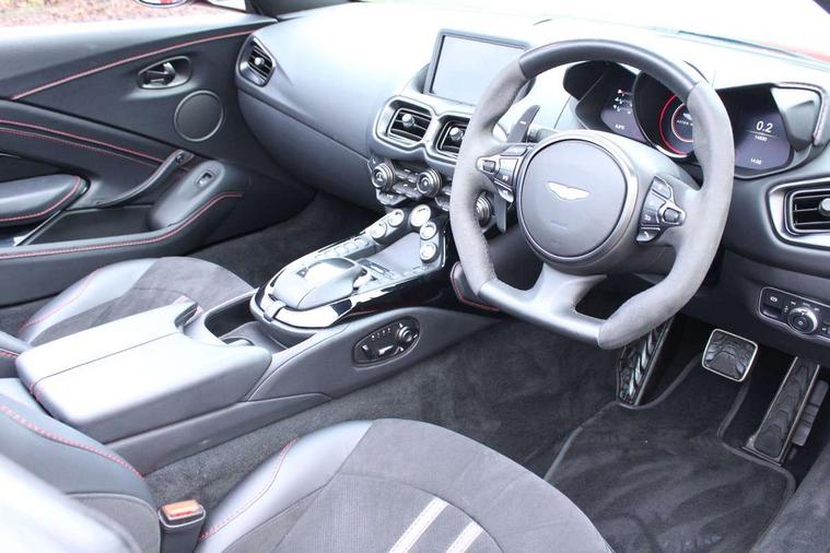 360 degree parking camera, Blind spot monitoring, Bluetooth Telephone preparation, Emergency services call system, Park assist, Rotary dials, Servotronic speed sensitive power steering, Trip computer, Sports suspension, Auxiliary input socket, DAB Digital radio, iPod connection, USB connection, 3rd brake light, Body colour decklid insert, Body colour door handles, Electric folding mirrors, Electric front windows, Full width LED tail lights signature with stop tail and dynamic indicator functions, Heated door mirrors, LED daytime running lights, LED high and low beam headlamps with integrated directional indicator, LED lock/unlock graphic theatre lights, LED position lamp, Paint protection film, Quad matte black exhaust tailpipe finisher, Rear boot, Wind deflector, 8 way electrically adjustable front seats, Black loadspace carpet, Centre console armrest with closed storage, Climate control, Detailing perforation, Electric steering column with cruise control, Embossed - Aston martin wings, Floor mats, Front head restraints, Heated front seats, Single front passenger seat, Service pack - Vantage, ABS + EBD + EBA, Cast iron brakes, DSC - Dynamic Stability Control, Front side airbags, HBA (Hydraulic Brake Assist), Hill hold assist, Traction control, Tyre pressure monitoring system, Alarm, Immobiliser, Keyless entry, Remote central locking + boot release, Glass switches, Colour keyed wheel caps, Tyre repair kit,