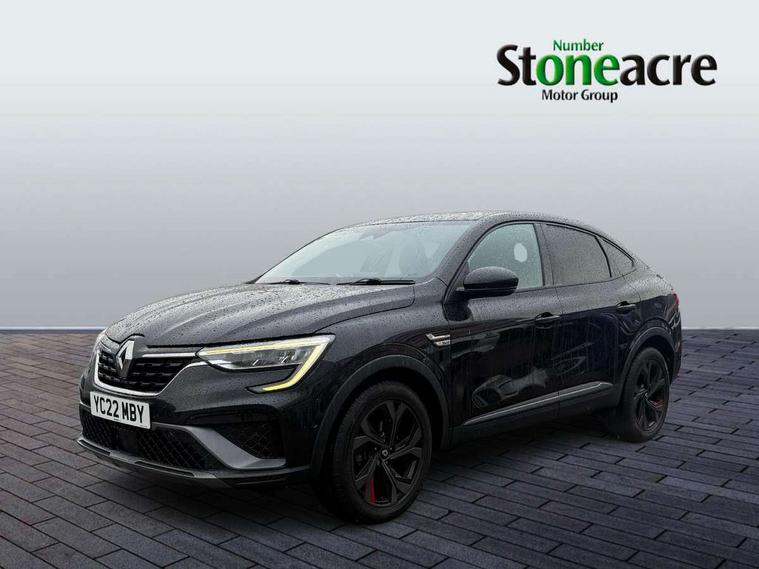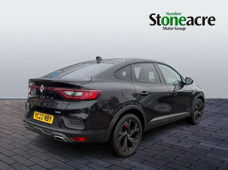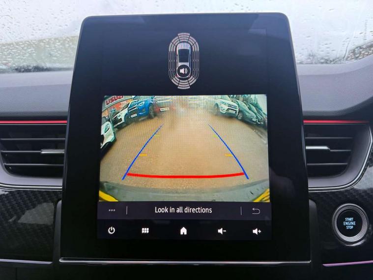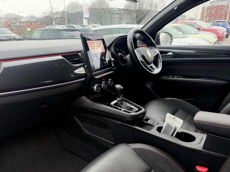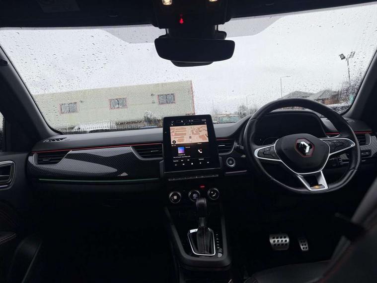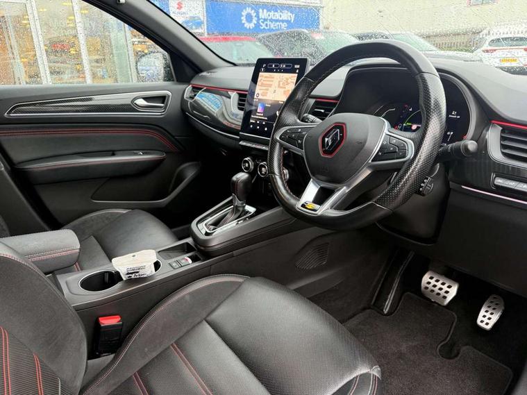 7" TFT Driver information display, Blind spot warning, Bluetooth system, EASY LINK 9.3" portrait touchscreen with navigation, Google search and traffic information, eCall emergency call system, Eco mode, EV button to activate pure mode, Front and rear parking sensors, Gear change indicator, Lane departure warning, Lane keep assist, Multi-sense - 3 driving modes and 8 ambient lighting, Rear cross traffic alert, Rear view camera, Renault automatic emergency assist, Smartphone integration compatible with Apple CarPlay and Android Auto, Traffic sign recognition with over speed prevention, Trip computer, Variable assistance electric power steering, Wireless phone charger, DAB radio, USB port, 3rd brake light, Auto dimming rear view mirror, Automatic headlights, Automatic high / low beam, Automatic windscreen wipers with rain sensor, Black side door protection with gun metal insert, Body coloured bumpers, C-shaped LED front signature lighting, Chrome decopart on wing (fender molding) with R.S. Line badge, Double chromed exhaust tailpipes elements, Extra tinted rear windows and tailgate, Frameless rear view mirror, Front and rear electric windows, Front bumper with F1 blade and honeycomb front grille, Front driver window with one touch facility and anti-pinch function, Front grille with chrome on upper part, Full LED headlights, Glossy black door mirror and lower window lining, Gun Metal front and rear skid plates, Heated rear window, R.S. Line badges on front wing and hatch door, Rain sensor, Rear windscreen wiper, Shiny black shark fin antenna, Side mirrors adjustable electrically, electrically foldable, with defrosting and temperature sensor, automatically foldable at vehicle closure, 3 seat bench in 2nd row, 60:40 split and fixed base rear seats, Aluminium pedals, Automatic climate control with combined filter, humidity sensor and AQS, Black interior roof lining, Carbon style dashboard, Central console with storage, Driver's seat height adjustment, Electrically adjustable front seats, Front and rear head restraints, Height and reach adjustable steering wheel, ISOFIX child seat fixing points on rear outermost seats, LED front and rear roof lights, Passenger seat height adjuster, R.S. line black suede-leather upholstery with red/grey stiching, R.S. Line perforated leather steering wheel with red/black harmony and R.S. Line badge, Rear air vents, Red inserts on air vents, Single front passenger seat, Parking Pack - Hands-free parking & flank protection - Arkana, Winter pack - Arkana, 3x3 point rear seat belts, ABS+EBA, Active emergency braking system, B Brake Mode - One pedal driving with increased regenerative braking, Distance warning alert, Driver airbag, Driver and passenger front and side airbag deactivation, Driver and passenger side airbags, Driver height adjustable seat belt, Electronic parking brake with auto hold, ESC (Electronic Stability Control), Front and rear no seatbelt warning sound, Front curtain airbags, Front head airbags, Hill start assist, Passenger airbag, Tyre pressure warning light, Anti drill door locks and locking fuel cap, Central door locking, Deadlocking system, Hands free keycard with Keyless access and start, RAID (Renault Anti-Intruder Device) automatic door locking, Rear side wing door and window child locking function (front driver door control panel), Superlocking, Thatcham alarm, 18" Silverstone diamond alloy wheels with red inserts,