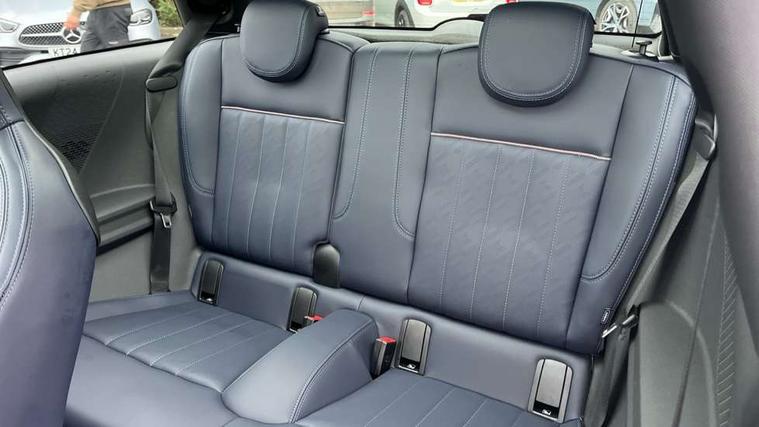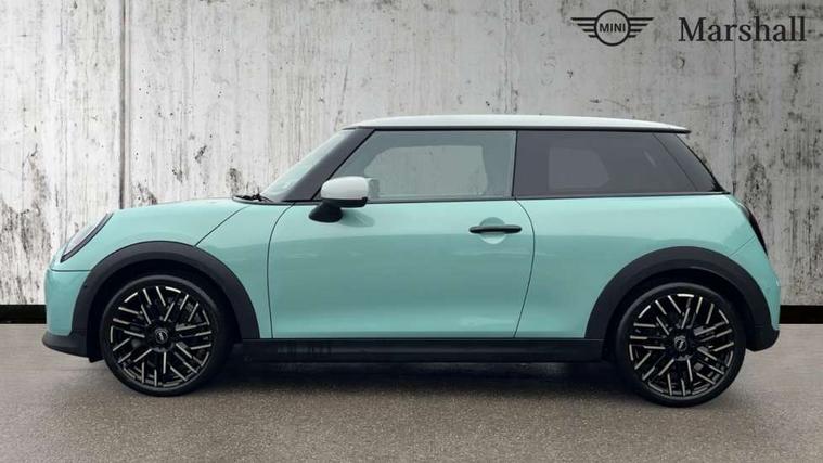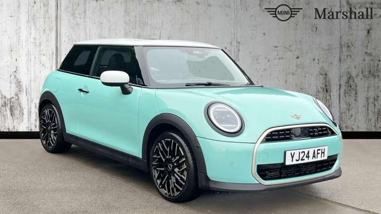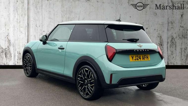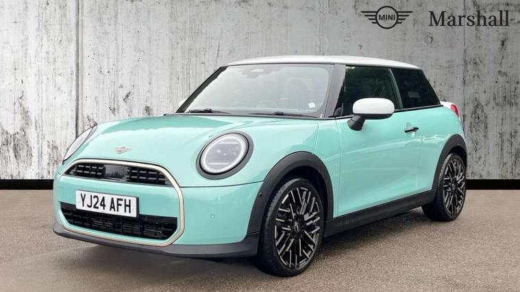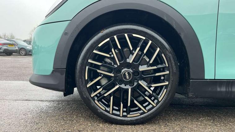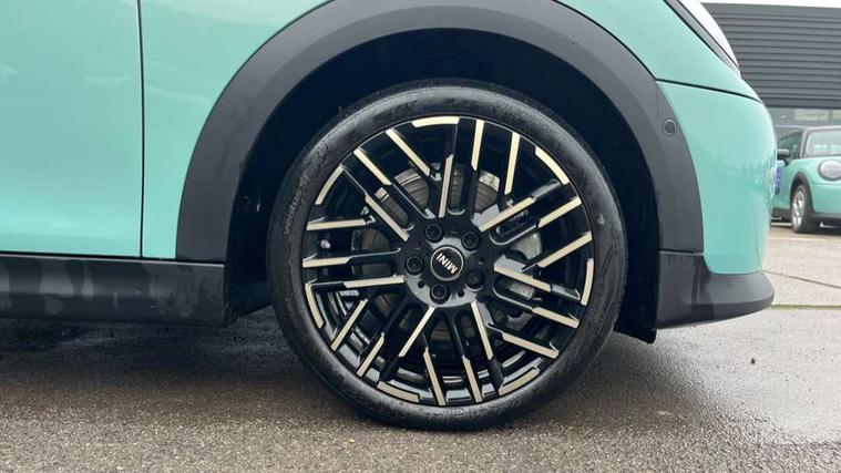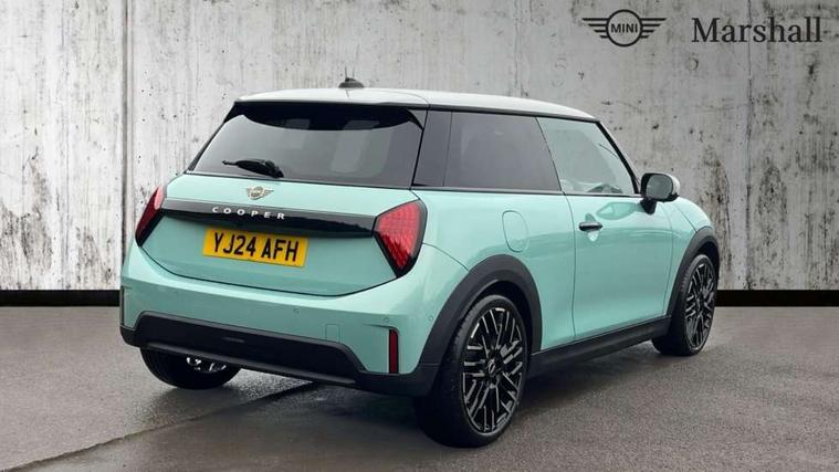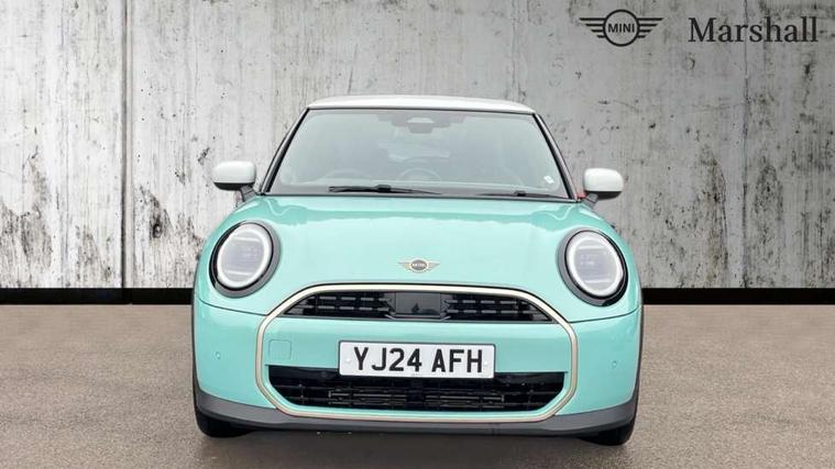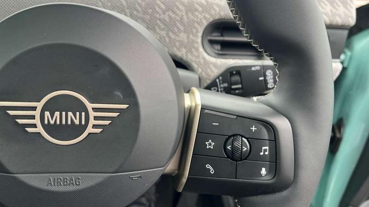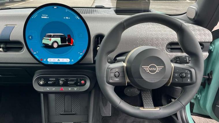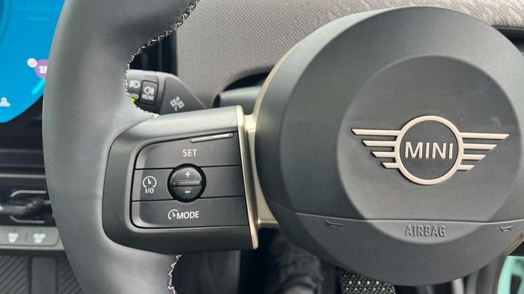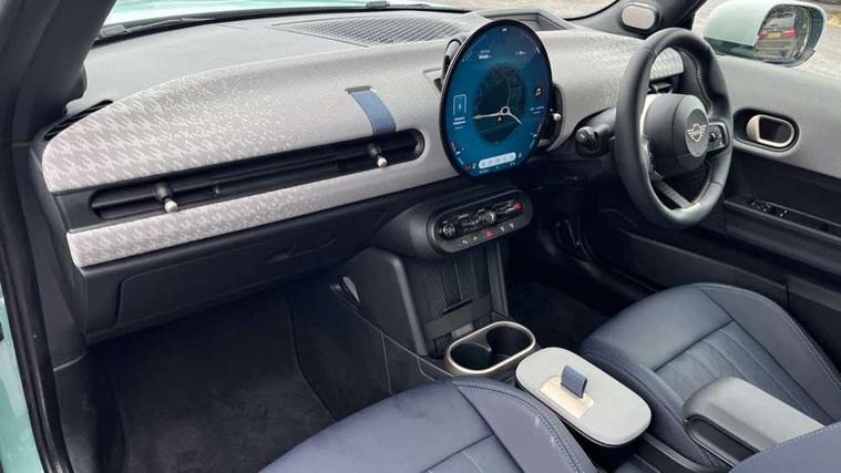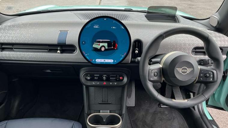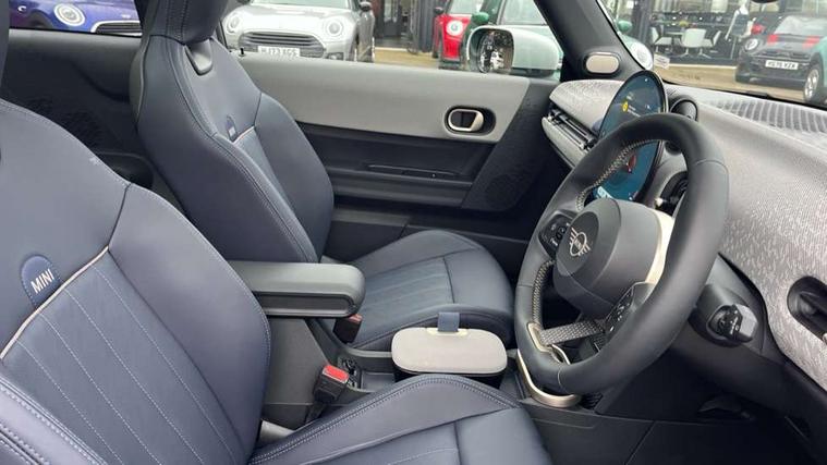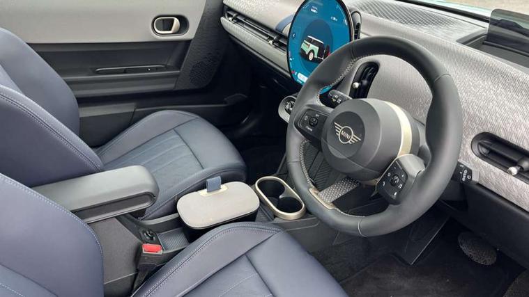 Central toggle bar, Circular OLED Screen, Compatible mobile phone bluetooth with audio streaming, Cruise control, Digital instrument cluster, Electro-mechanical speed dependant steering assistance, Emergency call service, MINI Experience Modes, Mini navigation system, On board computer, Service interval indicator, 7 speed steptronic transmission with double clutch, DAB Digital radio, Personal eSim, Auto headlights, Electric adjustable heated door mirrors, Electric front windows, Heated rear window, Heated windscreen washer jets, LED daytime running lights, LED Headlights, LED indicator lights, LED rear lights, Logos in Vibrant Silver, Rain sensor window wipers, Rear fog lights, Rear window wiper, Vibrant silver grille surround, 2 seat bench in second row, 2 zone automatic air conditioning, 60/40 rear seat bench, Ambient lighting, Cupholders, Dark headliner, Floor mats, Front and rear head restraints, Front compact armrest, Heated steering wheel, Height adjustable passenger seat, Lidded storage box in grey knit, Luggage compartment lighting, Single front passenger seat, Sport Vescin Steering Wheel, Sunvisors with vanity mirrors, Vescin synthetic leather upholstery, Driving assistant pack - Cooper Hatchback, Park assistant pack - Cooper Hatchback, 3 point seatbelts on all four seats, 6 Airbags - front, side, head and seat belt tensioners, Acoustic pedestrian protection, Anti-lock braking system (ABS), DSC - Dynamic Stability Control, Electronic parking brake, Front and rear disc brakes, Front ISOFIX (iSize), Front passenger airbag deactivation, Traction control, Tyre pressure monitoring system, Alarm, Immobiliser, Remote central locking, Blue decorative dash strap, Light Beige/Grey dash knit, Tyre repair kit,