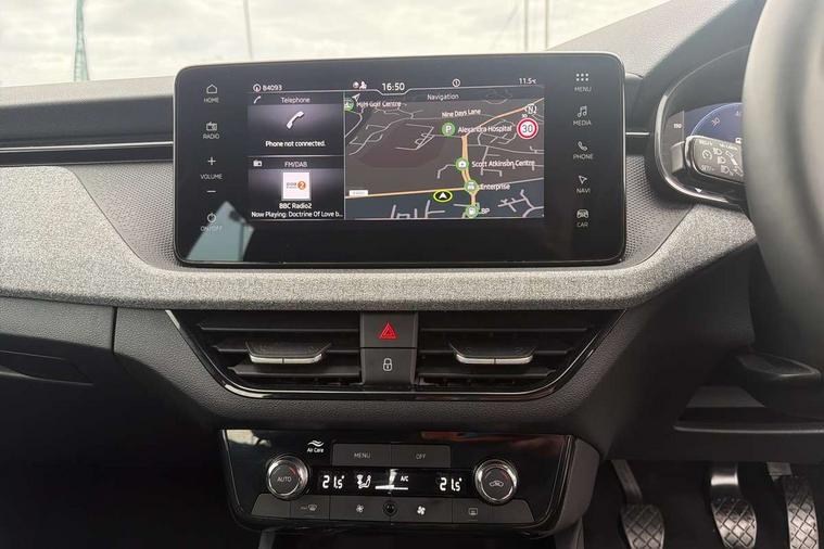 Advanced driver attention and drowsiness monitor, Bluetooth, e-Call (emergency call), Front assist system, PAS, Rear parking sensors, Rear view camera, Speed limiter, Tailgate, Traffic sign recognition, Virtual Cockpit - 10.25" digital display, Voice control system, Wireless smartlink, 4 USB C ports, 8 Speakers, 9.2" Skoda navigation display, DAB radio, Auto dimming rear view mirror, Automatic headlamp activation with Coming home and Leaving home feature, Automatic high/low beam, Body colour bumpers, Body colour door mirrors and handles, Chrome moulding around grille, Front and rear electric windows, Full LED headlights, Heated rear window, LED 3rd brake light, LED brake lights, LED daytime running lights, LED front turning lights, LED high beam, LED low beam, LED taillights, Rear LED fog light, Rear side wing doors, Rear wiper, Tinted windows, Unique dark chrome design logo on alloy wheels, 12V socket in luggage compartment, 3 seat bench in 2nd row, Black / Grey armrest stitching, Black hotstamping, Cargo elements, Chrome inner door handles, Door inserts in satin black, Driver and passenger sun visors with vanity mirror, Dual zone climate control, Front and rear roof lights, Front centre armrest, Front head restraints, Glasses storage in roof liner, Height adjustable driver seat, Height adjustable passenger seat, Ice scraper, Illuminated glove compartment, Inner circulation control with pollen filter, ISOFIX for front passenger seat, Isofix preparation for back seats, Leather gearknob and handbrake lever, Loft cloth upholstery, Luggage net under rear parcel shelf, Manual lumbar support for front seats, Net package and top tether hooks in boot space, Pearl grey ceiling, Pocket on the back of both front seats, incl. mobile phone pockets, Single front passenger seat, Skoda lettering on steering wheel, Textile floor mats, Third rear headrest, Ticket holder, Top tether for front passenger seat, Umbrella in driver's door, 3x3 point rear seatbelts, ABS, Child locks, Curtain airbags and front side airbags, Disc brakes, Driver and front passenger airbags, ESP, Hill hold control, Manual leather parking brake, One tone horn, Passenger airbag switch off function, Seatbelt reminder for driver and front passenger, Tyre pressure monitoring system, Anti theft alarm system with interior monitoring, backup horn and towing protection, Anti-theft wheel bolts, Remote central locking with 2 remote folding keys, SAFE function for remote central locking, Decord pad, door inserts Kota uni,