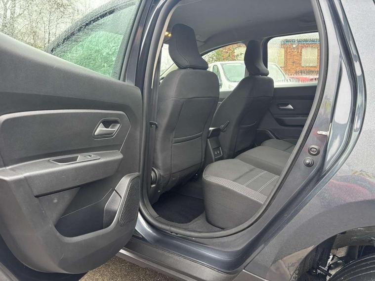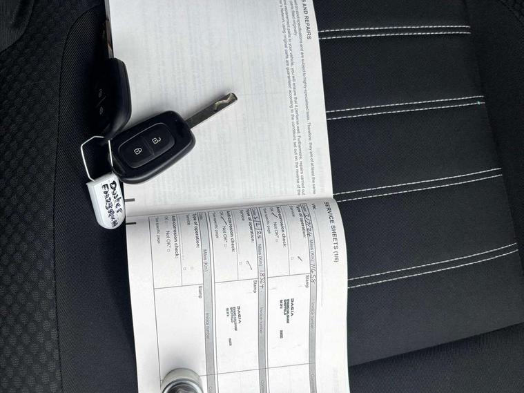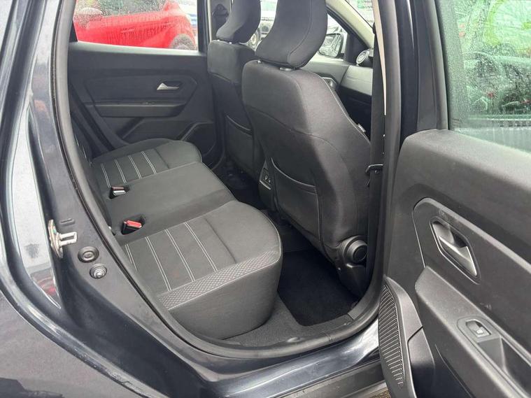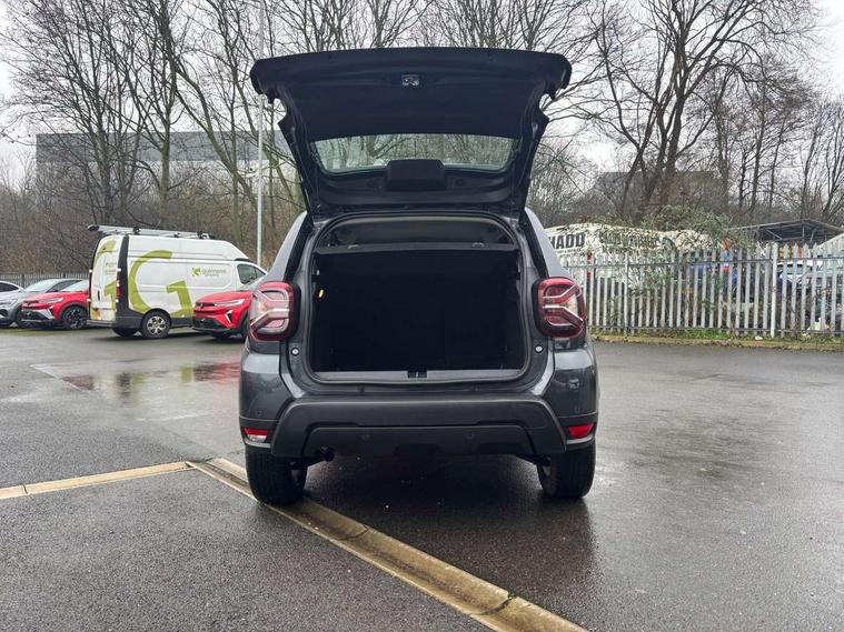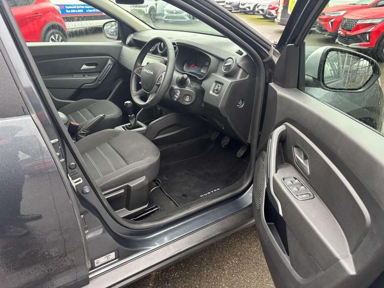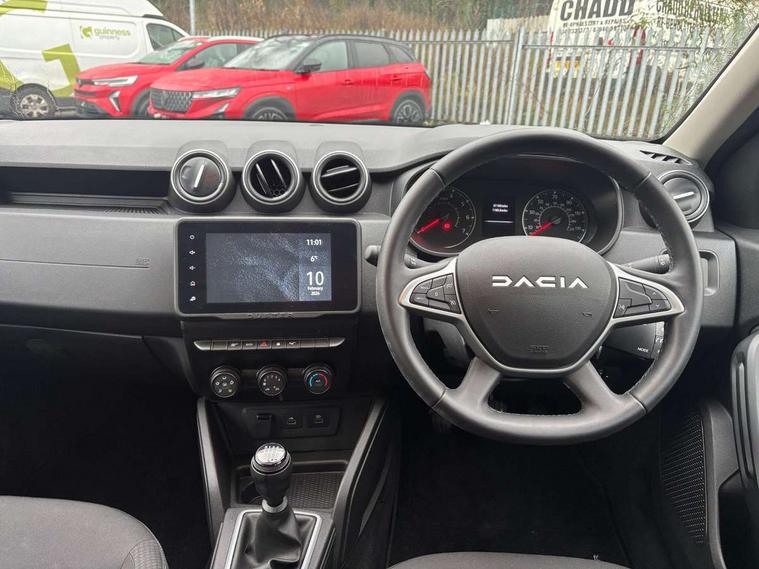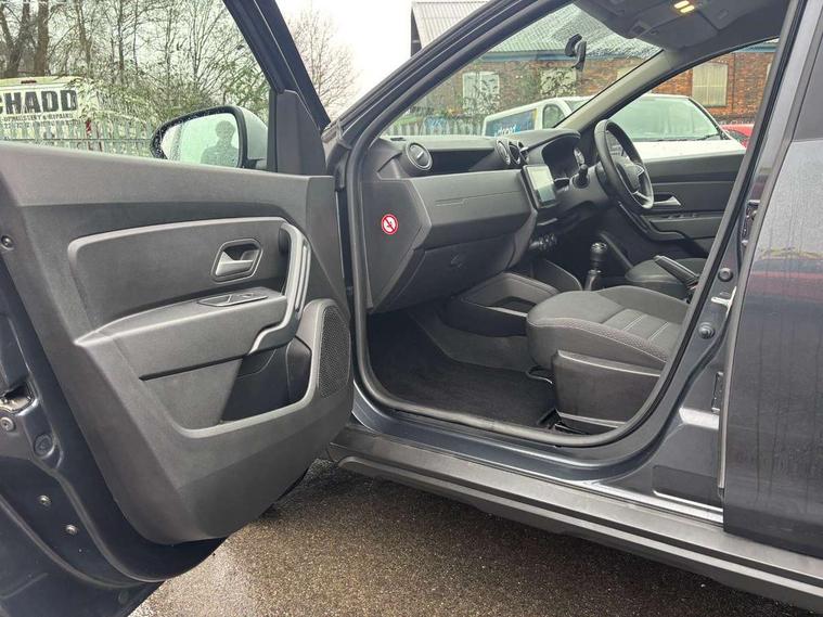 Cruise control and speed limiter, eCall emergency system, Eco mode, Electric power assisted steering, On board computer, odometer, trip computer, average fuel consumption, average speed, service indicator, outside temperature gauge, Rear parking sensors, Rev counter, Reversing camera, Stop/start system, 8" Media display with smartphone replication, 2 usb sockets and 6 speakers, Dacia plug and radio/MP3/USB/bluetooth/DAB/steering wheel control, 3 speed windscreen wipers, Black longitudinal roof bars with Duster inscription, Black side sills, Black/satin chrome tailgate trim with Duster inscription in black background and lettering, Body coloured door handles, Chrome front grille with hot stamping, Chrome logo surround on steering wheel, Daytime running lights, Drivers window one touch up/down, Dusk sensor, Electric adjustable/heated door mirrors, Electric front windows, Electric rear windows, Front and rear body coloured bumpers, Front door sill protection strip, Front fog lights, Heated rear window, High level third rear brake light, Rain sensor, Rear side wing doors, Rear spoiler, Rear wash/wipe, Satin chrome door mirrors, Tinted windows, Underbody protection skid plates, Y shaped LED headlights with rear LED lights, 3 rear height adjustable headrests, 3 seat bench in 2nd row, 60/40 split folding rear seat, Backlighted steering wheel buttons, Boot light, Driver seat lumbar adjustment, Fabric decorative insert on door panels, Fabric upholstery, Front head restraints, Front passenger reading light, Gear shift indicator, Height adjustable driver seat, Height adjustable front and rear headrests, Height and depth adjustable steering wheel, High centre console with driver armrest, Isofix points for child seats in both outer rear seats, Manual air conditioning, Map pocket on front seat backs, Passenger sunvisor with vanity mirror, Rear passenger reading light, Satin chrome interior door handles, Satin chrome lower steering wheel insert, Single front passenger seat, Soft feel leather steering wheel, 3x3 point rear seatbelts, ABS and Emergency brake assist, ASR traction control with Electronic stability control, Child locks on rear doors, Door open visual and audible warning, Driver airbag, Driver and passenger seatbelt not fastened - visual and audible warning, EBD - Electronic brakeforce distribution, Front passenger airbag, Front passenger airbag deactivation, Front seatbelt pretensioners, Front side airbags, Height adjustable front seatbelts, Hill start assist, Tyre pressure monitor, Remote central locking, Thatcham approved engine immobiliser, Charcoal grey central console surround, Matt black central console fascia, Piano black decorative insert on front door panels, Satin chrome air vent surround, Satin chrome instrument dial surrounds, 16" alloy wheels,