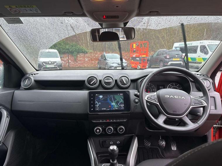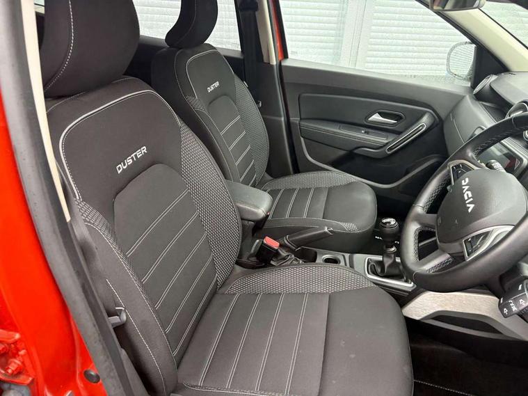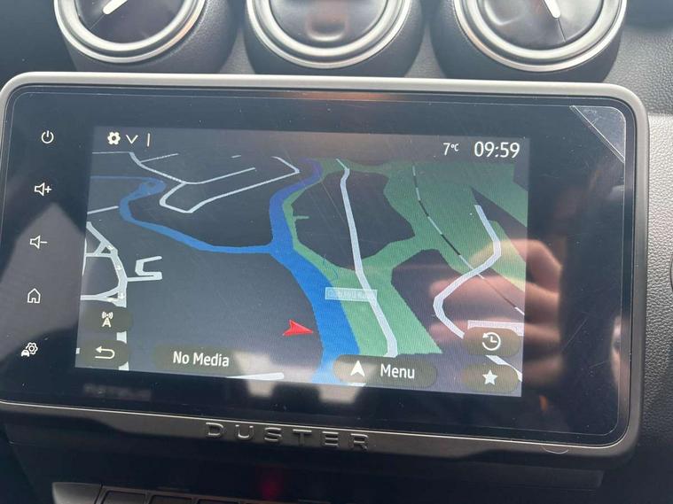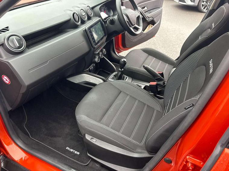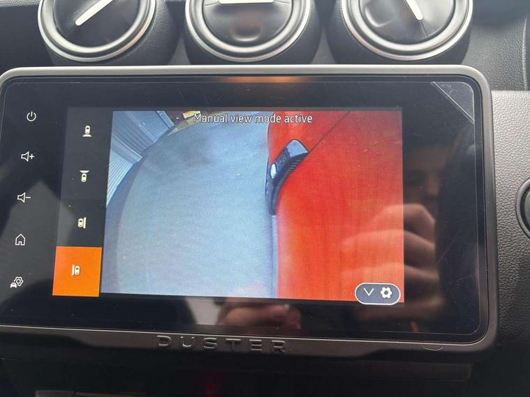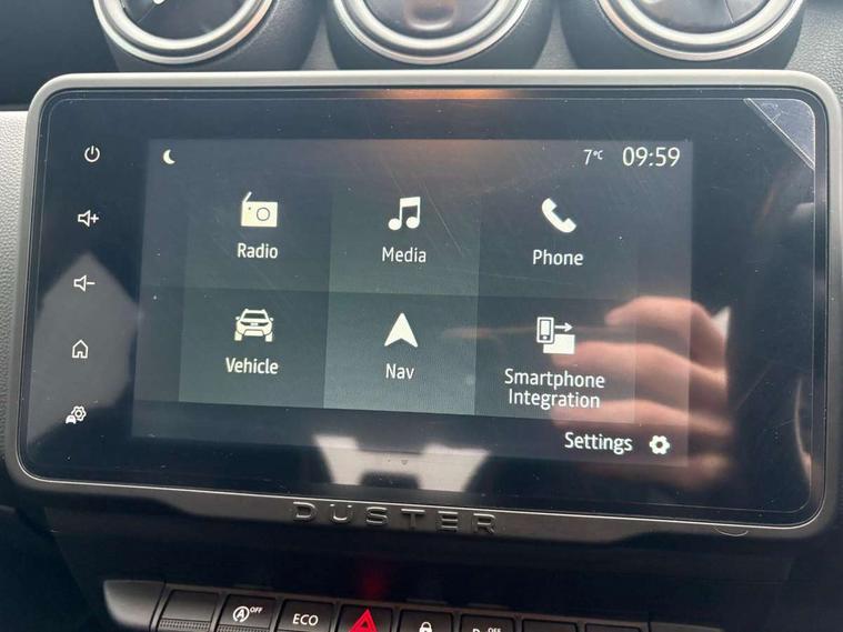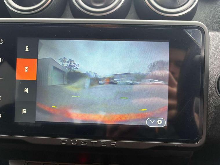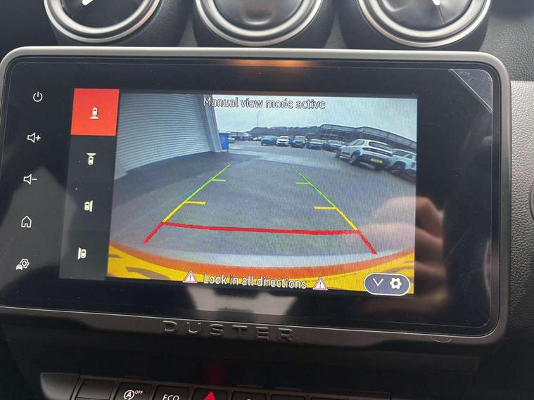 Blind spot warning, Cruise control and speed limiter, eCall emergency system, Eco mode, Electric power assisted steering, Multi view camera, On board computer, odometer, trip computer, average fuel consumption, average speed, service indicator, outside temperature gauge, Rear parking sensors, Rev counter, Reversing camera, Stop/start system, 8" Media Navigation with wireless smartphone replication, Dacia plug and radio/MP3/USB/bluetooth/DAB/steering wheel control, 3 speed windscreen wipers, Acoustic windshield, Automatic front wipers, Black side sills, Black/satin chrome tailgate trim with Duster inscription in black background and lettering, Body coloured door handles, Chrome front grille with hot stamping, Chrome logo surround on steering wheel, Dark glass on lateral rear windows, Daytime running lights, Drivers window one touch up/down, Dusk sensor, Electric adjustable/heated door mirrors, Electric folding door mirrors, Electric front windows, Electric rear windows, Front and rear body coloured bumpers, Front door sill protection strip, Front fog lights, Grey quartz longitudinal roof bars with Duster inscription, Heated rear window, High level third rear brake light, Modular roof bars, Rain sensor, Rear side wing doors, Rear spoiler, Rear wash/wipe, Satin chrome door mirrors, Underbody protection skid plates, Y shaped LED headlights with rear LED lights, 3 rear height adjustable headrests, 3 seat bench in 2nd row, 60/40 split folding rear seat, Automatic air conditioning, Backlighted steering wheel buttons, Boot light, Driver seat lumbar adjustment, Fabric decorative insert on door panels, Fabric upholstery, Front head restraints, Front passenger reading light, Gear shift indicator, Glovebox light, Heated seats, Height adjustable driver seat, Height adjustable front and rear headrests, Height and depth adjustable steering wheel, High centre console with driver armrest, Isofix points for child seats in both outer rear seats, Map pocket on front seat backs, Passenger sunvisor with vanity mirror, Rear passenger reading light, Satin chrome gear lever cap insert, Satin chrome interior door handles, Satin chrome lower steering wheel insert, Single front passenger seat, Soft feel leather steering wheel, 3x3 point rear seatbelts, ABS and Emergency brake assist, ASR traction control with Electronic stability control, Child locks on rear doors, Door open visual and audible warning, Driver airbag, Driver and passenger seatbelt not fastened - visual and audible warning, EBD - Electronic brakeforce distribution, Front passenger airbag, Front passenger airbag deactivation, Front seatbelt pretensioners, Front side airbags, Height adjustable front seatbelts, Hill start assist, Tyre pressure monitor, Keyless entry, Remote central locking, Thatcham approved engine immobiliser, Charcoal grey central console surround, Matt black central console fascia, Matt black decorative insert on rear door panels, Piano black decorative insert on front door panels, Satin chrome air vent surround, Satin chrome instrument dial surrounds, 17" Alloy wheels,