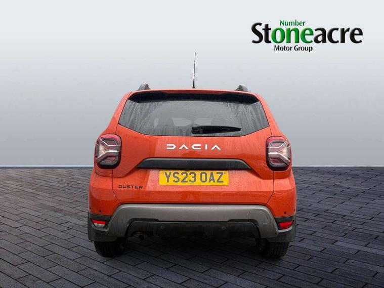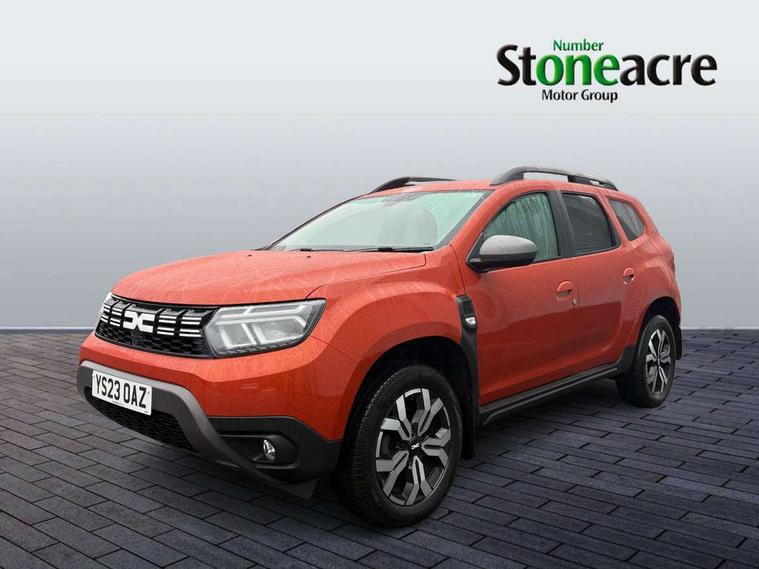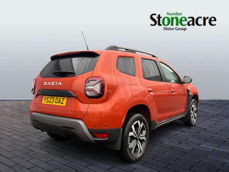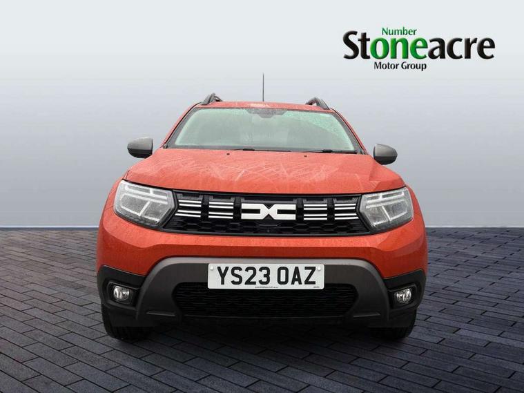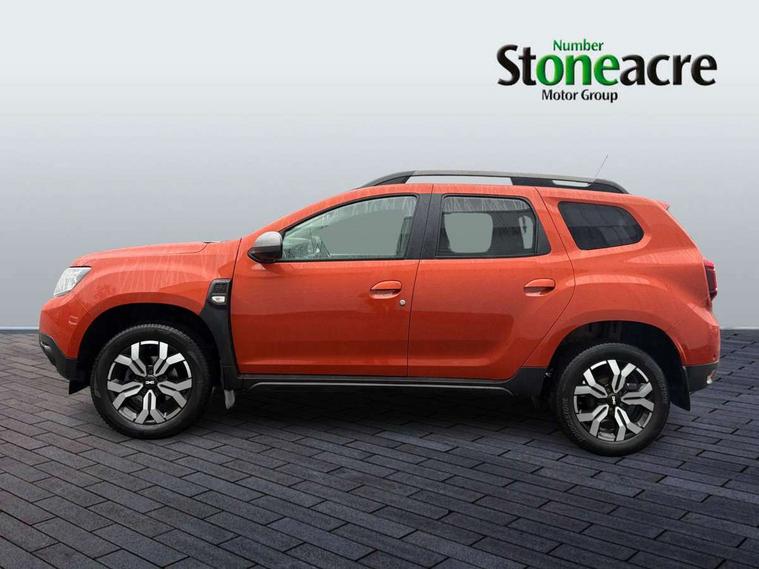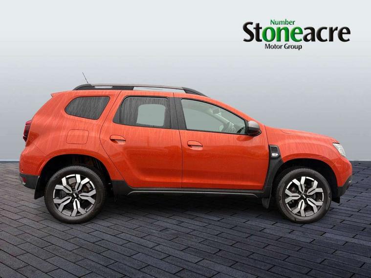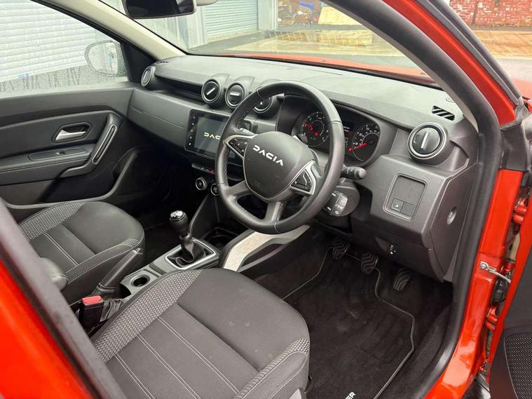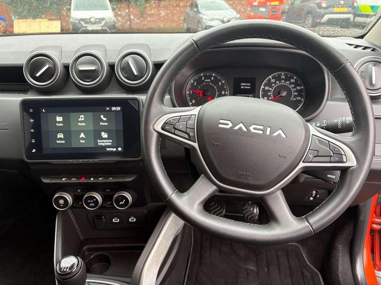 Blind spot warning, Cruise control and speed limiter, eCall emergency system, Eco mode, Electric power assisted steering, Multi view camera, On board computer, odometer, trip computer, average fuel consumption, average speed, service indicator, outside temperature gauge, Rear parking sensors, Rev counter, Reversing camera, Stop/start system, 8" Media Navigation with wireless smartphone replication, Dacia plug and radio/MP3/USB/bluetooth/DAB/steering wheel control, 3 speed windscreen wipers, Acoustic windshield, Automatic front wipers, Black side sills, Black/satin chrome tailgate trim with Duster inscription in black background and lettering, Body coloured door handles, Chrome front grille with hot stamping, Chrome logo surround on steering wheel, Dark glass on lateral rear windows, Daytime running lights, Drivers window one touch up/down, Dusk sensor, Electric adjustable/heated door mirrors, Electric folding door mirrors, Electric front windows, Electric rear windows, Front and rear body coloured bumpers, Front door sill protection strip, Front fog lights, Grey quartz longitudinal roof bars with Duster inscription, Heated rear window, High level third rear brake light, Modular roof bars, Rain sensor, Rear side wing doors, Rear spoiler, Rear wash/wipe, Satin chrome door mirrors, Underbody protection skid plates, Y shaped LED headlights with rear LED lights, 3 rear height adjustable headrests, 3 seat bench in 2nd row, 60/40 split folding rear seat, Automatic air conditioning, Backlighted steering wheel buttons, Boot light, Driver seat lumbar adjustment, Fabric decorative insert on door panels, Fabric upholstery, Front head restraints, Front passenger reading light, Gear shift indicator, Glovebox light, Heated seats, Height adjustable driver seat, Height adjustable front and rear headrests, Height and depth adjustable steering wheel, High centre console with driver armrest, Isofix points for child seats in both outer rear seats, Map pocket on front seat backs, Passenger sunvisor with vanity mirror, Rear passenger reading light, Satin chrome gear lever cap insert, Satin chrome interior door handles, Satin chrome lower steering wheel insert, Single front passenger seat, Soft feel leather steering wheel, 3x3 point rear seatbelts, ABS and Emergency brake assist, ASR traction control with Electronic stability control, Child locks on rear doors, Door open visual and audible warning, Driver airbag, Driver and passenger seatbelt not fastened - visual and audible warning, EBD - Electronic brakeforce distribution, Front passenger airbag, Front passenger airbag deactivation, Front seatbelt pretensioners, Front side airbags, Height adjustable front seatbelts, Hill start assist, Tyre pressure monitor, Keyless entry, Remote central locking, Thatcham approved engine immobiliser, Charcoal grey central console surround, Matt black central console fascia, Matt black decorative insert on rear door panels, Piano black decorative insert on front door panels, Satin chrome air vent surround, Satin chrome instrument dial surrounds, 17" Alloy wheels,
