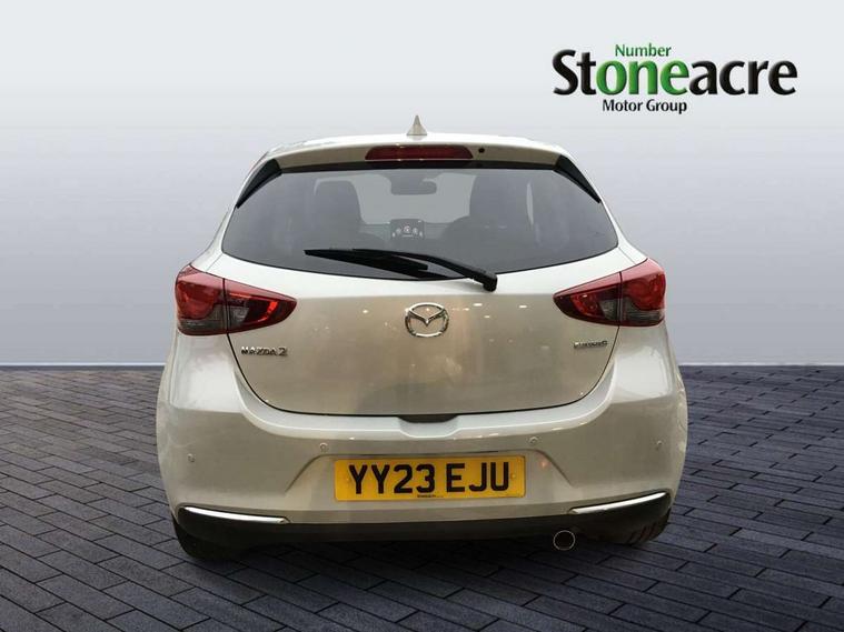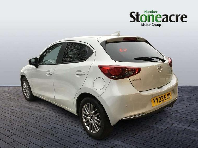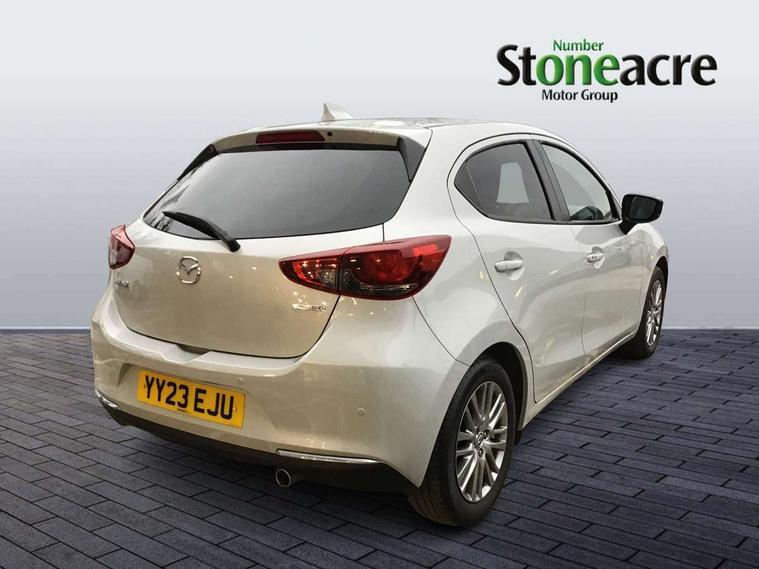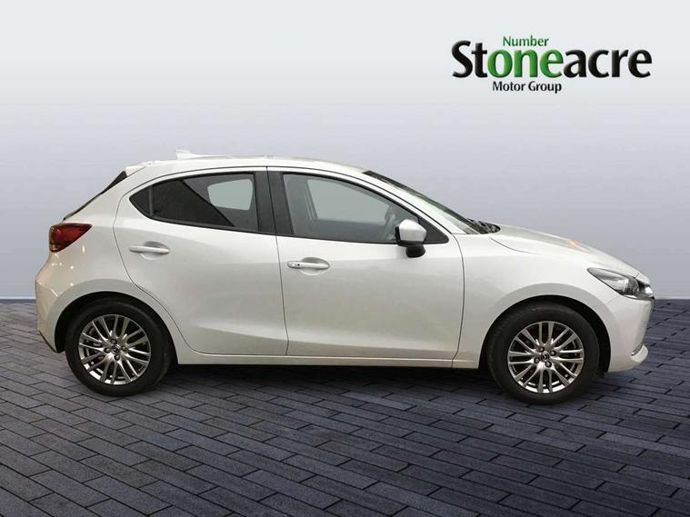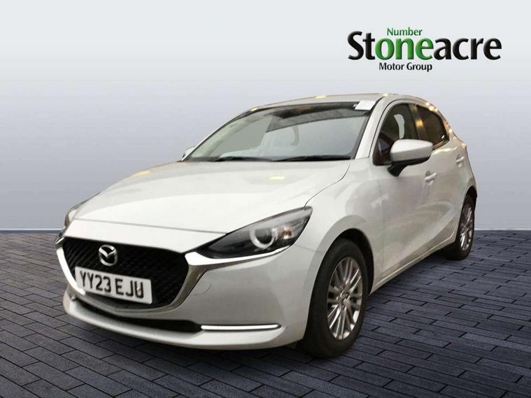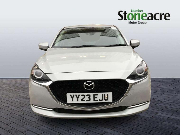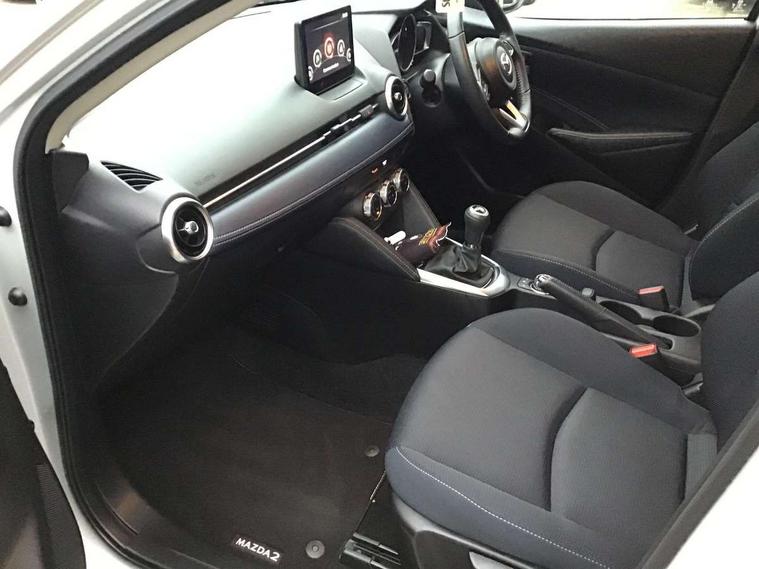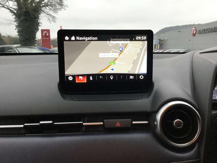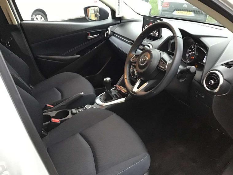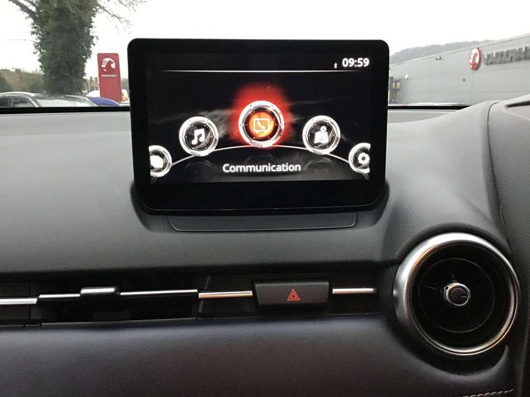 Adjustable speed limiter, Analogue speed display meter, Cruise control, Digital instrument cluster, Digital rev counter, E-call, Emergency stop signalling system, Engine start/stop button, Integrated bluetooth, Lane departure warning system, Lane keep assist, Mazda connect with 8" colour touch screen, Navigation system, PAS, Rear parking sensor, Service indicator, Trip computer, Wireless Apple CarPlay and wired Android Auto, i-stop, AM/FM/DAB radio with 6 speakers with USB and AUX inputs, Multimedia Commander including separate volume dial, Steering wheel mounted audio/bluetooth controls, Auto dimming rear view mirror, Auto headlight levelling, Body colour door mirrors, Body coloured front bumper with bright lower bezel, Body coloured rear bumper with bright lower mouldings, Chrome exhaust tailpipes, Chrome finish signature wing on front grille, Chrome front lower bezel, Chrome rear lower bezel, Coming/leaving home lighting function, Dusk sensing headlights, Electric adjustable/heated/folding door mirrors, Electric front/rear windows with one touch auto up/down for driver's window, Gloss black front grille, LED Headlights, LED indicator lights, LED third brake light, Privacy glass, Rain sensing front wipers with adjustable sensitivity and speed, Rear side wing doors, Rear wiper, Shark fin antenna, Signature LED daytime running lights, 3 seat bench in 2nd row, 60/40 split rear seats, Climate control air conditioning, Cloth upholstery, Driver, Front passenger and two rear grab handles with coathooks, Drivers seat manual slide recline and height adjustment, Drivers/front passengers covered vanity mirrors and drivers ticket holder, Folding rear seats, Front centre storage with two cupholders, Front head restraints, Front passenger and driver door pockets, Front passenger seat manual slide, recline and height adjust, Front passenger seatback pockets, Gear shift indicator, Glovebox, Interior courtesy light with integrated spotlight, ISOFIX child seat anchorage points attached on outer rear seats, Leather handbrake, Leather steering wheel and gear knob, Luggage compartment light, Satin silver dials, Single front passenger seat, Three height adjustable rear head restraints, Tilt/telescopic adjustable steering wheel, 2x3 point front seatbelts with pre-tensioners, 3 point seatbelts on all rear seats, Anti-lock braking system (ABS), Autonomous emergency braking, Collision mitigation braking system, Dynamic stability control + Traction control, ESP, Front and rear curtain airbags, Front driver, passenger and rear seat seatbelt warning, Front dual stage driver and single stage front passenger airbags, Front side airbags, Front smart city brake support, G-Vectoring control plus, Hill launch assist, Manual child lock in rear doors, Passenger airbag cut-off switch, Tyre pressure monitoring system, Deadlocking system, Immobiliser, Power door locks, Remote central locking, Smart keyless entry, Thatcham accredited alarm and immobiliser, Dark blue soft touch dashboard, 16" Bright finish alloy wheels, Emergency tyre repair kit,