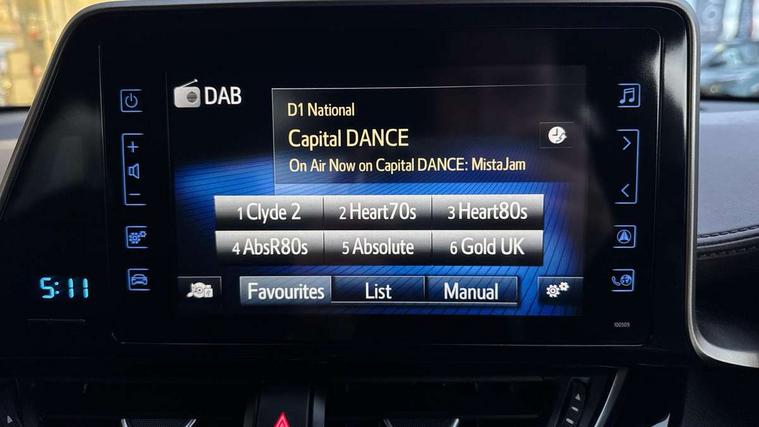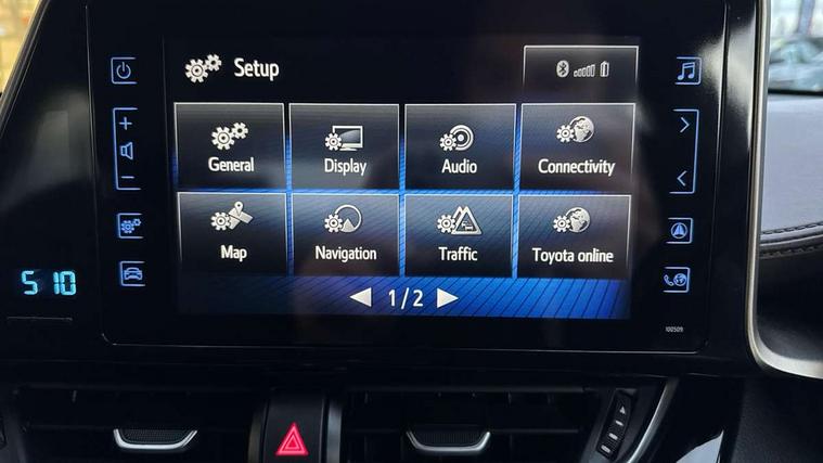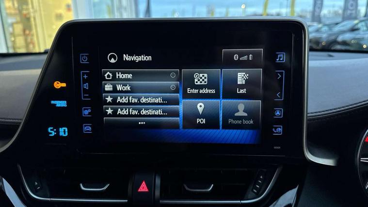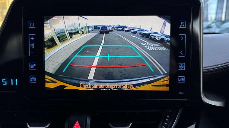 4.2" Colour TFT driver information display, 8" touch screen, Adaptive cruise control, Adjustable speed limiter, Bluetooth system, Collision prevention assist, Lane change assist and blind spot monitor, Lane departure warning system, Lights on warning, PAS, Rear cross traffic alert, Reversing camera, Touch 2 Go navigation system, Traffic sign recognition, Trip computer, Vehicle Stability Control (VSC), 6 speakers, Auxiliary input socket, DAB Digital radio, Steering wheel mounted controls, USB connection, Auto dimming rear view mirror, Auto folding mirrors, Auto high beam, Body colour door handles, Body colour heated door mirrors, Body coloured bumpers, Electric folding/heated door mirrors with integrated indicators, Follow me home headlights, Front and rear electric windows, Front fog lights, Heated rear windscreen, LED daytime running lights, LED rear lights, Privacy glass, Rain sensitive windscreen wipers, Rear spoiler, Rear wiper, Shark fin roof aerial, 12V Accessory socket, Ambient lighting, Child seat anchorage points, Chrome interior door handles, Driver/passenger sunvisors and illuminated vanity mirrors, Dual zone automatic air conditioning, Folding rear seats, Front and rear door pockets, Front centre armrest, Front cupholders x 2, Front head restraints, Glovebox illumination, Heated front seats, Height adjustable drivers seat, Illuminated door sills, Illuminated entry system, Leather gear knob, Leather upholstery, Lumbar support, Nappa leather steering wheel, Rear headrests, Tilt/telescopic steering column, Whiplash Injury Lessening (WIL) feature (active headrest) for seats, Parking pack - C-HR, 3x3 point rear seatbelts, ABS+EBD+Brake assist, Airbag deactivation switch, Driver/Front Passenger airbags, Driver/front passenger side airbags, Drivers knee airbag, ESP + traction control, Front and rear curtain airbags, Front and rear seatbelt reminder, Hill start assist control (HAC), Rear child proof door locks, Road sign information display, Toyota safety sense, Tyre pressure monitoring system, Alarm, Immobiliser, Remote central locking, Smart entry, Tyre repair kit,