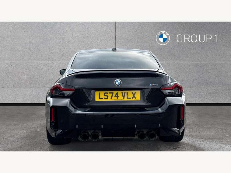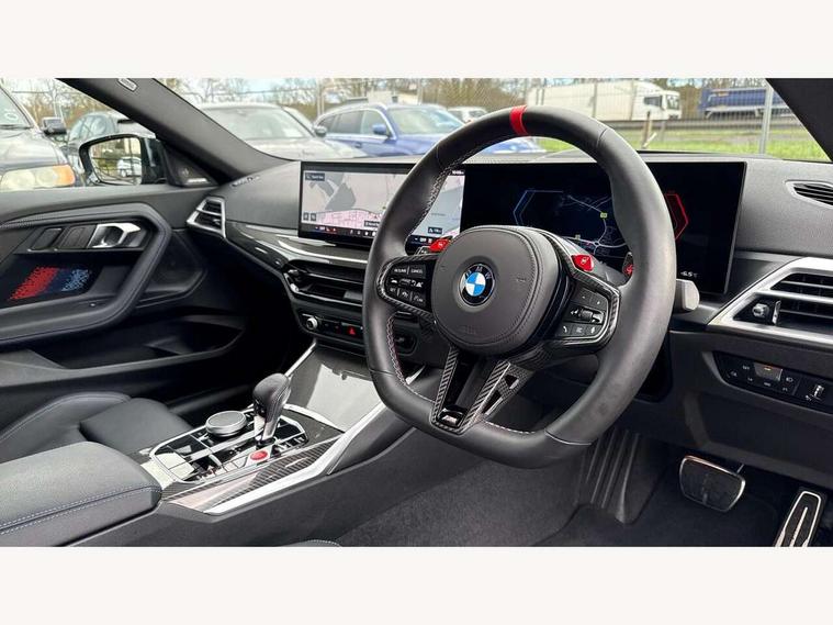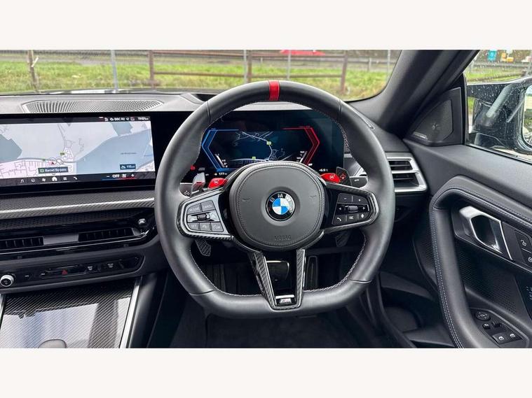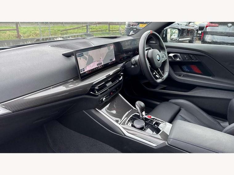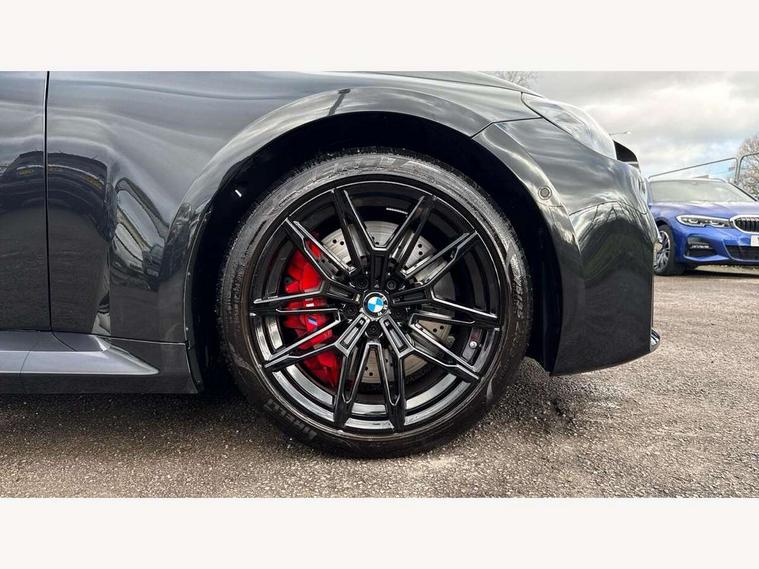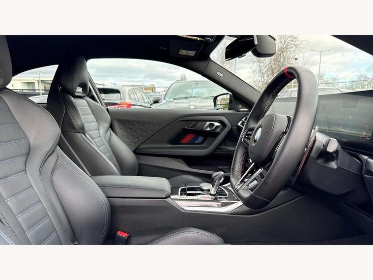 Active Guard, BMW ConnectedDrive online services, BMW legal emergency call, BMW Live Cockpit Professional including Full colour Head up display with configurable HUD contents, BMW Teleservices, Check control system, Configurable dashboard display, Control Infotainment, Digital owner's manual, Drive off assistant, Driver attention warning, Engine start button, Exterior temperature display, Flat tyre monitor, Language version English, Oil sensor for level and grade, On board diagnostics, On board documentation English, PAS, Service interval indicator, Shifting point display, Start/stop system, Storage for wireless charging, Travel data recorder, Trip computer, Voice control for audio, climate, telephone, navigation, Widescreen display, M Adaptive suspension, M Drive Professional including track mode, laptimer, traction control & Drift analyser, M Sport differential, M steptronic sport transmission with drivelogic, DAB tuner, Harman/Kardon surround sound audio system with 464W power digital amplifier, 9 channels and 14 speakers, Harman/Kardon surround sound system, Personal eSim, Adaptive LED Headlights, Automatic headlamp activation, Automatic headlamp levelling, Door mirror integrated indicators, Dynamic brake lights, Electric adjustable heated door mirrors, Electrochromic interior rear view mirror, Exterior mirrors with memory function and automatic parking function, Fading support, Follow me home headlights, Front and rear bumper system, Front electric windows, Headlight beam throw control, Heat protection, sun protection glazing, High beam assistant, LED 3rd brake light, LED daytime running lights, LED indicator lights, LED number plate light, LED rear lights, M high gloss shadowline extended, M high gloss shadowline exterior trim in mirror triangle cover, mirror cover panel, mirror bezel and window border, M lights shadowline, Rain sensor, Rear boot, Sun protection glass, Trailer stabilisation logic, Variable front intermittent wipers, 12V power socket in front centre console with blanking plug, 2 cupholders, 2 rear head restraints, 2 rear seats, 3 spoke leather M multi-function steering wheel, Ambient lighting, Black velour front and rear floor mats, Compartment in front of cupholder, Driver and front passenger heated seats, Driver/passenger electric lumbar adjustment, Electrically adjustable front seats - driver seat with memory, English handbook, Folding rear seat head rests, Front and rear door exit lights, Front and rear footwell lights, Front centre armrest, Front door pockets with bottle holders, Front door sill strips with aluminium inlays and M2 labelling, Front interior light, Front M Sport seats, Front reading lights, Glove compartment, Glovebox light, Heated steering wheel, Height adjustable front headrests, Illuminated armrest storage compartment, Isofix child seat for two outer rear seats, Luggage compartment lighting, M Accent Surfaces Illuminated: Highlighters in the door trim inlay panels and light module in the instrument cluster with M stripes, M Anthracite headlining, Manually adjustable steering column, Rear armrest, Single front passenger seat, Storage compartment in rear doors, Storage tray and compartment with cover in centre console, Through loading system with 40/20/40 split folding rear seat, Two zone automatic air conditioning, Vanity mirror lights, BMW Live cockpit plus pack - M2, Comfort access pack - M2, Connected package professional - M2, Driving Assistant package - M2, Interior and exterior mirror package - M2, Parking assistant package - M2, Storage compartment package - M2, 4 x 3 point seatbelts, ABS/EBD, Automatic Stability Control (ASC), Cornering brake control (CBC), Crash sensor, Curtain airbags, Dry braking, DSC - Dynamic Stability Control, Dynamic brake control, Electromechanical parking brake, Emergency door unlock, First aid kit, Front airbags for driver and front passenger, Front passenger airbag deactivation, Head airbags for all 4 outer seats, Height adjustable front seatbelts, M seat belts, PC iBrake (Post crash approach control warning with light braking function), Seatbelt pretensioners with load limiters, Seatbelt reminder, Side airbags for driver and front passenger, Tyre pressure monitoring system, Warning triangle, Alarm system, Drive away door locking, Immobiliser, Locking wheel bolts, Remote central locking, Tyre repair kit,