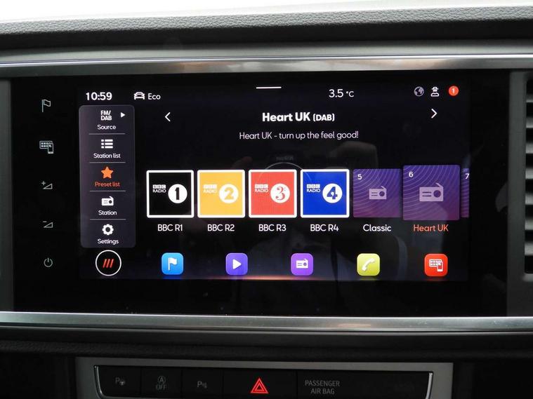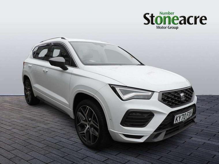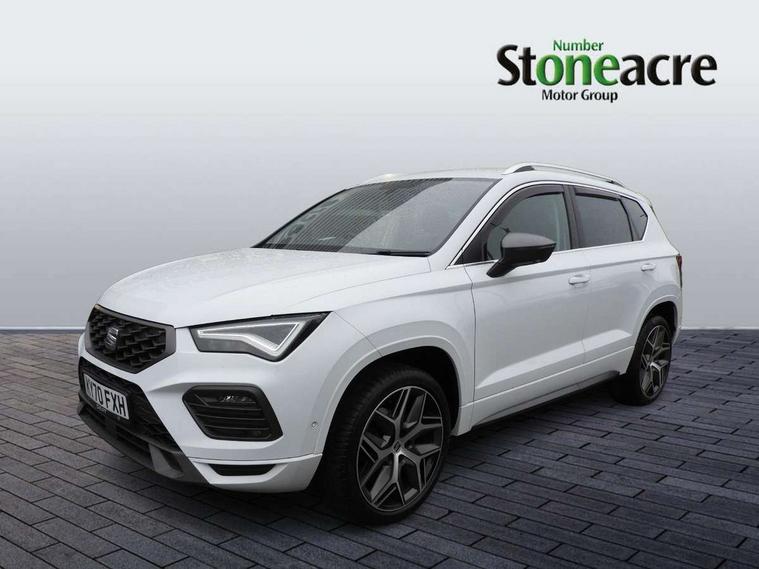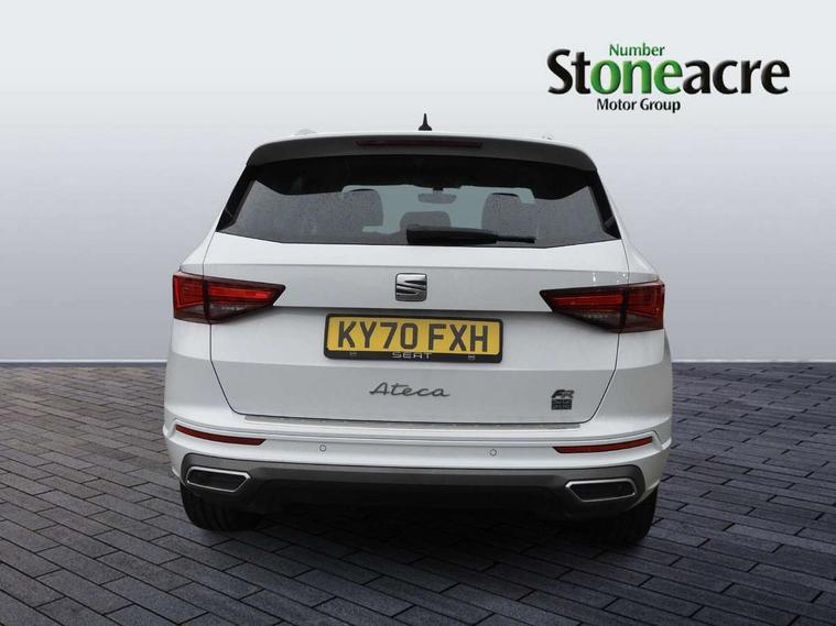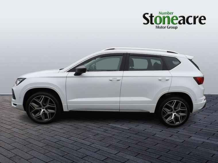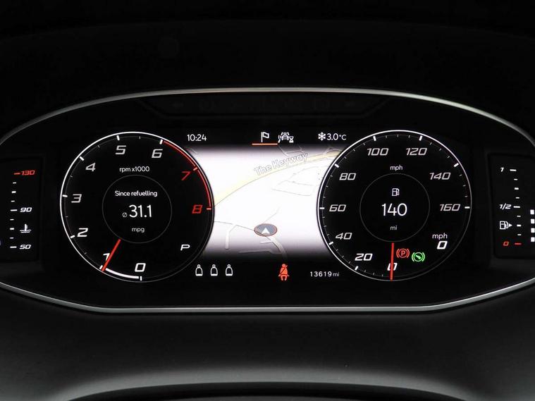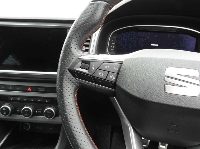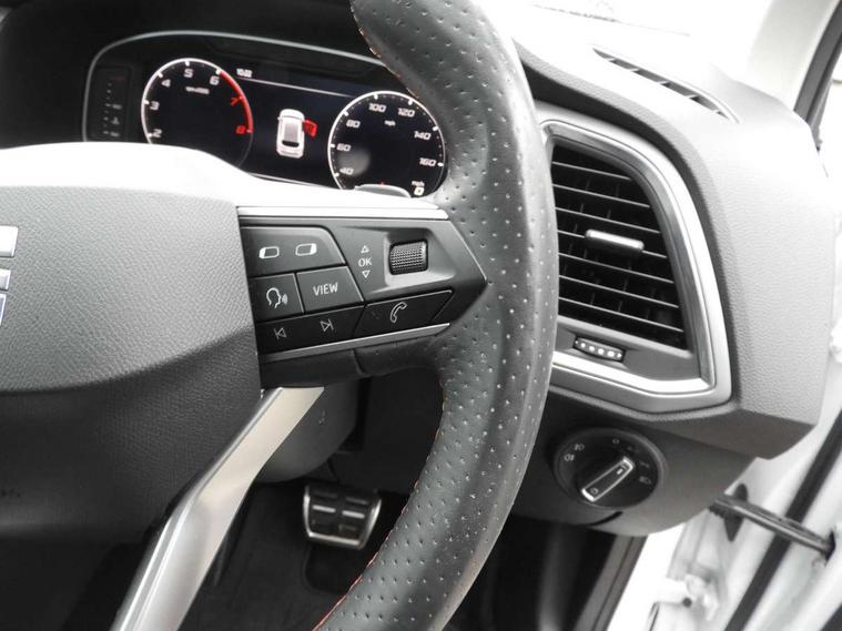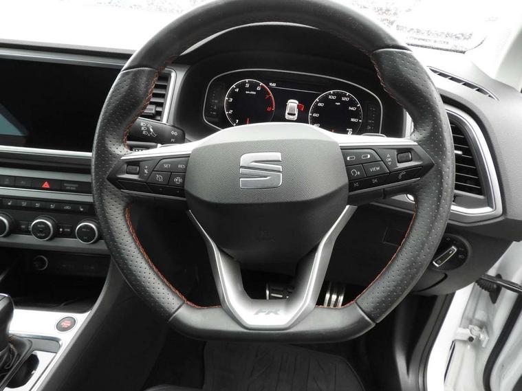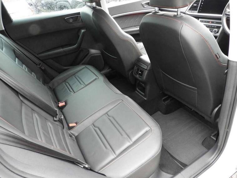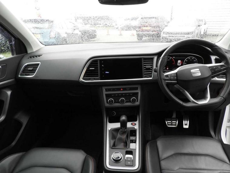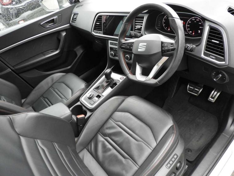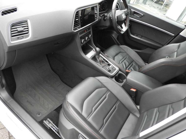 Cruise control system with speed limiter, Digital cockpit, Outside temperature gauge, Progressive power assisted steering, SEAT drive profile with driving experience button - Normal, Sport, Eco and Individual mode, gearshift, steering and throttle response, Self parking functionality (includes front and rear parking sensors), Trip computer, Wireless full link smartphone integration, Wireless phone charger, Steering wheel mounted audio/phone controls, Body colour bumpers, Body coloured wheel arch surrounds, Chrome roof rails, Chrome side window trim, Cosmo grey front grille frame, Dark tinted rear windows, Daytime running lights, Door mirrors with welcome light silhouette, Dynamic headlight range control with self adjusting whilst driving, Electric adjustable/heated/folding door mirrors, Front and rear electric windows, Full LED headlamps with lens and LED front fog lamps with cornering function, Illuminated aluminium front door sill, LED rear tail lights with dynamic indicators, Rear fog lights, Rear spoiler, Rear wash/wipe, Simulated exhaust pipes in chrome frame, 12V socket in front, 60/40 split folding rear seat, Aluminium pedals, Dual zone climate control, Electric adjustable driver seat with lumbar adjustment, Front and rear head restraints, Front centre armrest, Front seat back storage pockets, Heated front seats, Height adjustable passenger seats with lumbar adjustment, ISOFIX points in outer rear seats with top tether anchorage points, Leather steering wheel and gear knob, Leather upholstery with front sports seats, Multicoloured ambient lighting with LED interior illumination, Rear armrest and easy back seat release mechanism from boot, Steering wheel mounted gearshift paddles, Storage compartment in roof console for sunglass, Convenience pack - Ateca, Interior lighting pack - Ateca, Navigation system pack with DAB - Ateca, 3x3 point rear seatbelts, ABS, Traction control system (TCS), Electronic stability control (ESC) and Electronic differential lock system (XDS), Airbags - Driver and front passenger airbag with deactivation, front side, two curtain and driver's knee airbags, Electric parking brake with auto hold function, Front and rear seatbelt reminder, Front assist with autonomous emergency braking, Hill hold control, Tiredness recognition system, Traction control, Tyre pressure monitoring system, Alarm, Keyless entry, Locking wheel bolts, Chrome interior detailing, 19" Exclusive machined alloy wheels with decorative inserts 36/7 in cosmo grey,