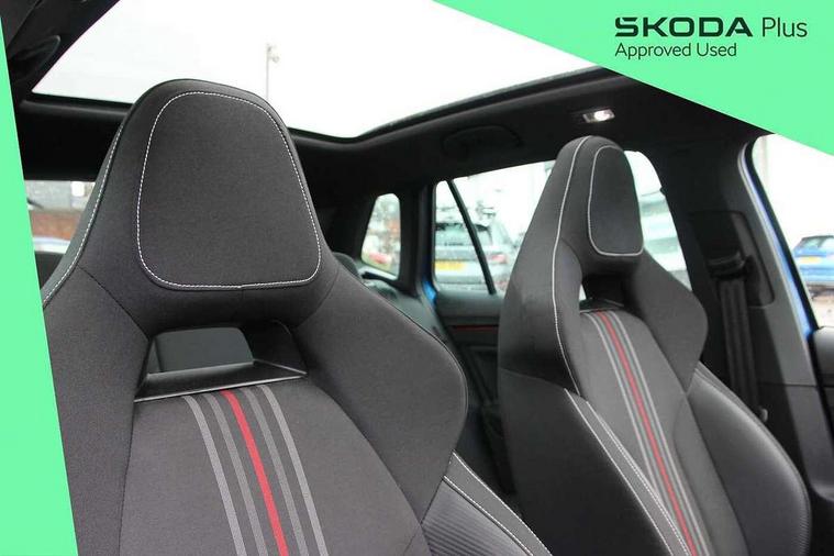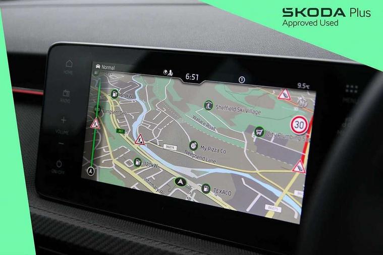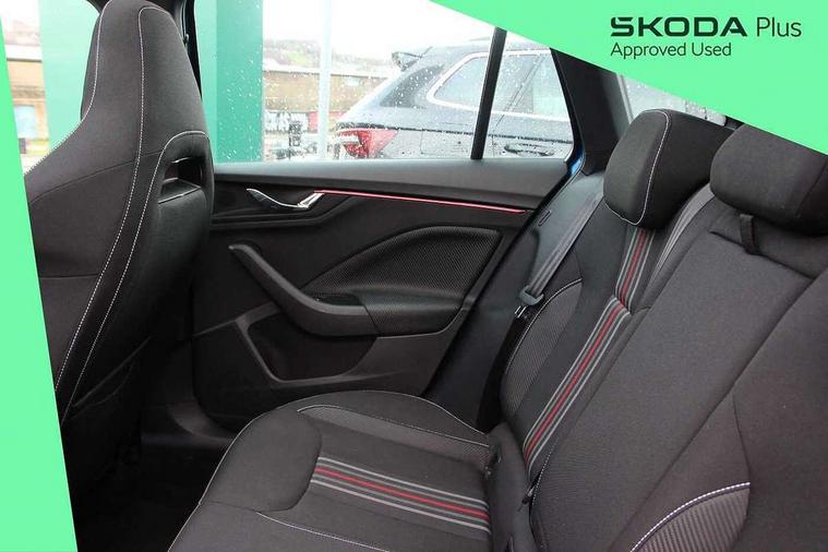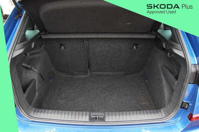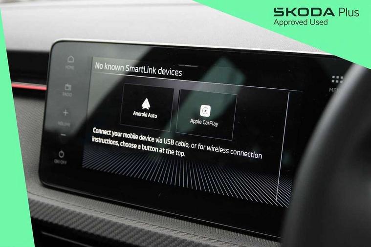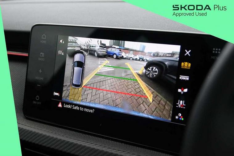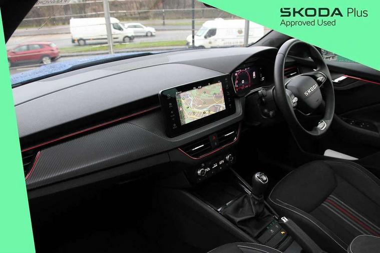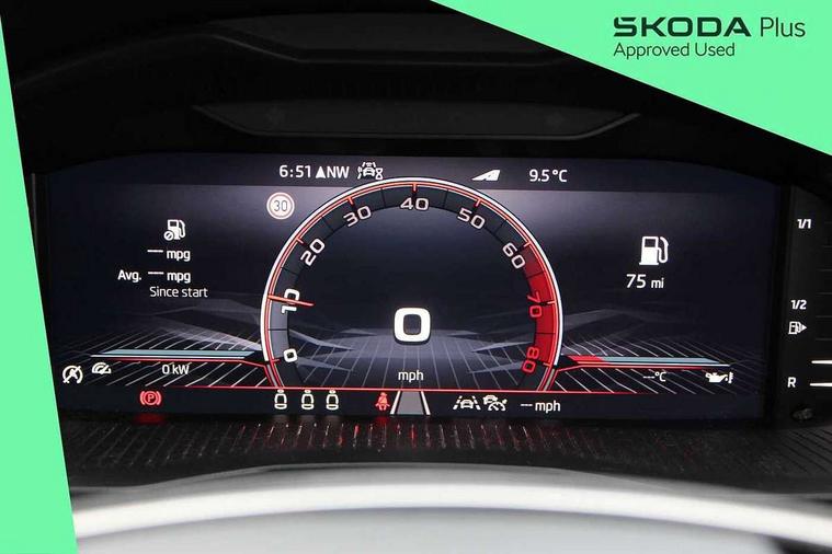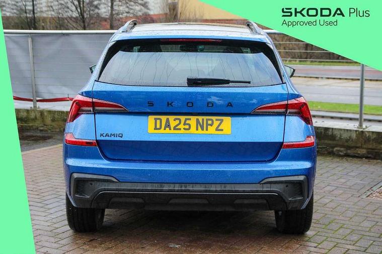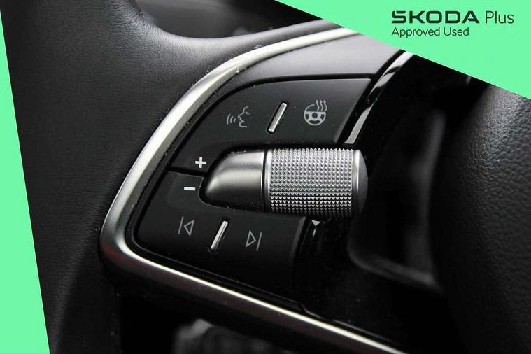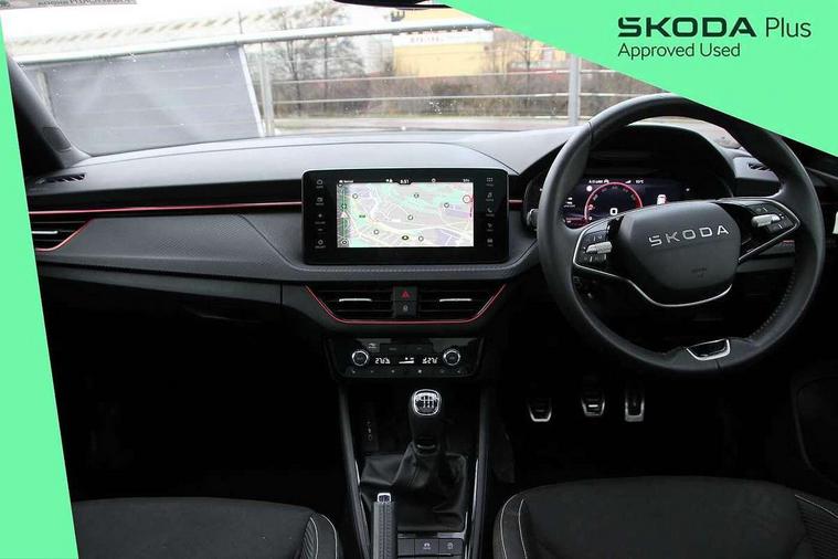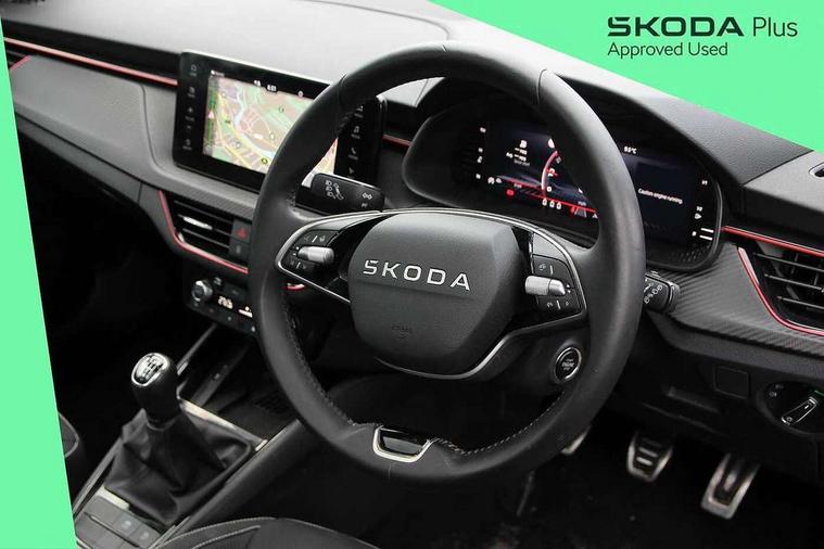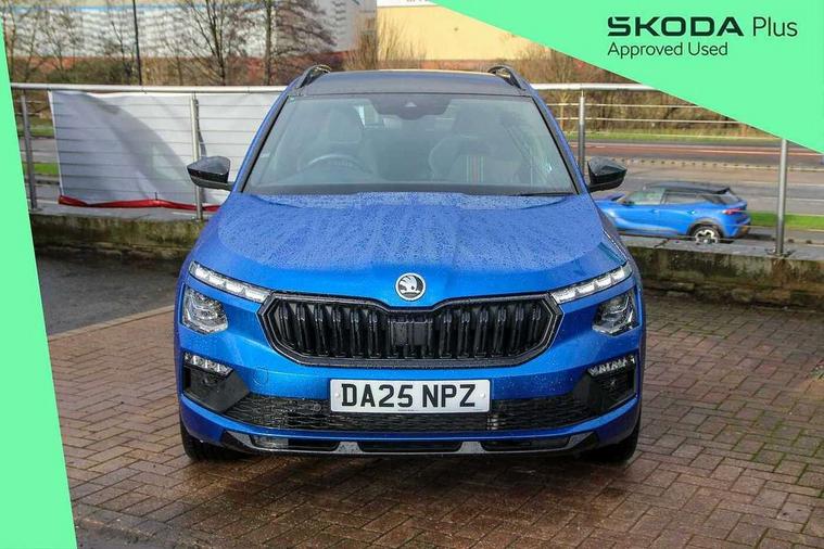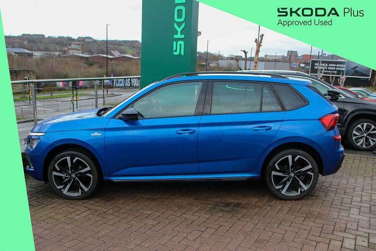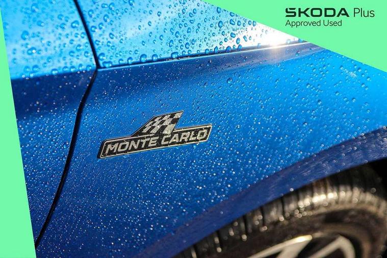 Advanced driver attention and drowsiness monitor, Bluetooth system, E-call, Front assist system, PAS, Rear parking sensors, Rear view camera, Service indicator, Speed limiter, Traffic sign recognition, Virtual cockpit with 10.25" display, Voice control system, Wireless smartlink, 4 USB C ports, 8 Speakers, 9.2" Skoda navigation display, DAB Digital radio, Auto dimming rear view mirror, Automatic headlight control with coming home and leaving home feature, Black door mirrors, Black radiator grille, Black rear diffuser, Black roof spoiler, Body colour bumpers, Body colour door handles, Boot lettering in black, Extended tailgate glass, Fixed panoramic sunroof with black roof rails, Front and rear electric windows, Heated rear window, LED daytime running lights, LED high beam, LED low beam, LED third brake light, Light sensors, Monte carlo plaque, Privacy glass, Rear side wing doors, Rear wiper, Ticket holder inside windscreen, 12V socket in luggage compartment, 3 seat bench in 2nd row, Aluminium pedals, Ambient lighting in white/red, Art leather carbon decor inserts, Art leather carbon door inserts, Black roof lining, Cargo elements, Chrome inner door handles, Driver and passenger sun visors with vanity mirror, Dual zone climate control, Front and rear roof lights, Front centre armrest, Front head restraints, Glove compartment with illumination, Height adjustable driver seat, Height adjustable front passenger seat, Ice scraper, Inner circulation control with pollen filter, ISOFIX on front passenger seat, Isofix preparation for back seats, Leather gearknob and handbrake lever, Manual lumbar support for front seats, Monte Carlo cloth upholstery, Net package and top tether hooks in boot space, Net under rear shelf, Pocket on the back of both front seats include mobile phone pockets, Rake/reach adjustable steering wheel, Reading lights, Rear centre armrests, Red hotstamping, Single front passenger seat, Sports seats, Textile floor mats, Third rear headrest, Top tether for front passenger seat, Umbrella in driver's door, Light and view plus package - Kamiq, 3x3 point rear seatbelts, Airbags - driver and front passenger, Disc brakes, ESP, Extended and predictive pedestrian/cyclist protection, Front passenger airbag deactivation switch, Front side airbags with curtain airbags, Hill hold control, Manual leather parking brake, Manual rear child locks, One tone horn, Seatbelt reminder for driver an co-driver, Traction control, Tyre pressure monitor, Anti-theft alarm system with interior monitoring, backup horn, towing protection and remote central locking with SAFE system, Anti-theft wheel bolts, Electronic engine immobilizer, 18" Ursa black diamond cut alloy wheels,