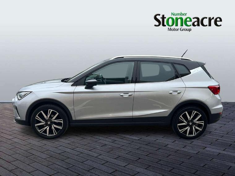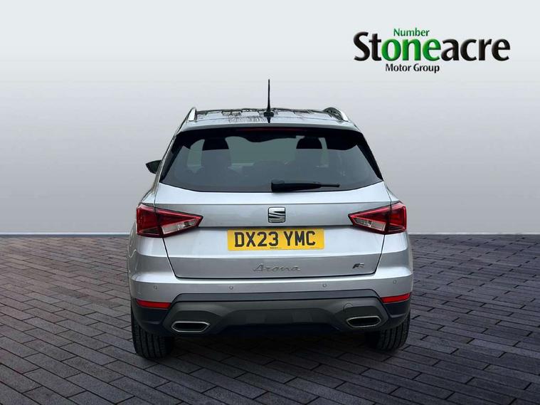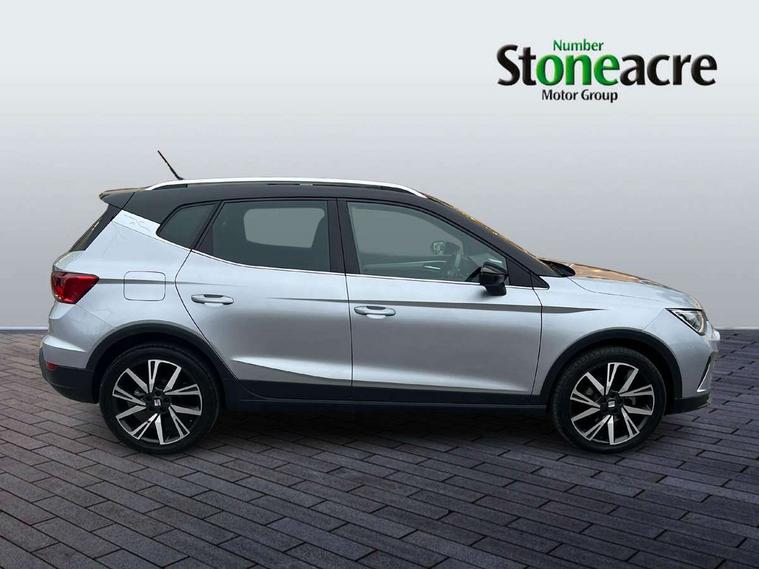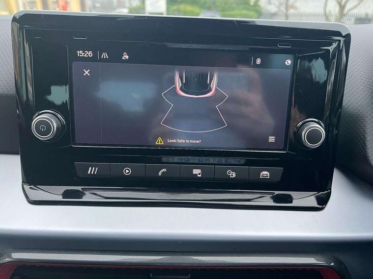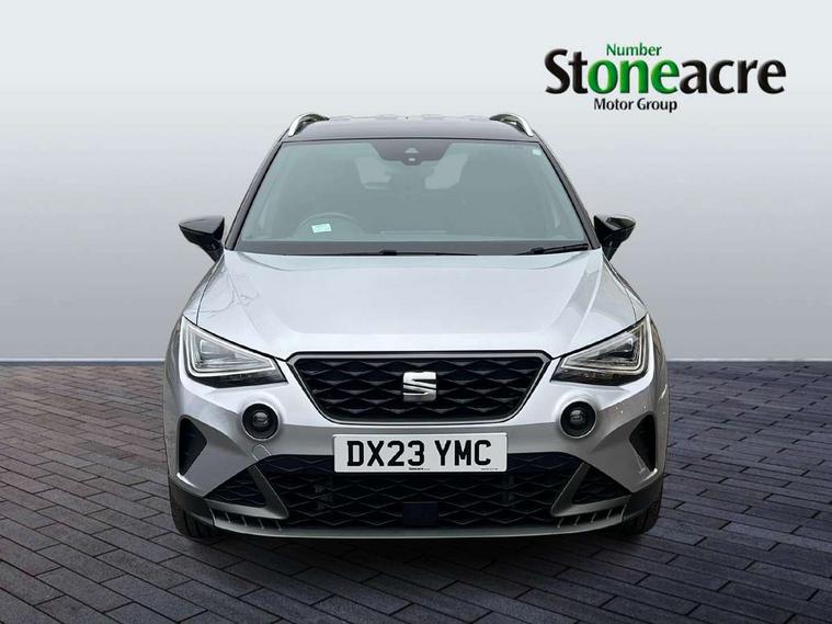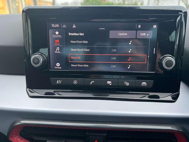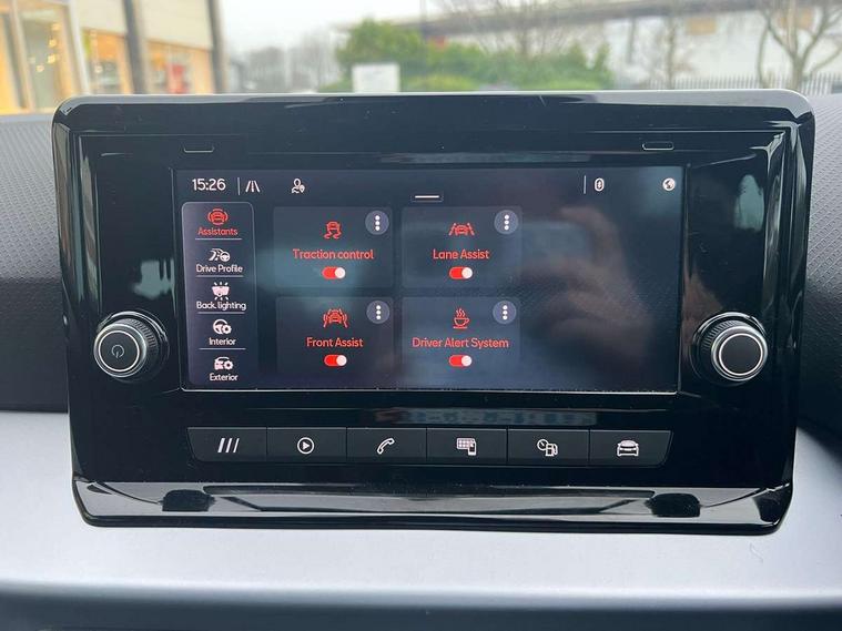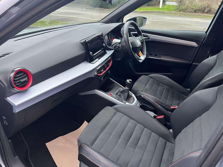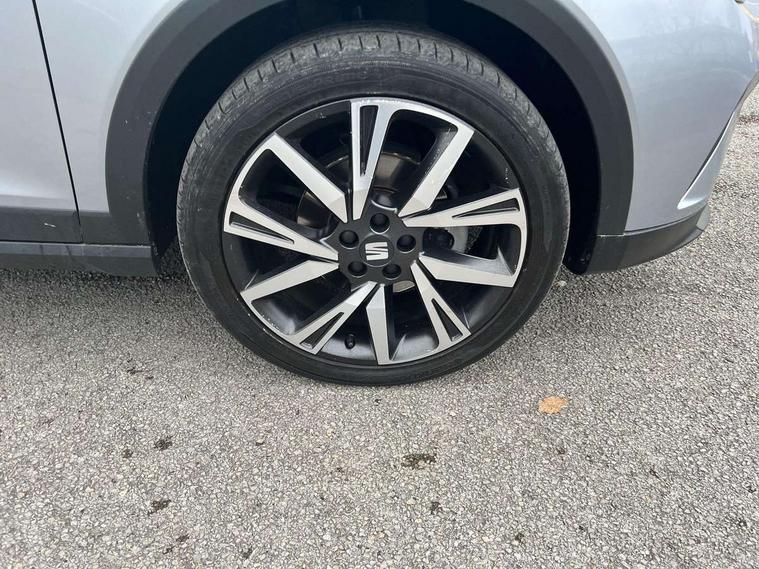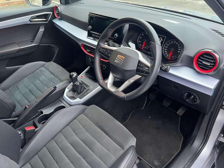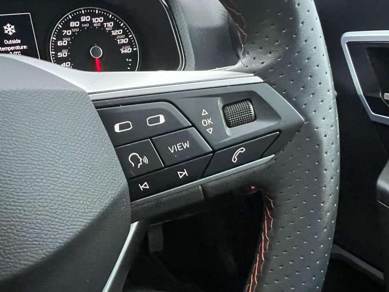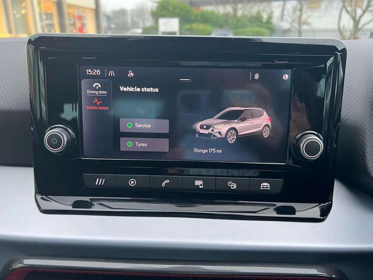 'Lights On' Reminder warning buzzer, Analogue cockpit with physical dials, Digital clock, E-call, Electric speed sensitive power steering, Full Link Smartphone Integration with Mirror Link, Apple Car Play, Google Android Auto with USB Type C cable for Apple and Android compatibility, Lane keeping system, Low fuel warning light, Outside temperature display, Rear parking sensor, RPM counter, Seat connect with safety, service and remote, SEAT Drive profile - Four different models normal-sport-eco-individual, steering response, throttle response, Trip computer, Wireless phone charger, Bluetooth interface for hands free and audio streaming, DAB digital radio and AM/FM radio, Media system with 8.25" colour touchscreen with USB port (type c), Steering wheel mounted audio controls, Anti theft roof antenna, Automatic activation of hazard warning lights, Body coloured bumpers, Body coloured door handle inserts, Chrome roof rails and window surrounds, Dark tinted rear windows, Dimming rear view mirror, Electric front/rear windows, Electrically adjustable and heated door mirrors, Front fog lights with cornering function and rear fog light, FULL LED automatic headlights with dynamic headlight range control, coming and leaving home, LED daytime running lights, LED rear tail lights and licence plate lights, Protective side mouldings, Rear side wing doors, Rear spoiler, Rear window wash/wipe, Roof colour door mirrors, Third brake light, Twin exhaust pipe styling hidden exhaust pipe, Visible VIN plate, Windshield wiper with intermittent control and potentiometer, 2 cupholders, 3 seat bench in 2nd row, 60/40 split folding rear seat, Aircare filter, Black interior roof, Double boot floor, Driver sunvisor with covered mirror + card holder, Dual zone climate control, Front comfort seats, Front courtesy light with 2x front and 2x rear reading lights, Gear shift indicator, Height adjustable front seats, Height/reach adjustable steering column, Illuminated boot, Instrument lighting with brightness control, Interior ambient lighting, Interior light in footwell, central console and door panel, ISOFIX points in outer rear seats with top tether anchorage points, Microsuede cloth upholstery, Passenger sunvisor with vanity mirror, Perforated flat bottomed leather steering wheel/gear knob/handbrake with red stitching and FR logo, Single front passenger seat, Two front and three rear height adjustable headrests, Interior chrome pack - Arona, 3 point seatbelts on all rear seats, ABS, Active front headrests, Child locks on rear doors, Driver and front passenger airbags with front passenger airbag de activation, front side and curtain airbags, Electronic stability control, Emergency Brake Assist (EBA) and front assist, Front and rear seatbelt reminder, Hill hold control, Multi-Collision braking, Tiredness recognition system, Traction control, Tyre pressure monitoring system, Alarm with back-up horn, Electronic engine immobiliser, KESSY Keyless entry and go, Locking wheel bolts, Remote central locking + deadlocks, Tow away protection, Titan black dashboard,