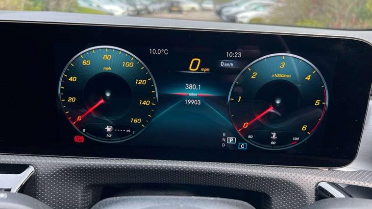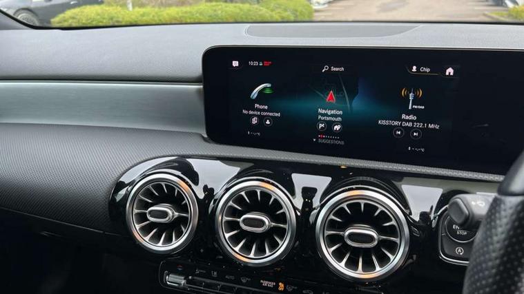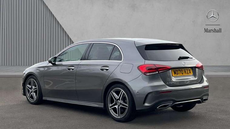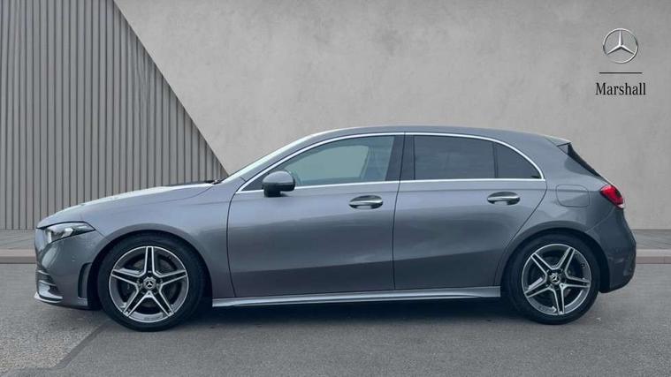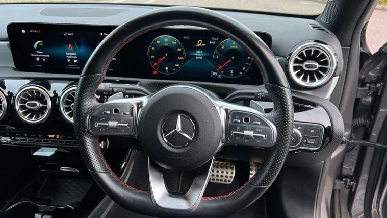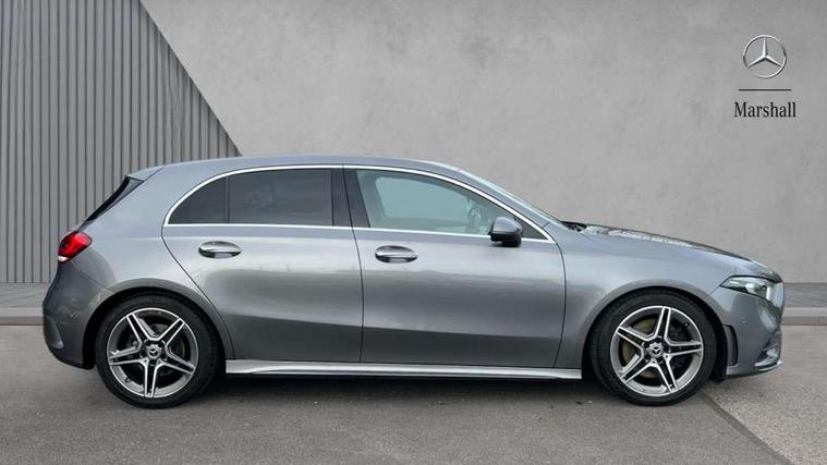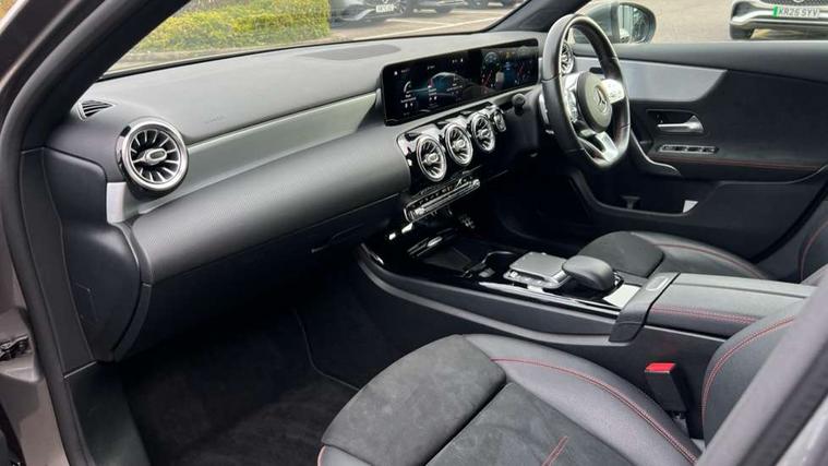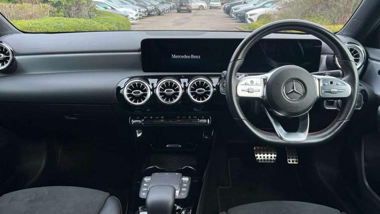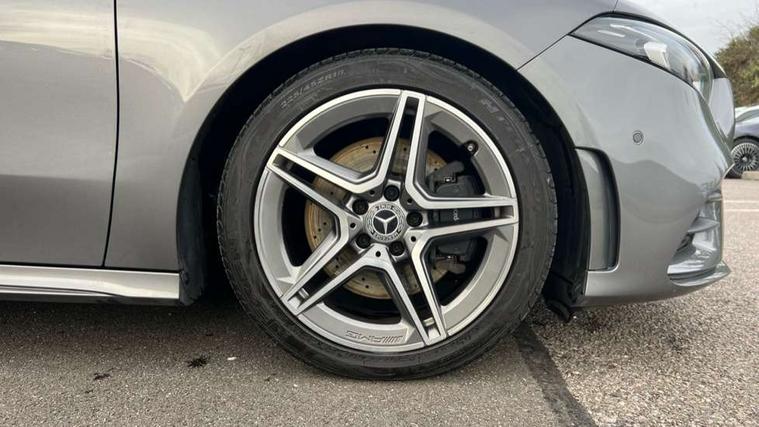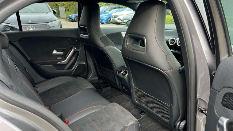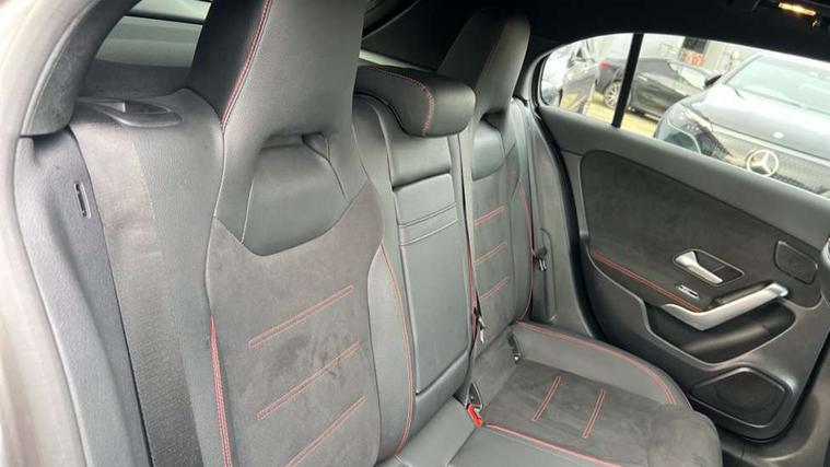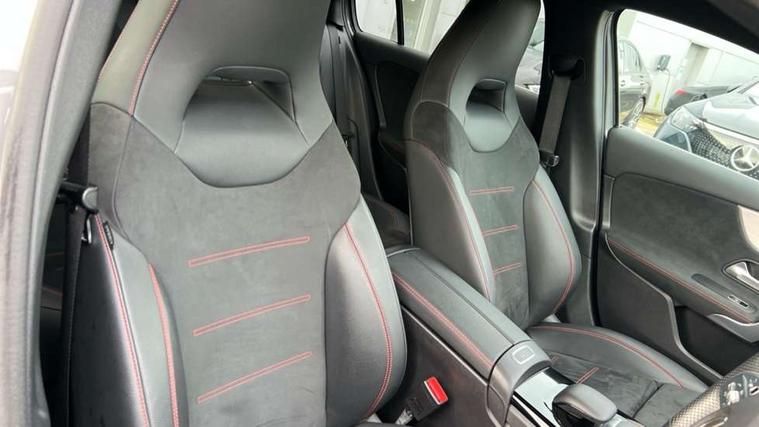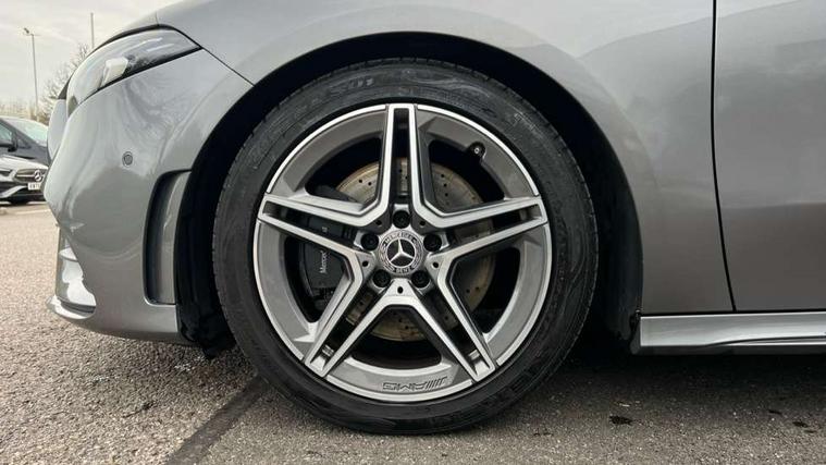 10.25" Digital instrument cluster display screen, 10.25" media display, 180 degree rear view camera with parking guidelines, Active parking assist with visual and audible warning of detected obstacles, Attention assist, Brake pad wear indicator warning light, Car wash mode, Cruise control + speed limiter, Direct steering, Dual bluetooth interfaces, DYNAMIC SELECT with a choice of driving modes (ECO, Comfort, Sport and Individual), ECO start/stop function, Fluid level warning indicator for fuel, oil, coolant and washer fluid, Hard-disk navigation, Hey Mercedes Voice activation, Lamp failure indicator, MBUX augmented reality for navigation, Mercedes me connect including emergency call system, accident recovery, breakdown and maintenance management, Mercedes me remote services, Outside temperature gauge, Owners manual in English, Pre-installation for private car sharing, Preinstallation for Mercedes Benz link, Service indicator (ASSYST), Smartphone integration with Apple CarPlay and Android auto, Speed sensitive power steering, Trip computer, Ultrasonic sensors positioned in the front and rear bumpers, Wireless charging, Lowered comfort suspension, Rear axle multi-link, 10 speakers, 2 USB ports (type C) in rear stowage compartment and one in front of center console, DAB Digital radio, MBUX multimedia system with DAB digital radio and touchpad including satellite navigation, Mercedes-Benz advanced sound system - 225W, 4 Electric Front and Rear windows, Adaptive brake lights, AMG bodystyling - Front apron with splitter in chrome, rear apron with chrome trim and chrome visible trim elements in tailpipe, Black weather strip, Body colour bumpers, Body colour door handles, Body colour side skirt, Body coloured door mirrors, Chrome beltline trim, Diamond radiator grille with chrome pins and silver louvre + chrome insert, Electric adjustable and heated door mirrors with integrated LED side indicators, Exhaust system - Twin visible tailpipes in polished stainless steel, Headlamp assist automatic headlamp activation, Heated glass rear windscreen + timer control, LED high performance headlamps with integrated LED daytime running lights, LED tail lamp, LED third brake light, Privacy glass, Radio aerial, Rain sensing windscreen wipers with two sensitivity settings, Rear fog lights, Rear wiper, Window line trim strip in chrome, 3 Spoke flat bottom leather multi function steering wheel with perforated leather in grip area, 40:20:40 split folding rear seats, Artico man-made leather/Microfibre Dinamica upholstery with red contrast stitching, Auto Mercedes-Benz child seat recognition sensor, Black air vents with surround in silver chrome, Black roof lining, Brushed stainless steel sports pedals with rubber studs, Controller on centre console with chrome surround, Floor mats with stitched edging and AMG lettering, Front centre armrest with storage compartment, Front seat backs luggage nets, Front seat cushion length adjustment, Galvanished gear shift paddles on steering wheel, Heated front seats, Height/reach adjustable steering column, Illuminated front door sills with changeable cover, Interior lighting - 64 colour Ambient lighting, Interior mirror with reading lamps in black and frameless, Manual height adjustable front seats, Rear armrest with 2 cupholders, Rear head restraints, Seat occupancy sensor for front passenger seat, Sports seats with integrated headrests, Stowage compartment in centre console with retractable cover, Sunvisors with illuminated vanity mirrors, Touchpad on center console, Twin front cupholders, Two zone thermotronic luxury automatic climate control, Light and sight pack - A Class, Mirror package - A Class, Seat comfort pack - A Class, 3 rear 3 point seatbelts, ABS with Brake Assist, Active bonnet, Active brake assist includes forward collision warning system with autonomous braking, Adaptive brake assist with hold function and hill start assist, Black seatbelts, Childproof locks manually operated for rear doors and electrically operated for rear power windows, Crash responsive emergency lighting, Driver and passenger head and side airbags, Drivers knee airbag, Dual stage driver/passenger airbags, Electronic parking brake, ESP curve dynamic assist, ESP with ASR, Front and rear seatbelt reminder, Front brake callipers with Mercedes Benz lettering, ISOFIX and top tether child seat fixing points in two outer rear seats, Tyre pressure monitoring system, Warning triangle and first aid kit, Window airbags, Alarm system/interior protection/immobiliser, Keyless entry lock/unlock, Keyless Go, Remote central locking and crash sensor with emergency opening function, Urban guard vehicle protection system with immobiliser and interior protection, Light aluminium with longitudinal grain interior trim, 18" AMG 5 twin spoke light alloy wheels in titanium grey with highsheen finish, Summer tyres, Tirefit sealant kit,