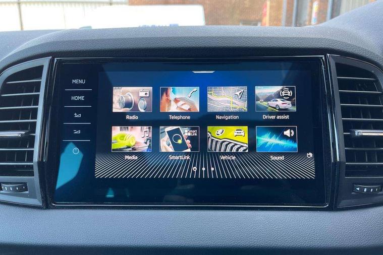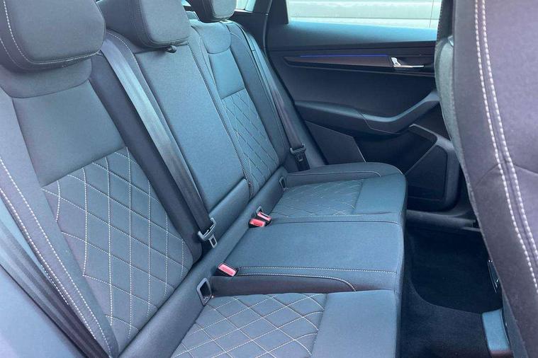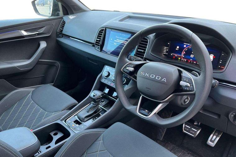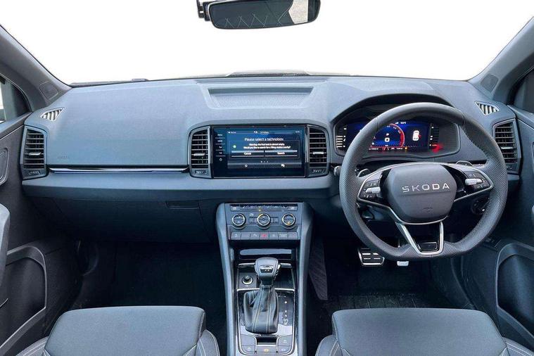 Advanced driver attention and drowsiness monitor, Emergency services call system, Outside temperature gauge, Sensor for driver assistance systems, Service interval indicator, SmartLink wireless for Apple and wired for Android, Start/stop system with regenerative braking, Traffic sign recognition, USB C Port x 2 in front centre console, Virtual Cockpit - 10.25" digital display, Virtual pedal with electrically operated boot door, Wireless smartphone charging, DAB radio with Bluetooth, USB connection, Acoustic glass, Aero front windscreen wipers with intermittent function, Auto dimming rear view mirror with light and rain sensors, Black door mirrors, Black electric window control buttons, Black radiator grille, Black roof rails, Body colour door handles, Electric front and rear windows with child proof lock, Extended rear roof spoiler, Front door steps with SportLine logo, Heated rear windscreen, LED daytime running lights, LED rear lights with high functionality welcome effect and dynamic indicators, Light assistant (coming/leaving home/tunnel light), Panoramic sliding sunroof, Plastic scuff plates in door apertures, Privacy glass, Protective door side sills in body colour, Rear diffuser, Rear side wing doors, Rear window wiper with washer system and intermittent control, Safety reflectors on front doors, Skoda lettering on tailgate in black, Sportline badge on front fender, Sports front and rear bumpers, Third brake light, Unique dark chrome design logo on alloy wheels, 1.5 litre bottle holders in driver and front passenger door panels, 12V socket in boot, 12v socket in front centre armrest with storage compartment and rear air vents, 2 x Tablet holder, 3 rear height adjustable headrests, 3 seat bench in 2nd row, 3 spoke sports leather heated multifunction steering wheel with DSG paddles, 4 foldable roof handles with rear coat hooks, Black floor carpet, Cargo elements in boot, Chrome inner door handles, Foldable hooks in the boot, Front head restraints, Height adjustable front three point seats belts with tensioners, Height/reach adjust steering wheel, Ice scraper, Illuminated glovebox, Illuminated luggage compartment, Isofix child seat preparation for front passenger seat, Isofix child seat preparation outer rear, Manual lumbar support for front seats, Pen holder, Pollen filter, Rear backrest release from boot, Rear boot cover, Rear package tray, Rear reading lights, Rear seats fixed folding and divided 60:40, Rubbish bin door, Safety vest holder, Single front passenger seat, Skoda lettering on steering wheel, Sportline decorative inserts, Storage box in upper central dashboard closed, Sunvisors with illuminated vanity mirrors, Textile floor mats, Ticket holder, Titan black interior ceiling, Umbrella under passenger seat, Under passenger seat storage compartment, Columbus pack - Karoq, LED Interior lighting pack with Skoda welcome logo - Karoq, Light Pack - Karoq, Non Smokers pack, Performance pack - Karoq, Winter plus pack with heated front and rear seats - Karoq, Automatic door unlocking in case of crash, Automatic fuel cut off in case of crash, Driver airbag, Electronic parking brake with auto hold function, Emergency rear braking signal, ESC (incl. ABS+MSR+ASR+EDS+HBA+DSR+RBS+MKB), Front side airbags, Head airbags, Hill hold control, Knee airbags, Passenger airbag with switch-off function, Pedestrian monitor, Power operated child safety locks, Seatbelt reminder signalisation and pretensioner for all seats, Three point seatbelts rear, Two tone horn, Tyre pressure monitor, Alarm with interior monitoring, back up horn and tilt sensor with safe function, Electronic engine immobiliser, Keyless entry and start/stop, Remote central locking with 2 remote folding keys, Black air vent surround, Black centre console, carbon door decor, Satin black dashboard, Satin black door trim, 19" Sagittarius anthracite alloy wheels, Anti-theft wheel bolts protection, Breakdown and tool kit,