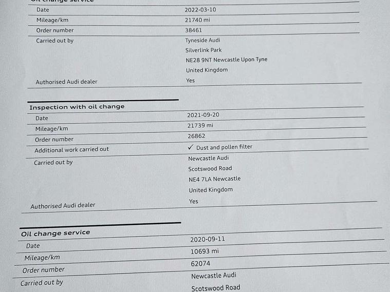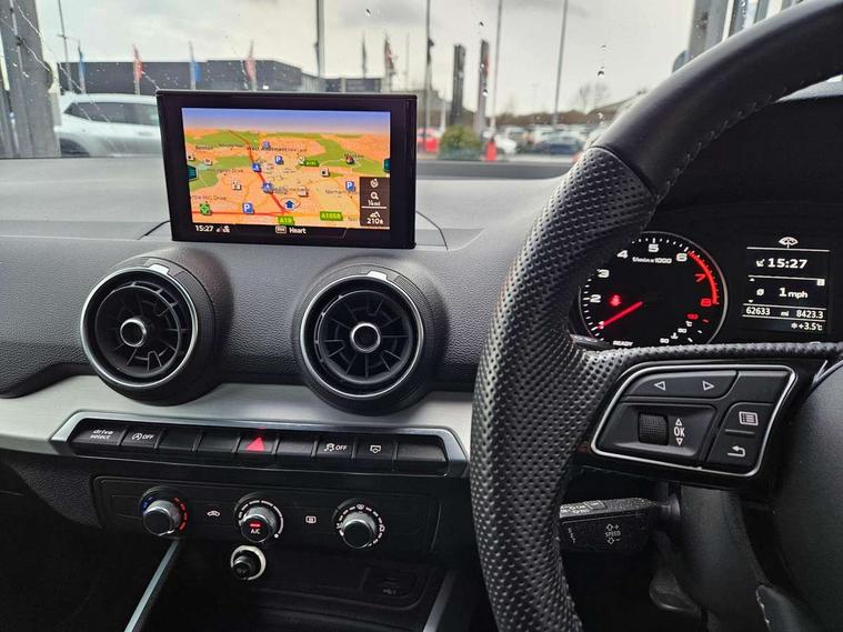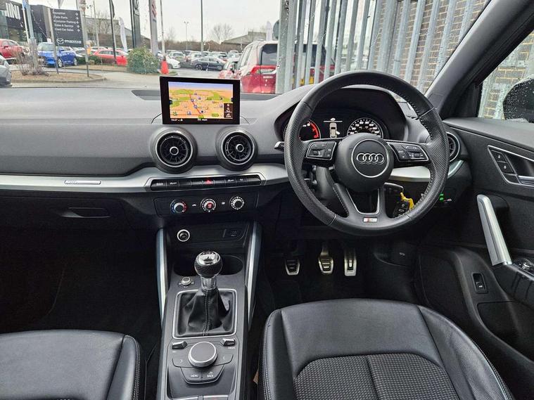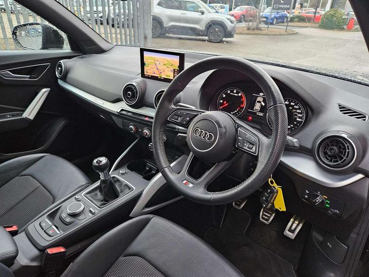Audi drive select, Audi smartphone interface, Automatic start/stop system with recuperation, Bluetooth interface includes bluetooth audio streaming, Cruise control, MMI - Multi Media Interface control system, MMI SD card integrated nav with 3D map display, dynamic route guidance with TMC, MMI search, natural voice recognition and myAudi special destinations, Power operated tailgate, Progressive steering, Service interval indicator, Dynamic suspension, 2 x SDXC card reader, Audi music interface - apple iPod, apple iPhone, USB storage media, compatible MP3 players, 2 x USB charging points and 1 x Aux-in, CD Drive, DAB digital radio and AM/FM radio, MMI radio plus with 7" colour MMI screen and MMI controller, Black window trims, Bumper in full body colour paint finish, Chrome exhaust tailpipe, Electrically adjustable and heated door mirrors with integrated LED side indicators, Front and rear electric windows, Front underbody guard and rear diffuser trim in selenite silver, Front windscreen with grey tinted sunband, Headlight washers, Interior mirror, LED headlights with LED rear lights + dynamic rear indicators, LED indicator lights, Manual folding door mirrors, Rain and light sensors, Rear wiper, S Line badges on the front wings, S Line body styling - front and rear bumpers, side skirts, radiator grille, rear diffuser insert and front air intakes, 60/40 split folding rear seat bench, Black cloth headlining, Electronically operated child locks, Floor mats with contrast stitching, Front centre armrest, Front headrests, Front sport seats with S embossed logo, Height/reach adjust steering wheel, Illuminated door sill trims with S logo, ISOFIX child seat mounting for front passenger with airbag deactivation and outer rear seat including top tether attachment point for outer rear seats, Manual seat adjustment including seat height adjustment for front seats, Stainless steel pedals, Storage compartments - Glovebox, cupholder compartment in centre console, storage compartment in rear centre console, front and rear door pockets, Three rear headrests, Non smoking pack - Q2, 3x3 point rear seatbelts, 6 airbags - Front, curtain and front side airbags, Electromechanical parking brake, Electronic stabilisation control including ABS, ASR and EDL, Extended and proactive pedestrian protection, Hill hold assist, Multi collision brake assist, Pre-sense front with pedestrian recognition, Seatbelt monitoring, Tyre pressure warning light, Warning triangle and first aid kit, Anti theft alarm, Anti theft wheel bolts, Central locking system with remote control key, Aluminium interior element,