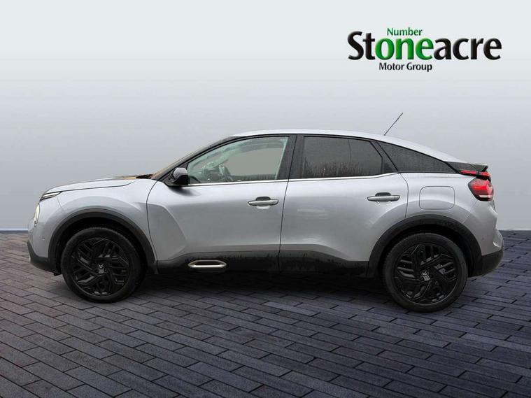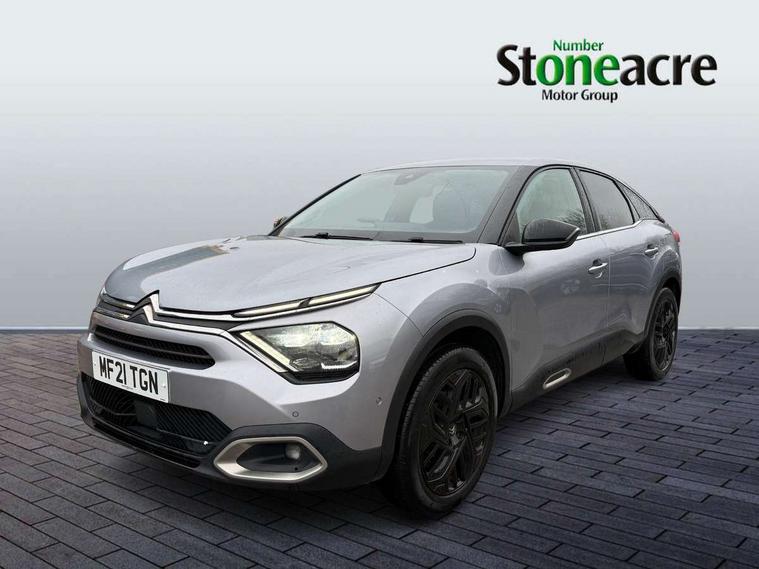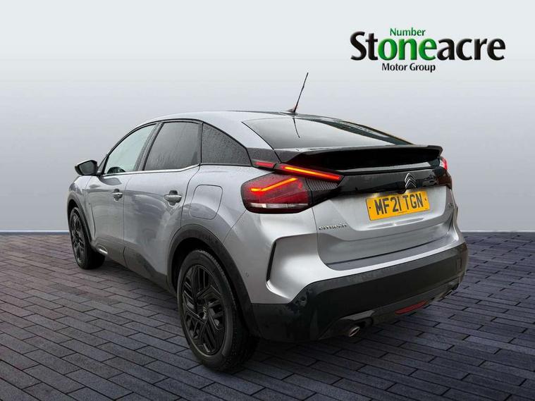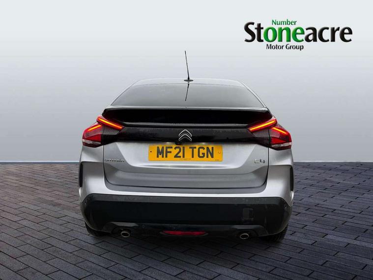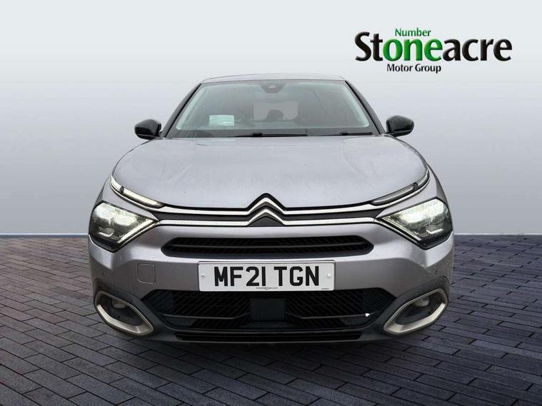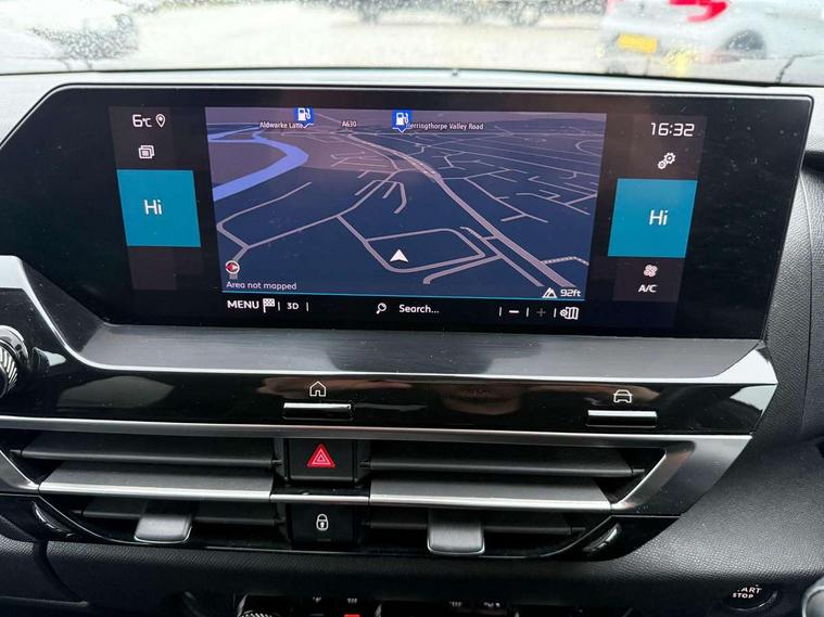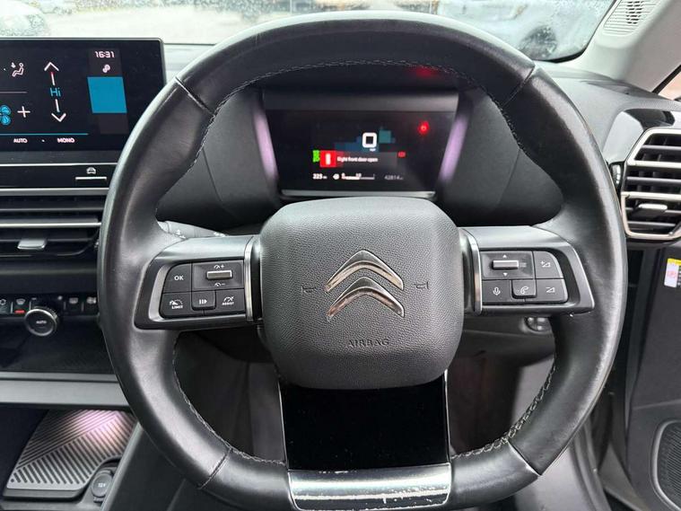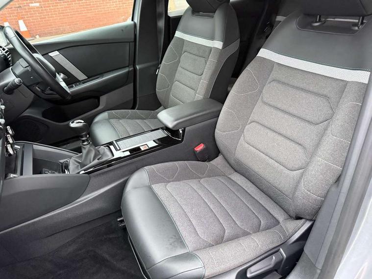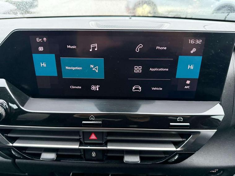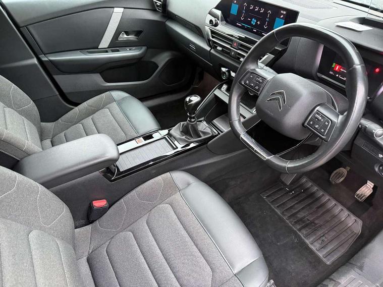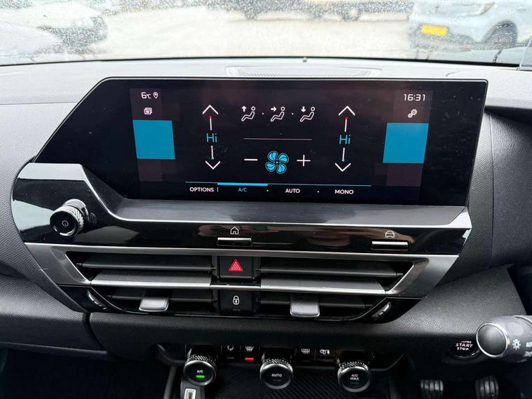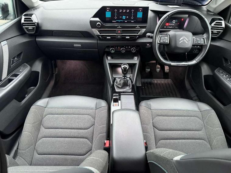 10" high resolution touchscreen user interface, controlling media, connectivity and vehicle settings, 5.5 inch backlit full TFT driver's instrument cluster, Active blind spot detection, Apple car play and Android auto, Citroen connect box emergency and assistance system, Citroen connect nav with speed cam and danger zones alert, Cruise control + speed limiter, Driver's head-up display, Electronic Power Steering (EPS), Front and rear parking sensors with flankguard, In-crash braking, Visio Park 1 (rear parking camera), Voice commands, Suspension with progressive hydraulic cushions - double hydraulic stops on front suspension and single on rear suspension, Auxiliary input socket, Bluetooth telephone and audio streaming, DAB Digital radio, Automatic headlights with high beam assist, Body colour bumpers, Body colour door handles, Dark tinted rear windows and side windows with chrome detail, Electrically heated, folding and adjustable external rear view mirrors with courtesy lighting, Electrochrome interior rear-view mirror with automatic day-night switching, Front and rear electric windows, Gloss black rear skirt, LED daytime running lights in V signature, LED front fog lamps with static cornering function, LED front headlamps, Obsidian black painted external rear view mirrors, Rain sensing automatic front windscreen wipers, Welcome and goodbye lighting, 12V power outlet, 1x USB Type-C socket charging & data connection and 1x USB Type-A socket in 1st row and 1x USB Type-A socket charging in 2nd row, 3 rear headrests, Boot light, Dashboard tray in front cabin, Deluxe leather steering wheel with two command blocks, Driver and passenger sunvisors with illuminated vanity mirrors, Dual zone automatic air conditioning, Front and rear LED interior lighting, Front head restraints, Height adjustable driver's seat with adjustable lumbar support, Height adjustable front passenger seat, Height and reach adjustable steering wheel, Map pockets in rear of front seats, Raised centre console with two cup holders, Split folding rear seats, Two position boot floor, High level acoustic insulation pack - C4/C4 X/e-C4 X, Safety pack plus - C4 Shine/ Shine Plus, 3x3 point rear seatbelts, ABS, Driver and front passenger airbags, Electric parking brake, ESP, Front seatbelt pretensioners, Hill start assist, Manual child lock in second row, Manual deactivation of front passenger airbag, Post collision safety brake, Row 1 and 2 curtain airbags, Row 1 side thorax airbags, Seatbelt unfastened on the move warning, Tyre underinflation detection, Anti-theft alarm (volumetric protection), Immobiliser, Keyless entry and start, Remote locking with deadlocks, 18" Aeroblade dark alloy wheels and smoke grey finish with anti-theft locking wheel, Puncture repair kit with compressor,