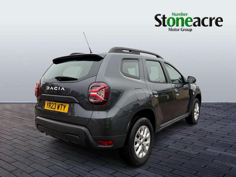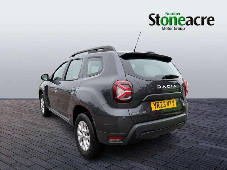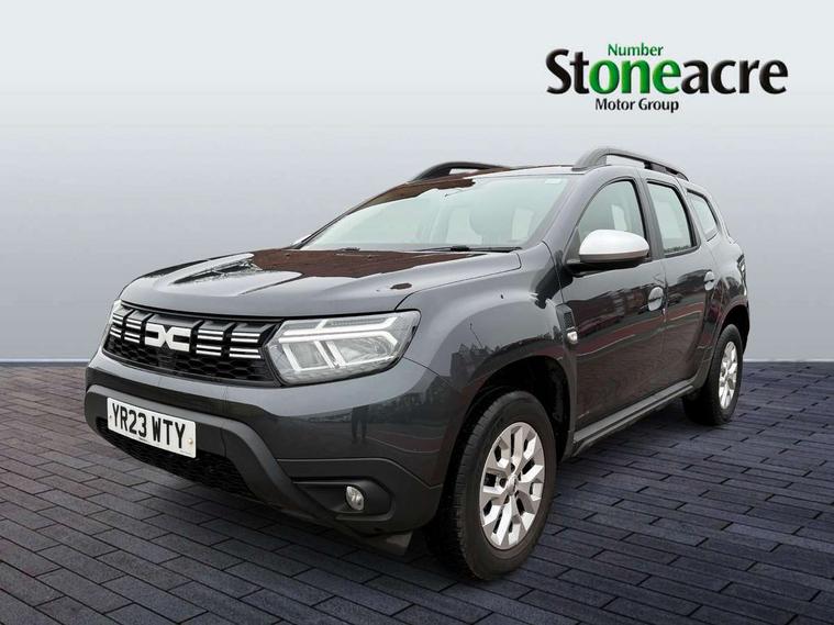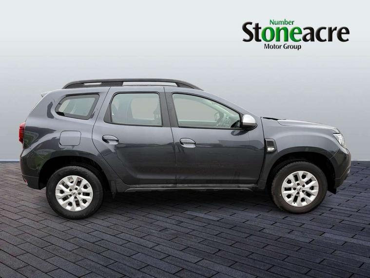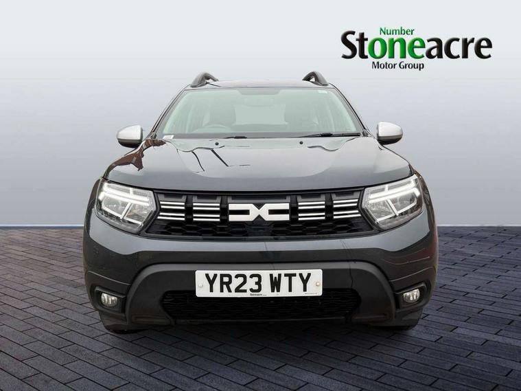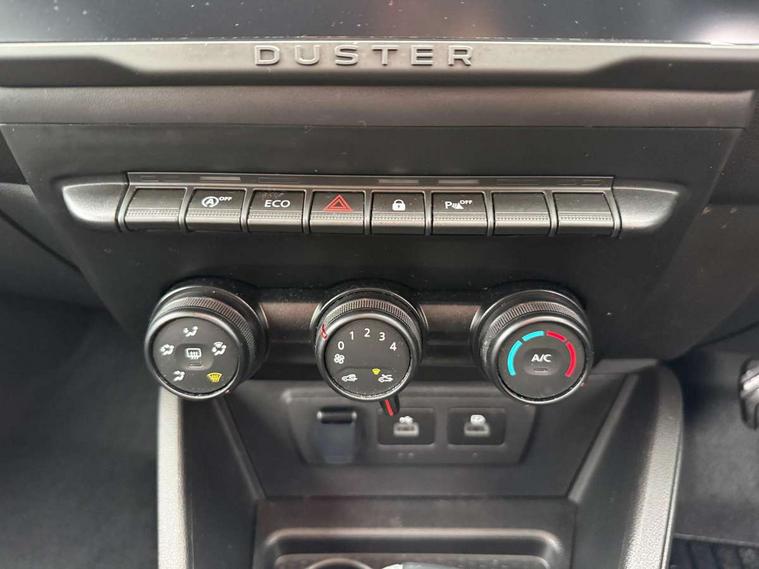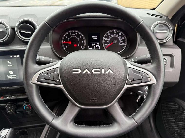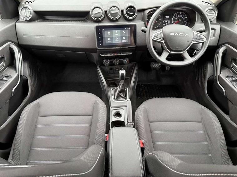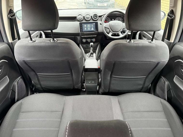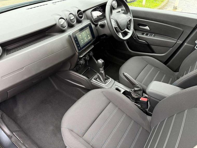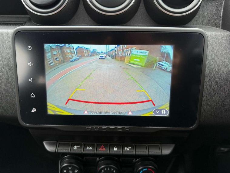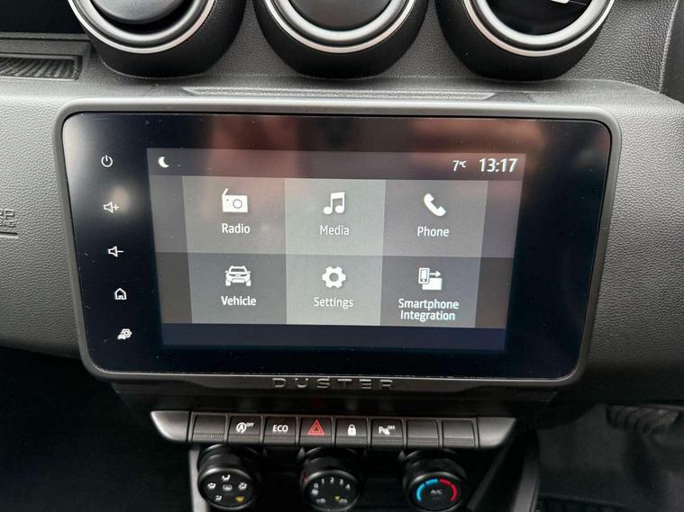 Cruise control and speed limiter, eCall emergency system, Eco mode, Electric power assisted steering, On board computer, odometer, trip computer, average fuel consumption, average speed, service indicator, outside temperature gauge, Rear parking sensors, Rev counter, Reversing camera, Stop/start system, 8" Media display with smartphone replication, 2 usb sockets and 6 speakers, Dacia plug and radio/MP3/USB/bluetooth/DAB/steering wheel control, 3 speed windscreen wipers, Black longitudinal roof bars with Duster inscription, Black side sills, Black/satin chrome tailgate trim with Duster inscription in black background and lettering, Body coloured door handles, Chrome front grille with hot stamping, Chrome logo surround on steering wheel, Daytime running lights, Drivers window one touch up/down, Dusk sensor, Electric adjustable/heated door mirrors, Electric front windows, Electric rear windows, Front and rear body coloured bumpers, Front door sill protection strip, Front fog lights, Heated rear window, High level third rear brake light, Rain sensor, Rear side wing doors, Rear spoiler, Rear wash/wipe, Satin chrome door mirrors, Tinted windows, Underbody protection skid plates, Y shaped LED headlights with rear LED lights, 3 rear height adjustable headrests, 3 seat bench in 2nd row, 60/40 split folding rear seat, Backlighted steering wheel buttons, Boot light, Driver seat lumbar adjustment, Fabric decorative insert on door panels, Fabric upholstery, Front head restraints, Front passenger reading light, Gear shift indicator, Height adjustable driver seat, Height adjustable front and rear headrests, Height and depth adjustable steering wheel, High centre console with driver armrest, Isofix points for child seats in both outer rear seats, Manual air conditioning, Map pocket on front seat backs, Passenger sunvisor with vanity mirror, Rear passenger reading light, Satin chrome interior door handles, Satin chrome lower steering wheel insert, Single front passenger seat, Soft feel leather steering wheel, 3x3 point rear seatbelts, ABS and Emergency brake assist, ASR traction control with Electronic stability control, Child locks on rear doors, Door open visual and audible warning, Driver airbag, Driver and passenger seatbelt not fastened - visual and audible warning, EBD - Electronic brakeforce distribution, Front passenger airbag, Front passenger airbag deactivation, Front seatbelt pretensioners, Front side airbags, Height adjustable front seatbelts, Hill start assist, Tyre pressure monitor, Remote central locking, Thatcham approved engine immobiliser, Charcoal grey central console surround, Matt black central console fascia, Piano black decorative insert on front door panels, Satin chrome air vent surround, Satin chrome instrument dial surrounds, 16" alloy wheels,