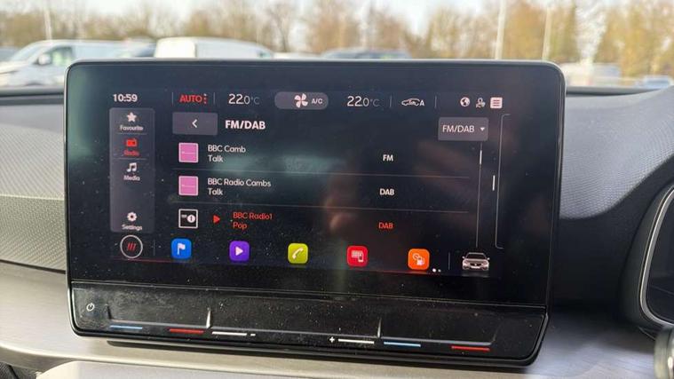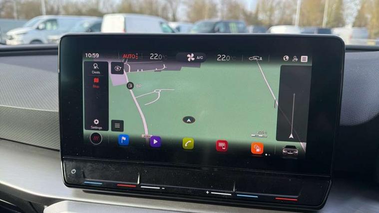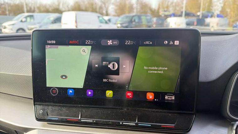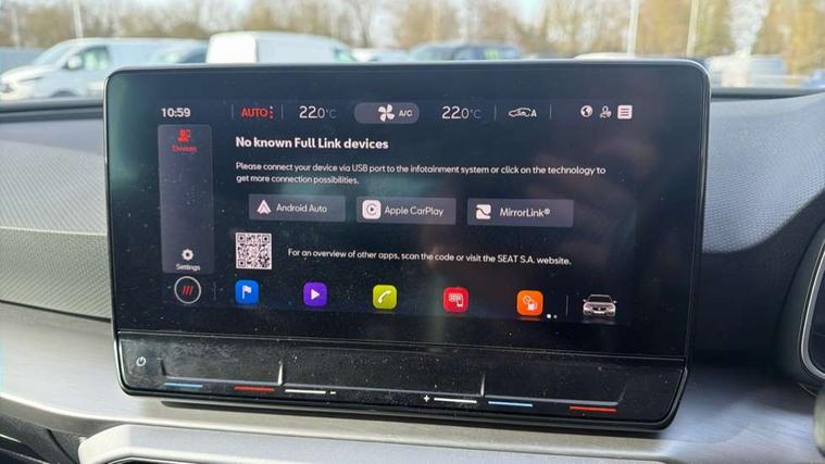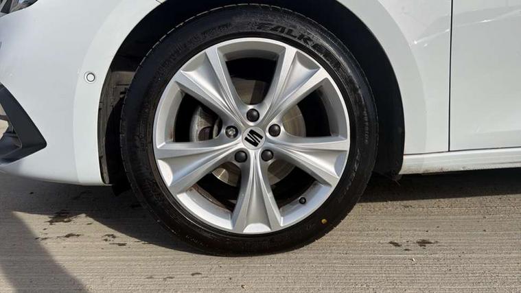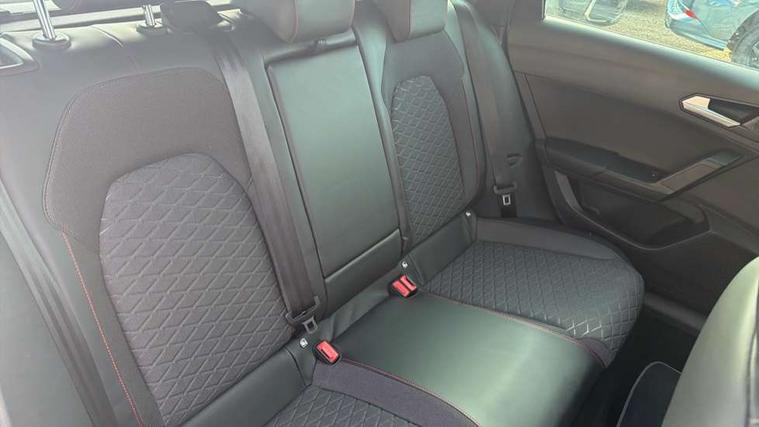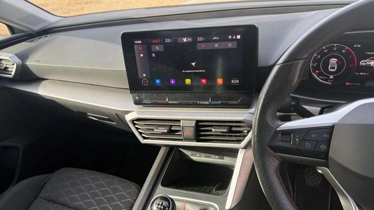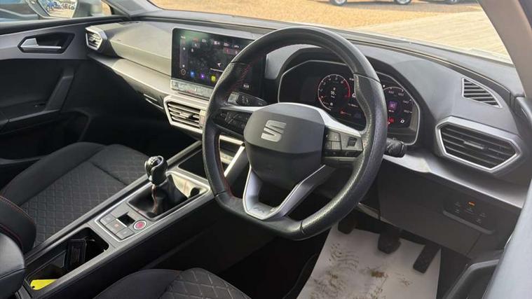 Digital cockpit, E-call, Front assist with forward collision warning braking reaction to vehicles, pedestrians and cyclists, Full link smartphone integration with Mirror Link, wireless Apple CarPlay and wired Google Android Auto, Lane assist, Lockable tailgate, Park assist (inc front/rear parking sensors), Power assisted speed sensitive electro-mechanical steering, RPM, trip computer, outside temp gauge, instrument light brightness, low fuel warning light, lights on reminder, gearshift indicator, SEAT drive profile with 4 modes (Eco/Normal/Sport/Individual), throttle response, Service interval indicator, Start/stop system with regenerative braking, Sports suspension, XDS electronic differential lock and dynamic traction support, 7 speakers, Auxiliary input socket, Auto dimming rear view mirror, Body colour door handles, Body coloured bumpers, Cosmo grey exterior mirrors with integrated LED indicators, Dark tinted rear windows, Electric front/rear windows, Electrically adjustable, heated and folding door mirrors, FR sports bumper, Illuminated front door sill, LED front fog lamps with cornering function, LED headlights and tail lights with dynamic turn signals, welcome light silhouette from exterior mirrors and dynamic headlight range control, LED rear fog lamp, Matt black roof rails, Rain sensing wipers, Rear side wing doors, Rear wash/wipe, Separate daytime running light with automatic headlight control and coming home feature, Third brake light, 12V Accessory socket in the load area, 12v power point in centre console, 3 seat bench in 2nd row, 60/40 split rear bench seat with armrest, Ambient lighting with glovebox, footwell and single monocolour, Cloth upholstery, Driver/passenger manual seat height adjustment, Dust/pollen filter, Flat bottomed perforated leather steering wheel with red stitching and FR logo and leather gear stick, Four x USB Type C ports, Front and rear height adjustable headrests, Front and rear reading lights X 4, Front centre armrest, Front seatback storage pockets, Height/reach adjust steering wheel, ISOFIX points in outer rear seats with top tether anchorage points, Luggage tie-down hooks, Lumbar adjustment for front seats, Single front passenger seat, Sliding boot cover, Sunvisors with covered illuminated mirror, Three zone climate control, Media system plus with navigation - Leon, 3 point seatbelts on all rear seats, ABS, Brake control system - ESC and brake booster, Child proof door locks, Driver and front passenger airbags with front passenger airbag de-activation, front side and curtain airbags, Electronic parking brake, Extended safety system - seat belt tensioner, window closure and hazard lights, Hill hold control, Rear disc brakes, Seat belt reminder for front and rear seats, Tiredness recognition system, driver alert system, Tyre pressure monitoring system, Anti theft alarm system with interior monitoring in cab, backup horn and towing protection, KESSY Go (Keyless start), Locking wheel bolts, Wireless phone charging, Chrome interior detailing, 17" Dynamic Bi-spoke alloy wheels with 91W tyres, Tool kit,