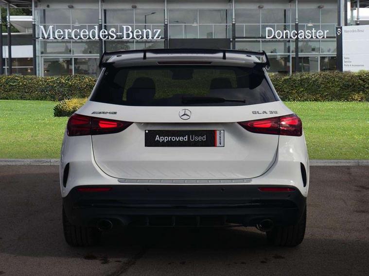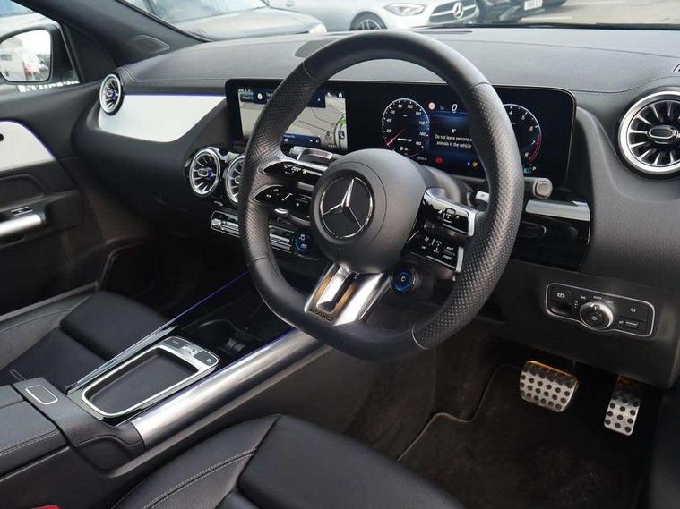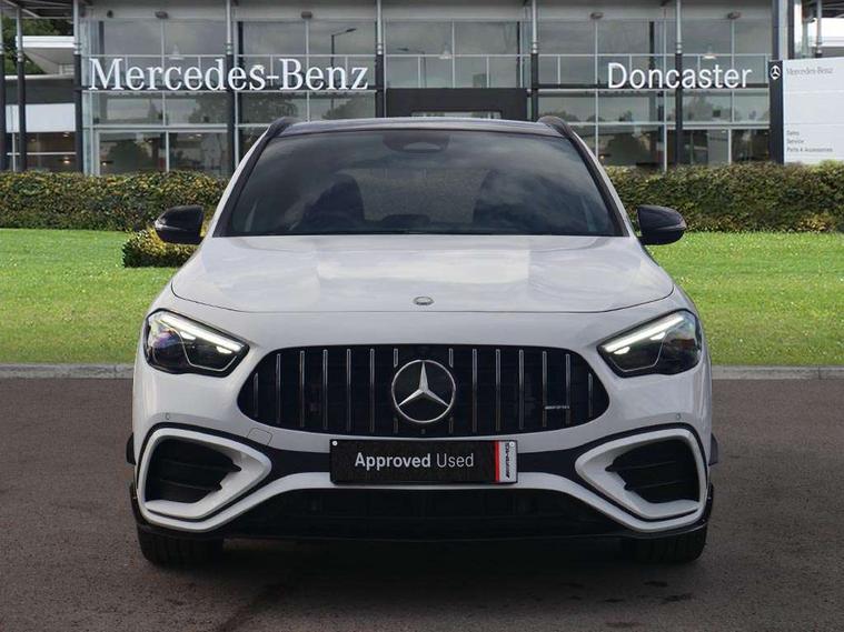 10.25 inch touchscreen central media display, 10.25" Digital instrument cluster display screen, AMG DYNAMIC SELECT with driving programs (Slippery, Comfort, Sport, Sport+, Individual and Race) including drift mode via steering wheel shift paddles, AMG speed sensitive steering with two sets of steering characteristics, Attention assist, Cruise control + speed limiter, Direct steering, ECO start/stop function, Fluid level warning indicator for fuel, oil, coolant and washer fluid, Hard-disk navigation, Hey Mercedes Voice activation, Lamp failure indicator, Lane keeping assist (LKA), MBUX augmented reality for navigation, Mercedes me connect including emergency call system, accident recovery, breakdown and maintenance management, Mercedes me remote services, Multi function trip computer, Outside temperature gauge, Owners manual and service booklet in English, Pre-installation of private car share, Radio aerial integrated into front and rear windshields, Service indicator (ASSYST), Smartphone integration with Apple CarPlay and Android auto, Status display for rear seat belts in instrument cluster, Tailgate, Traffic sign assist, Wireless charging, AMG performance 4MATIC+ with torque control, AMG Ride Control suspension, Rear axle multi-link, Suspension with adaptive damping system, Bluetooth connectivity including audio streaming, DAB Digital radio, MBUX multimedia system, Media interface, Mercedes-Benz (225w) sound system with 10 speakers, Pre installation for Mercedes Benz Link, Adaptive brake lights, Aerial for GPS, AMG body styling - Front apron with air deflectors on the outer air intakes, AMG emblem on the front instead of the "Mercedes-Benz" laurel wreath badge, AMG Rear apron with specific diffuser look with four vertical fins and two round chrome plated tailpipe trim elements with a diameter of 90 mm, AMG Sports exhaust system with two round tailpipes measuring 90 mm in diameter attached in rear apron, AMG lettering plus ribbing on the inside of the, Automatic headlamp activation, Beltline strips in High gloss Black, Body colour bumpers, Body coloured door handles with chrome insert for keyless entry, Body styling - Front splitter and trim element on the louvers in the outer air intake and also in the door trim in silver chrome, Car wash function, Dark privacy glass from B-pillar backwards, Electric front windows, Electric rear windows, Electrically adjustable and heated door mirrors with integrated LED indicators, Exhaust system with 2 Visible tailpipe trim elements and rear apron with trim in chrome, Front wings with TURBO 4MATIC lettering, Heated glass rear windscreen + timer control, Heated windscreen wash system, Interior mirror with black reading lamps and frameless, LED daytime running lights, LED tail lights, LED third brake light, Multibeam LED headlamps with adaptive highbeam assist and cornering function, Panoramic sunroof, Rain sensor windscreen wipers, Rear fog lights, Rear side wing doors, Rear wiper, Roof spoiler, Window line in high gloss black, 12V power socket in centre console, 3 seat bench in 2nd row, 40:20:40 split folding rear seat backrests, Adjustable head restraints, Air conditioning - air vents with silver chrome surround, Air conditioning - Two zone thermotronic luxury automatic climate control with display, Aluminium geashift paddles in silver colour, AMG floor mats with AMG lettering in front, AMG illuminated door sills with changeable cover, AMG Performance steering wheel in nappa leather, Auto Mercedes-Benz child seat recognition sensor, Black roof lining, Courtesy light in boot, Electrically adjustable front memory seats with four way lumbar support, Front centre armrest with stowage, Heated front seats, illuminated door sills with changeable cover, Illuminated glovebox, Interior lighting - 64 colour Ambient lighting, Luggage net on driver/front passenger seat backrest, Manually height and reach adjustable steering column, Rear armrest with two integral cup holders for drinks, Single front passenger seat, Sport seats with fixed head restraints, Sports pedals in brushed stainless steel with black rubber studs, Stowage compartment in centre console, Stowage compartment with retractable cover, Sunvisors with illuminated vanity mirrors, Twin front cup holders, Two outer rear seat isofix and top tether child seat fixing points, AMG Aerodynamics package - GLA, AMG Night package - GLA, Comfort seat pack - GLA Class, Interior lighting with light and sight pack - GLA, Keyless go comfort package - GLA, Mirror pack - GLA Class, Parking package with 360-degree camera - GLA, USB package plus - GLA, 3 rear 3 point seatbelts, ABS with Brake Assist, Active bonnet pedestrain safety measure which detects an impact and raises bonnet by 65mm, Adaptive brake assist with hold function and hill start assist, AMG high performance brake system with red painted brake callipers and black AMG lettering at the front, ventilated and perforated brake discs, Black seatbelts, Brake pad wear warning indicator, Childproof locks manually operated for rear doors and electrically operated for rear power windows, Crash responsive emergency lighting, Driver and passenger head and side airbags, Drivers knee airbag, Dual stage driver/passenger airbags, Electronic parking brake, ESP curve dynamic assist, ESP with ASR, Exit warning, Front and rear seatbelt reminder, Front brake callipers with Mercedes Benz logo lettering on front, Front passenger seat occupancy sensor, Tyre pressure monitoring system, Warning triangle and first aid kit, Window airbags, Alarm system with immobiliser and interior protection -Thatcham category 1, Guard 360 degree vehicle protection, Keyless entry lock/unlock, Keyless Go starting function, Remote central locking and crash sensor with emergency opening function, Vehicle key with decorative surround in chrome, Light longitudinal grain aluminium trim, 20" AMG 5 twin spoke light alloy wheels aerodynamically optimised and painted in matt black with high-sheen rim flange R