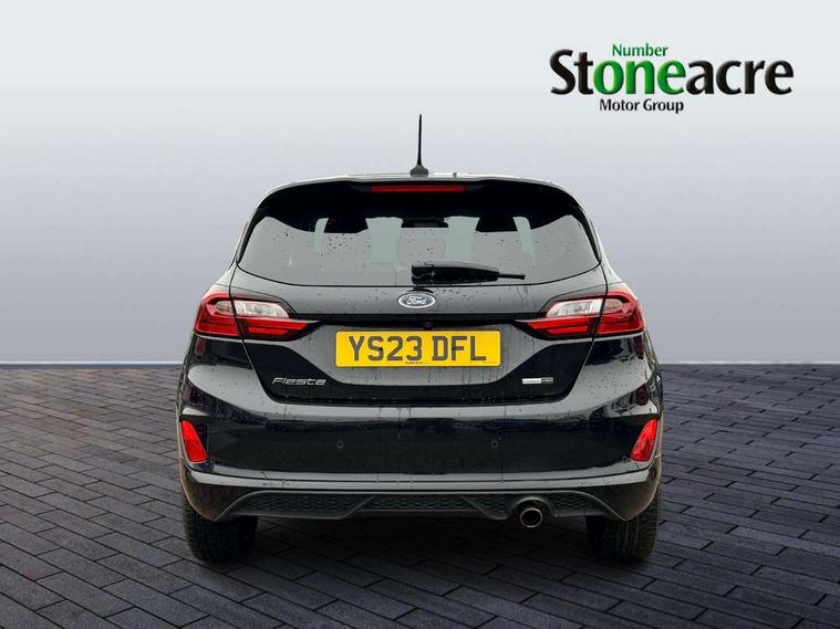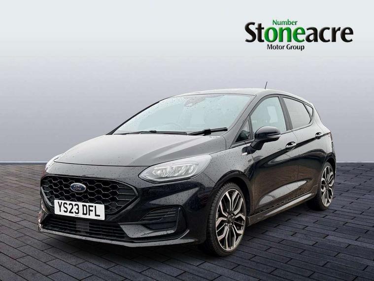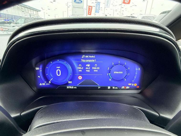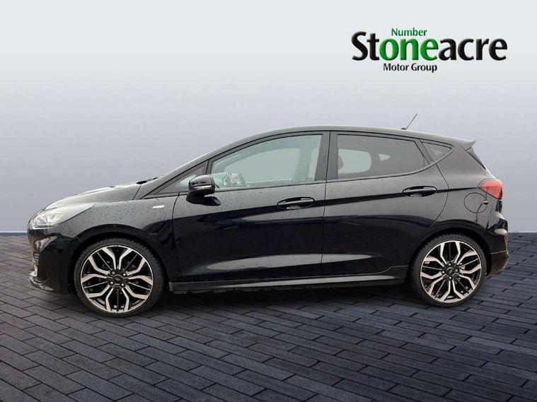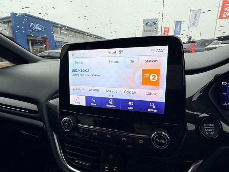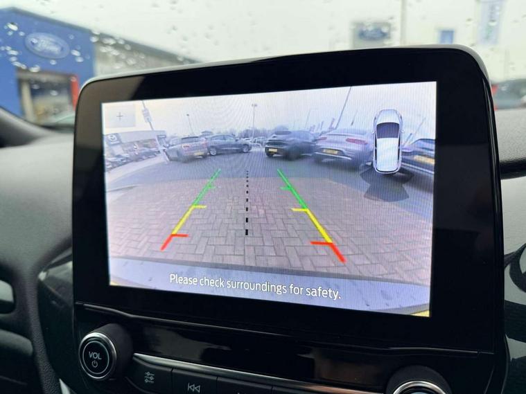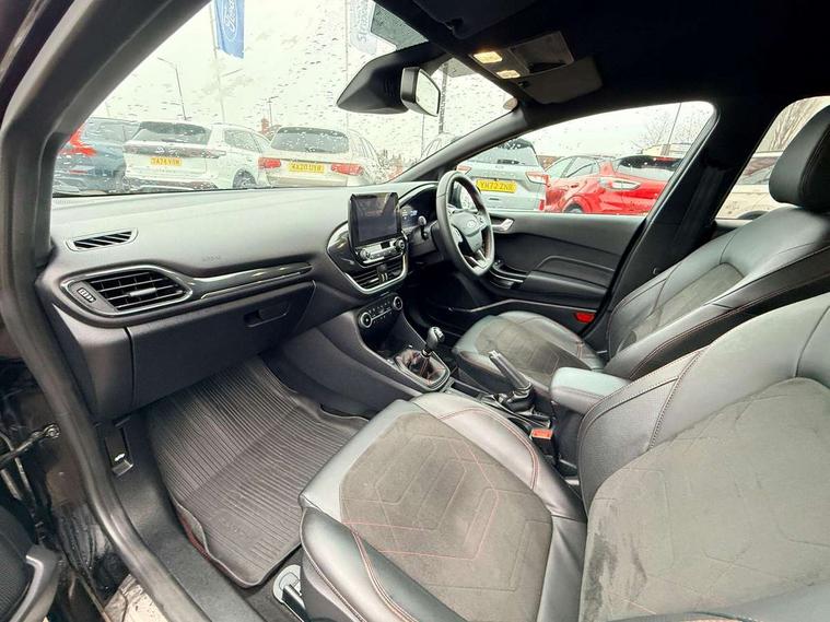 4.2" TFT instrument cluster screen, Bluetooth system, Electric power steering, Ford easy fuel, Rear parking distance sensors, Selectable drive modes (Normal, Sport, Track), Traffic sign recognition, Trip computer, Sports suspension, 2 USB ports, Auxiliary input socket, B&O Premium audio system with 8" touchscreen, 10 speakers, 360 degree sound system, Ford SYNC 3 navigation system and Ford pass connect, DAB Digital radio, Steering wheel mounted controls, Auto high beam, Body colour bumpers, Body colour door handles, Body colour large rear spoiler, Body coloured electrically operated and heated door mirrors with side indicators, Cornering front fog lights, Electric front windows/one touch facility, Electric rear windows, LED Night signature to rear lights, Power foldable door mirrors with puddle lights, Quickclear heated windscreen, Rain sensing wipers and auto dimming rear view mirror, Rear privacy glass, Rear wiper, Unique ST-Line upper grille & full bodystyling kit with ST-Line wing badges, 3 spoke flat bottomed leather steering wheel, 60/40 split folding rear seat, Adjustable head restraints, Black headlining, Boot carpet, Centre console with opening armrest, 2x cupholders, 12v and USB, Chrome inner door handles, Drivers and Passenger lumbar support, EATC - Electronic Auto Temperature control, Footwell illumination, Front floor mats in velour, Front map reading lights, Front seat and rear pockets, Height adjustable passenger seat, Illuminated glovebox, Leather gaiter, LED ambient lighting, Load area light, Manual 4-way driver seat adjust, Overhead console with sunglasses holder, Pollen filter, Rake/reach adjustable steering wheel, Sensico wrapped steering wheel, Sports front seats, NCAP Pack - Fiesta, ST-Line X Trim Pack - Fiesta, 3 point seatbelts on all rear seats, ABS+EBA, Curtain airbags, Driver and passenger airbags, Drivers knee airbag, Electronic stability control with hill start assist, Front passenger airbag deactivation, Front side airbags, Seatbelt warning, Two tone horn, Tyre pressure monitoring system, Ford keyfree system with Keyless entry and keyless start, MyKey system, Remote central locking & engine immobiliser, Thatcham Cat.1 alarm, 18" 5 spoke alloy wheels with rock metallic machined finish,