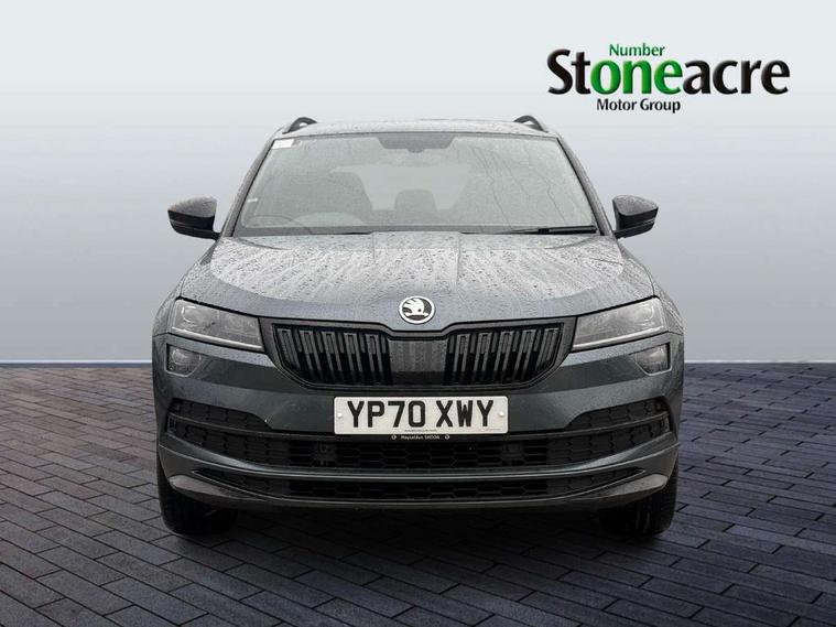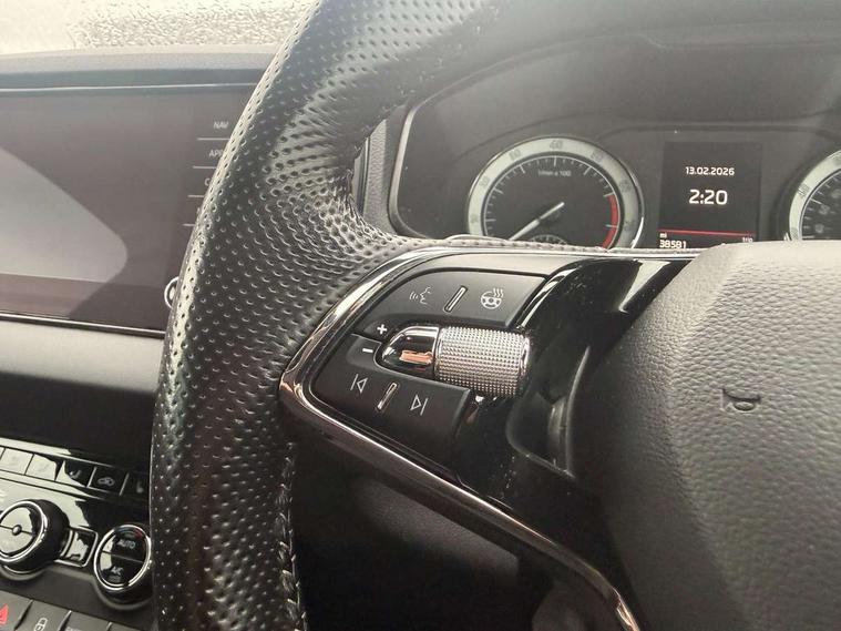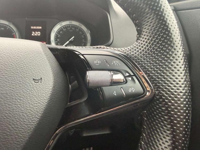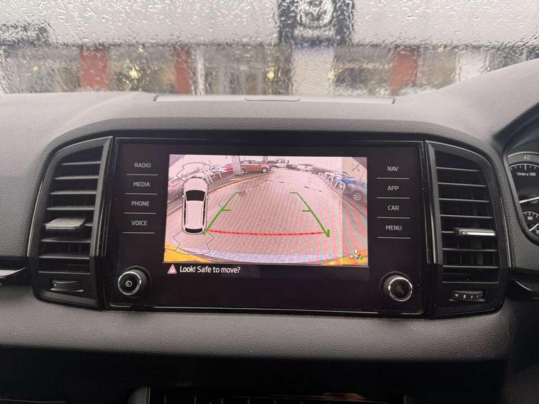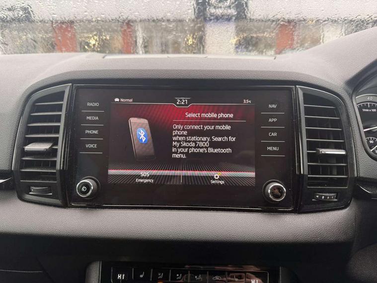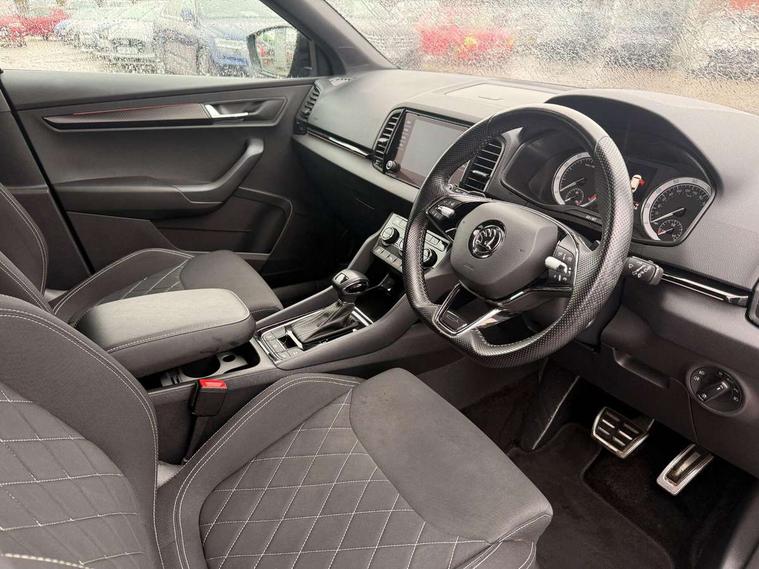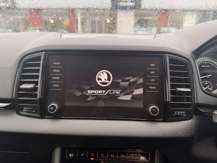 Care connect, Drive mode selector, Driver alert system, Driver fatigue sensor, Driver profile selection, Multifunction colour trip computer, Outside temperature gauge, Rear view camera, Service interval indicator, SmartLink + wireless for Apple and wired for Android, Start/stop system with regenerative braking, USB C Port x 2 in front centre console, DAB radio with Bluetooth, SD card slot, USB connection, Wireless charging without wireless aerial connection, Acoustic glass, Aero front windscreen wipers with intermittent function, Automatic headlight control system, Black electric window control buttons, Black roof rails and door mirrors with radiator grille, Body colour door handles, Electric front and rear windows with child proof lock, Front door steps with SportLine logo, Full LED headlights + adaptive front light system + LED daytime running lights and front cornering fog lights, Headlight washers, Heated rear windscreen, LED rear lights with high functionality, Light assistant (coming/leaving home/tunnel light), Panoramic sliding sunroof, Privacy glass, Protective door side sills in body colour, Rear diffuser, Safety reflectors on front doors, Skoda lettering on tailgate in black, Sportline badge on front fender, Sportline decorative inserts with badging, Sports front and rear bumpers, Third brake light, 1.5 litre bottle holders in driver and front passenger door panels, 12V socket in boot, 12v socket in front centre armrest with storage compartment and rear air vents, 2 Folding hooks and nets in boot, 2 Front readings lights for driver and passenger, 3 rear height adjustable headrests, 3 spoke leather sports heated multifunction steering wheel with hands off detection and silver stitching with gear shift paddles, 4 foldable roof handles with rear coat hooks, 4 lashing points on luggage floor, Aluminium pedals, Backrest release, Black roof headlining, Cargo elements in boot, Chrome inner door handles, Door sill scuff plates, Driver and passenger seats height adjust, Front head restraints, Front seat and rear pockets, Height adjustable front three point seats belts with tensioners, Height/reach adjust steering wheel, Ice scraper, Illuminated and cooled glovebox, Illuminated luggage compartment, Isofix child seat preparation outer rear, Manual lumbar support for front seats, Net programme in boot, Pen holder, Pollen filter, Rear boot cover, Rear reading lights, Rear seats fixed folding and divided 60:40, Retractable parcel shelf attachable to tailgate, Safety vest holder, Storage box in upper central dashboard closed, Storage compartment below the passenger seat, Sunvisors with illuminated vanity mirrors, Textile floor mats, Umbrella under passenger seat, LED Interior lighting pack with Skoda welcome logo - Karoq, Airbags - Front side, head, knee and curtain, Automatic door unlocking in case of crash, Automatic fuel cut off in case of crash, Driver airbag, Electronic parking brake with auto hold function, Emergency rear braking signal, ESC including ABS, MSR, ASR, EDS, HBA, DSR, RBS, MKB and traction control, Front assist radar scanning of the space in front of the car with automatic braking, Hill hold control, Passenger airbag with switch-off function, Pedestrian monitor, Seatbelt reminder signalisation and pretensioner for all seats, Three point seatbelts rear, Two tone horn, Tyre pressure display, Tyre pressure monitor, Alarm with interior monitoring, back up horn and tilt sensor with safe function, Electronic engine immobiliser, Keyless entry and keyless start with safe system, Remote central locking with 2 remote folding keys, Black air vent surround, 19" Vega anthracite alloy wheels, Anti-theft wheel bolts protection, Storage on wheel cover,