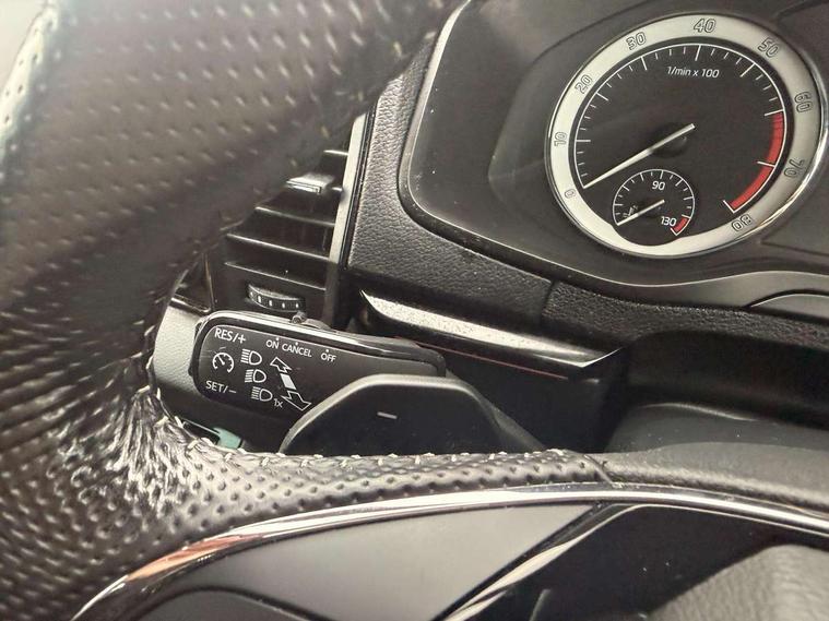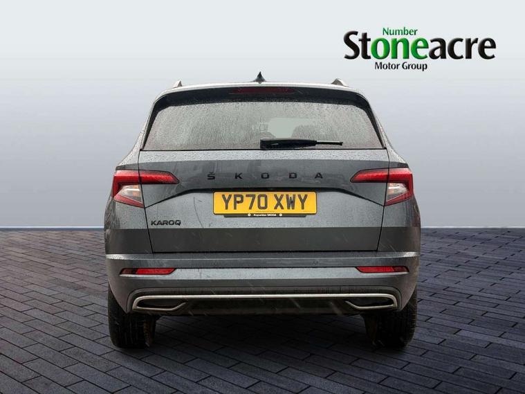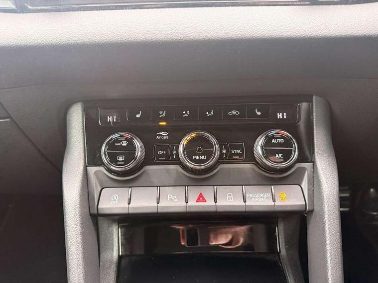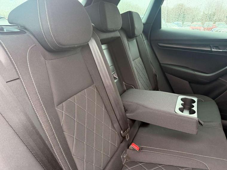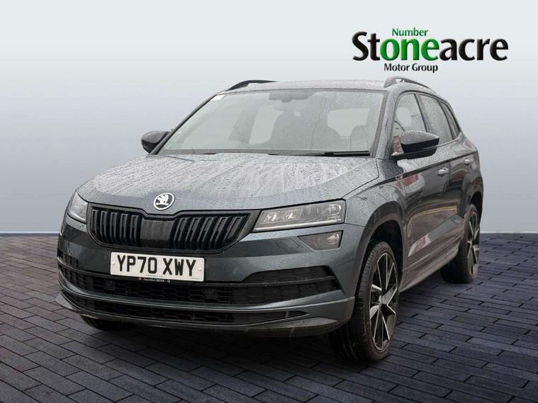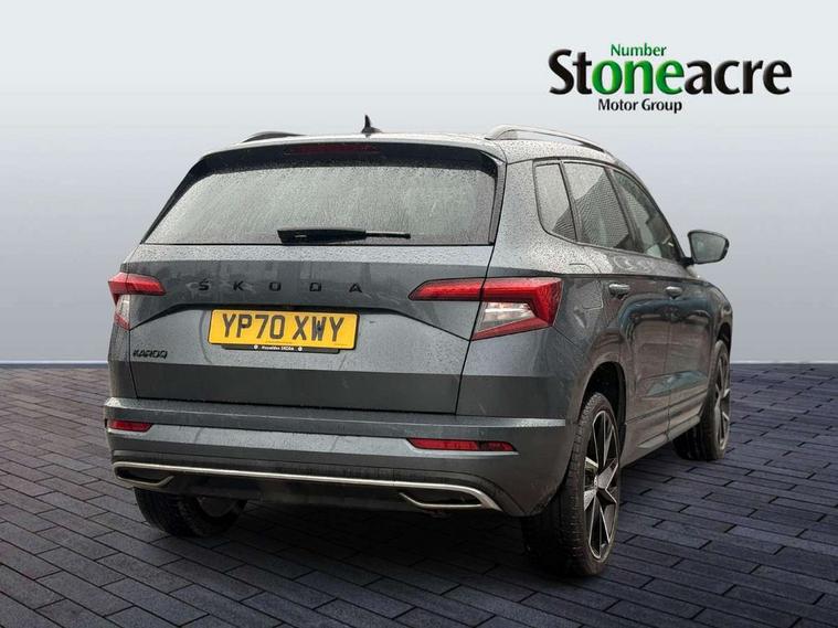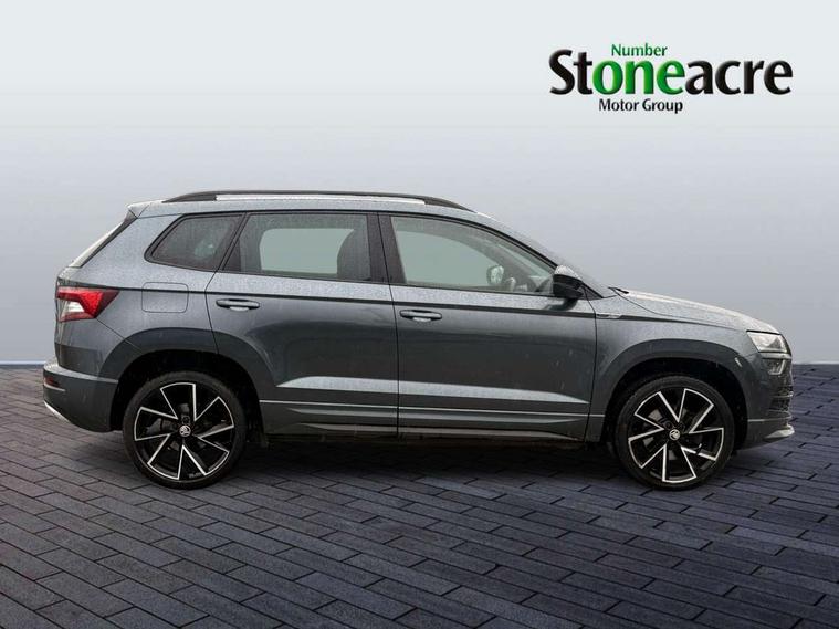 Care connect, Drive mode selector, Driver alert system, Driver fatigue sensor, Driver profile selection, Multifunction colour trip computer, Outside temperature gauge, Rear view camera, Service interval indicator, SmartLink + wireless for Apple and wired for Android, Start/stop system with regenerative braking, USB C Port x 2 in front centre console, DAB radio with Bluetooth, SD card slot, USB connection, Wireless charging without wireless aerial connection, Acoustic glass, Aero front windscreen wipers with intermittent function, Automatic headlight control system, Black electric window control buttons, Black roof rails and door mirrors with radiator grille, Body colour door handles, Electric front and rear windows with child proof lock, Front door steps with SportLine logo, Full LED headlights + adaptive front light system + LED daytime running lights and front cornering fog lights, Headlight washers, Heated rear windscreen, LED rear lights with high functionality, Light assistant (coming/leaving home/tunnel light), Panoramic sliding sunroof, Privacy glass, Protective door side sills in body colour, Rear diffuser, Safety reflectors on front doors, Skoda lettering on tailgate in black, Sportline badge on front fender, Sportline decorative inserts with badging, Sports front and rear bumpers, Third brake light, 1.5 litre bottle holders in driver and front passenger door panels, 12V socket in boot, 12v socket in front centre armrest with storage compartment and rear air vents, 2 Folding hooks and nets in boot, 2 Front readings lights for driver and passenger, 3 rear height adjustable headrests, 3 spoke leather sports heated multifunction steering wheel with hands off detection and silver stitching with gear shift paddles, 4 foldable roof handles with rear coat hooks, 4 lashing points on luggage floor, Aluminium pedals, Backrest release, Black roof headlining, Cargo elements in boot, Chrome inner door handles, Door sill scuff plates, Driver and passenger seats height adjust, Front head restraints, Front seat and rear pockets, Height adjustable front three point seats belts with tensioners, Height/reach adjust steering wheel, Ice scraper, Illuminated and cooled glovebox, Illuminated luggage compartment, Isofix child seat preparation outer rear, Manual lumbar support for front seats, Net programme in boot, Pen holder, Pollen filter, Rear boot cover, Rear reading lights, Rear seats fixed folding and divided 60:40, Retractable parcel shelf attachable to tailgate, Safety vest holder, Storage box in upper central dashboard closed, Storage compartment below the passenger seat, Sunvisors with illuminated vanity mirrors, Textile floor mats, Umbrella under passenger seat, LED Interior lighting pack with Skoda welcome logo - Karoq, Airbags - Front side, head, knee and curtain, Automatic door unlocking in case of crash, Automatic fuel cut off in case of crash, Driver airbag, Electronic parking brake with auto hold function, Emergency rear braking signal, ESC including ABS, MSR, ASR, EDS, HBA, DSR, RBS, MKB and traction control, Front assist radar scanning of the space in front of the car with automatic braking, Hill hold control, Passenger airbag with switch-off function, Pedestrian monitor, Seatbelt reminder signalisation and pretensioner for all seats, Three point seatbelts rear, Two tone horn, Tyre pressure display, Tyre pressure monitor, Alarm with interior monitoring, back up horn and tilt sensor with safe function, Electronic engine immobiliser, Keyless entry and keyless start with safe system, Remote central locking with 2 remote folding keys, Black air vent surround, 19" Vega anthracite alloy wheels, Anti-theft wheel bolts protection, Storage on wheel cover,