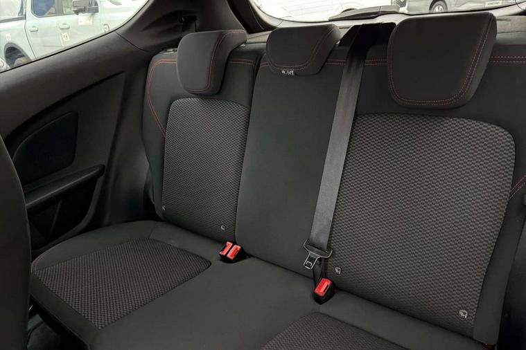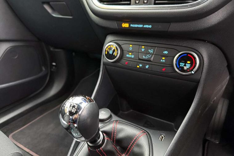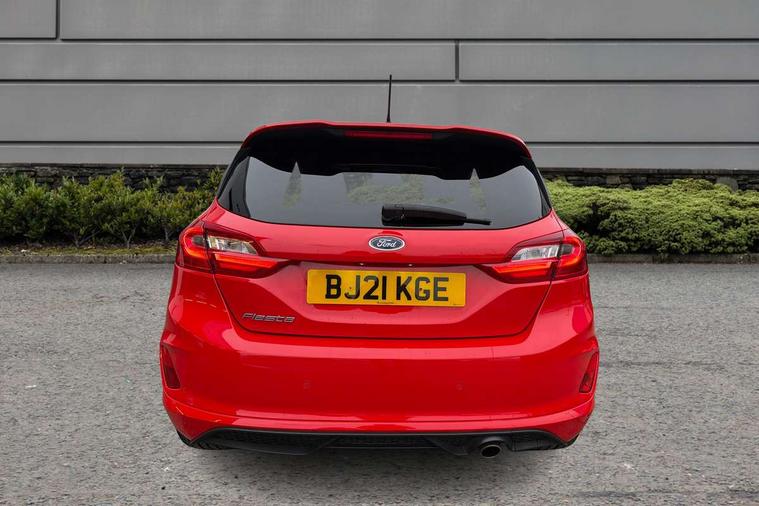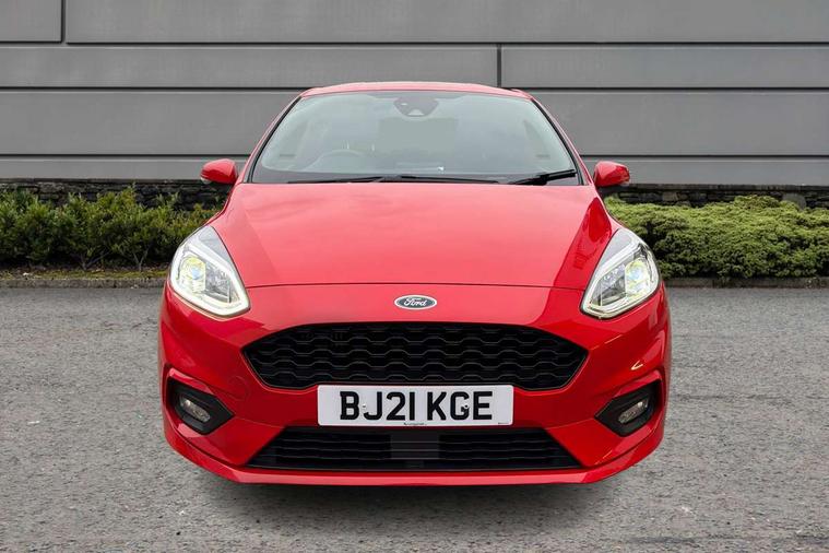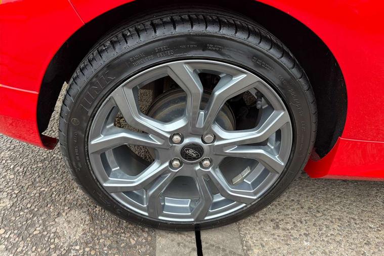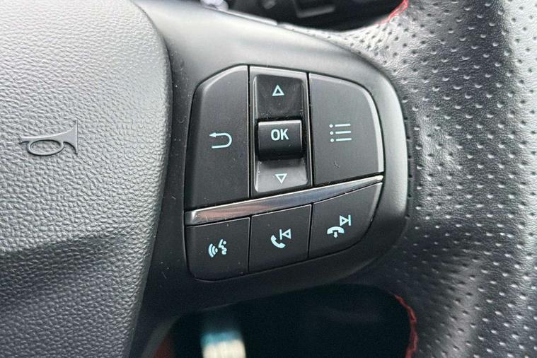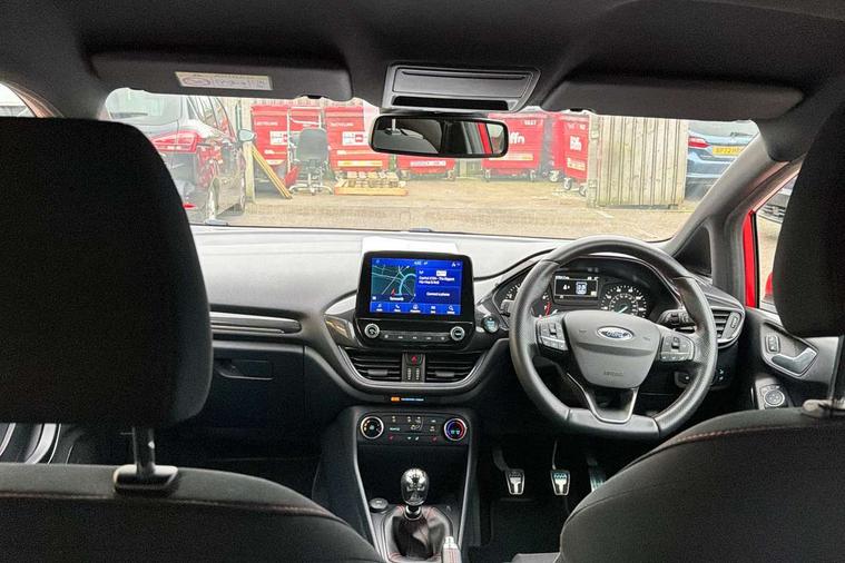 Bluetooth system, Electric power steering, Ford easy fuel, Ford SYNC 3 Navigation system incl 8" touchscreen, 7 speakers, FordPass connect, Apple carplay, android auto, voice control and emergency assistance, Rear parking distance sensors, Trip computer, Sports suspension, 2 USB ports, Auxiliary input socket, DAB Digital radio, Steering wheel mounted controls, Body colour bumpers, Body colour door handles, Body colour large rear spoiler, Body coloured electrically operated and heated door mirrors with side indicators, Cornering front fog lights, Electric front windows/one touch facility, LED Night signature to rear lights, Power foldable door mirrors with puddle lights, Quickclear heated windscreen, Rain sensing wipers and auto dimming rear view mirror, Rear privacy glass, Rear wiper, Unique ST-Line upper grille & full bodystyling kit with ST-Line wing badges, 12V Accessory socket in centre console, 3 spoke flat bottomed leather steering wheel, 60/40 split folding rear seat, Adjustable head restraints, Black headlining, Boot carpet, Centre console with armrest and illuminated cupholders, Chrome inner door handles, Cloth upholstery, Footwell illumination, Front floor mats, Front map reading lights, Front seat and rear pockets, Height adjustable driver's seat, Illuminated glovebox, LED ambient lighting, Load area light, Manual air conditioning, Overhead console with sunglasses holder, Pollen filter, Rake/reach adjustable steering wheel, Sensico leather steering wheel/gear knob/handbrake, Sports front seats, Sports pedals, NCAP Pack - Fiesta, 3 point seatbelts on all rear seats, ABS+EBA, Curtain airbags, Driver and passenger airbags, Drivers knee airbag, Electronic stability control with hill start assist, Front passenger airbag deactivation, Front side airbags, Seatbelt warning, Two tone horn, Tyre pressure monitoring system, Keyless start with 'Ford Power' starter button, MyKey system, Remote central locking & engine immobiliser, Thatcham Cat.1 alarm, 17" 5 spoke alloy wheels with rock metallic finish,