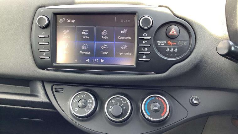 Instrument panel in grey, 15" Black machined alloy wheels, Space saver spare wheel, Engine immobiliser, Remote central locking, 6 speakers, Auxiliary input socket, DAB Digital radio, Steering wheel mounted audio/telephone controls, Touch 2 touchscreen Radio with iPod connectivity, USB connection, 3 point seatbelts on all rear seats, ABS+EBD+Brake assist, Collision mitigation braking system, Curtain airbags, Driver and passenger airbags, Drivers knee airbag, Front side airbags, Height adjustable front seatbelts with pre-tensioners and load limiters, Hill start assist control (HAC), Passenger airbag deactivate switch, Rear child proof door locks, Road sign information display, Seatbelt warning lamp and buzzer, Tyre pressure monitoring system, Vehicle stability control VSC + traction control, 2 speed front wipers + intermittent wipe, Auto high beam, Body colour bumpers, Body colour door handles, Body coloured door mirrors, Chrome fog light surround, Daytime running lights, Door mirror integrated indicators, Drivers window one touch up/down, Electric adjustable heated door mirrors, Electric front windows, Follow me home headlights, Front fog lights, Green tinted glass, Heated rear windscreen, Piano black side mouldings, Rain sensitive windscreen wipers, Rear wiper, 3 spoke leather steering wheel, 60/40 split folding rear seat, Boot light, Cloth upholstery, Driver seat height adjust, Driver/passenger vanity mirrors with covers, Front cupholders x 2, Front map reading lights, Front seats with lumbar support, Glovebox, Height adjustable front head restraints, Height adjustable rear seat head restraints (x3), Isofix system on outer rear seats, Leather gear knob, Manual air conditioning, Rear cupholder, Removable rear parcel shelf, Sliding front seats, Tilt/telescopic steering column, Bluetooth system, Cruise control, External temperature gauge, Front parking sensors, Fuel indicator with low level warning, Lane departure warning system, Lights on warning, Multi-information display, Power Steering, Rear view camera, TFT display screen, Touch 2 Go navigation system, Trip computer,
