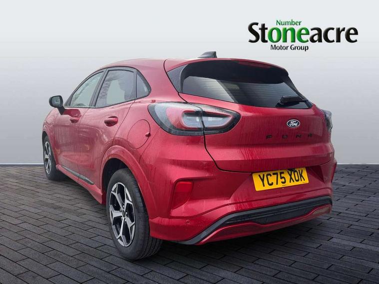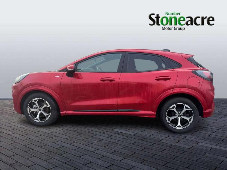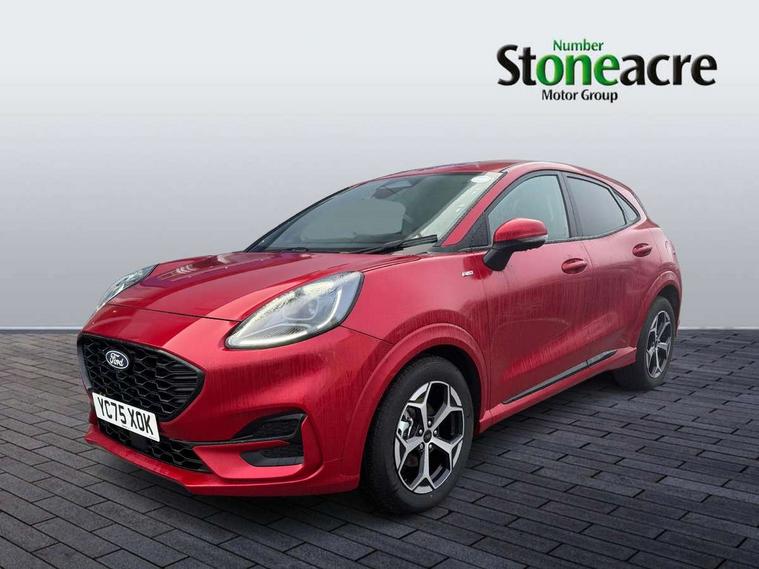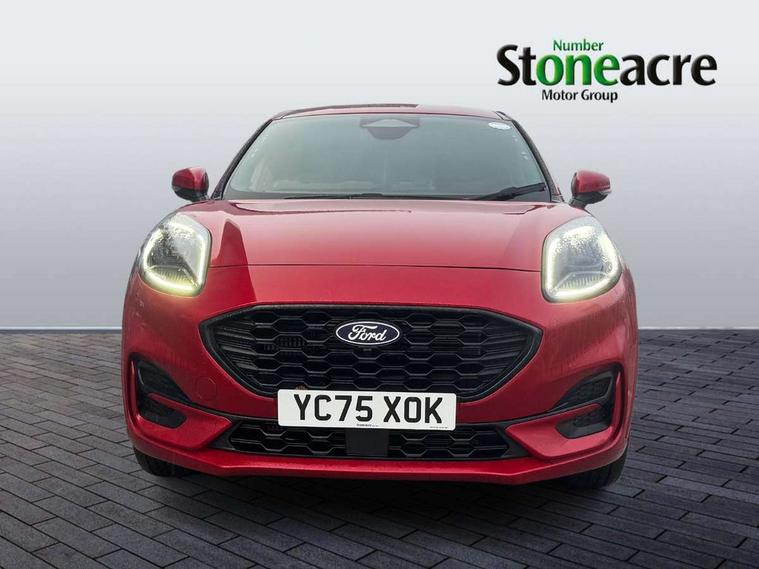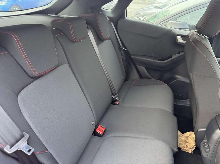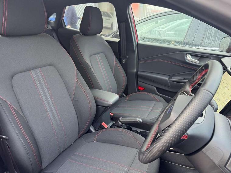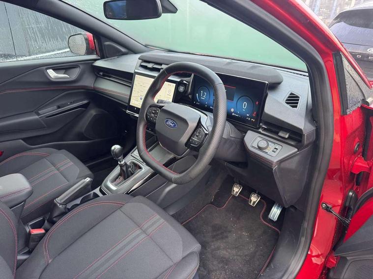 Driver impairment monitor, Emergency call service, Ford easy fuel, Full digital 12.8" instrument cluster, Lane keeping aid with lane departure warning, Power assist steering, Selectable drive modes(Normal, Eco, Sport, Slippery and Trail), Speed sign recognition, Sport suspension, 12" landscape touchscreen display with wireless apple car play and android auto 6 speaker audio system, Ford pass connect and emergency assistance, Ford SYNC4 with connected navigation, Automatic headlights with rain sensing wipers and auto high beam, Front fog lamps, LED daytime running lights, LED rear lamps, LED third brake light, Power foldable heated door mirrors with puddle lamps and puma logo protection, Quickclear heated windscreen, Rear privacy glass, Rear side wing doors, Rear wiper, ST-Line body styling kit with unique grille, 3 seat bench in 2nd row, Centre console with armrest and stowage, Electronic automatic temperature control (EATC), Ford megabox extended bootspace, Front and rear head restraints, Front floor mats, Manual 4 way driver seat adjust with lumbar adjustment, Single front passenger seat, ST- Line cloth trim with red stitching, 3 rear seatbelts, Child safety lock, Electronic stability control (ESC) and hill start assist, Pre-collision assist with autonomous emergency braking, pedestrian/cyclist detection & post-collision braking, Tyre pressure monitoring system (TPMS), Thatcham alarm,