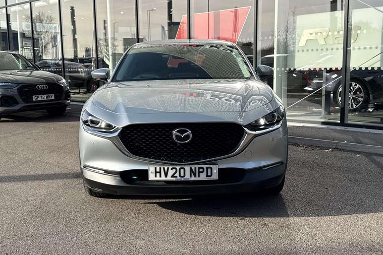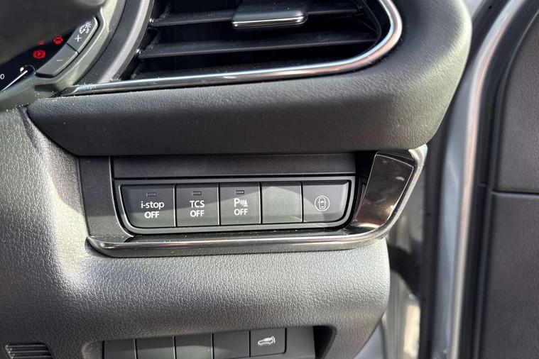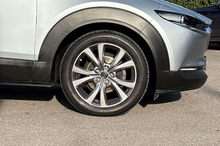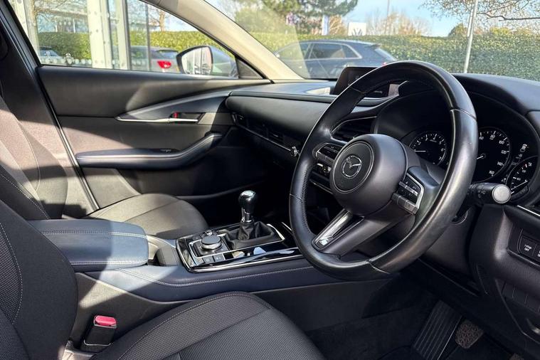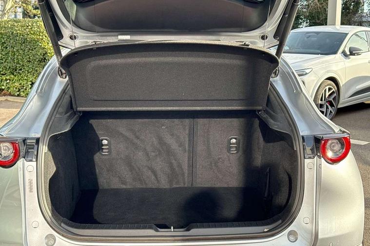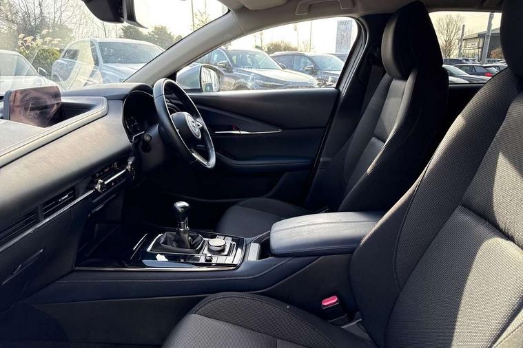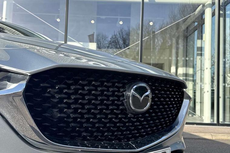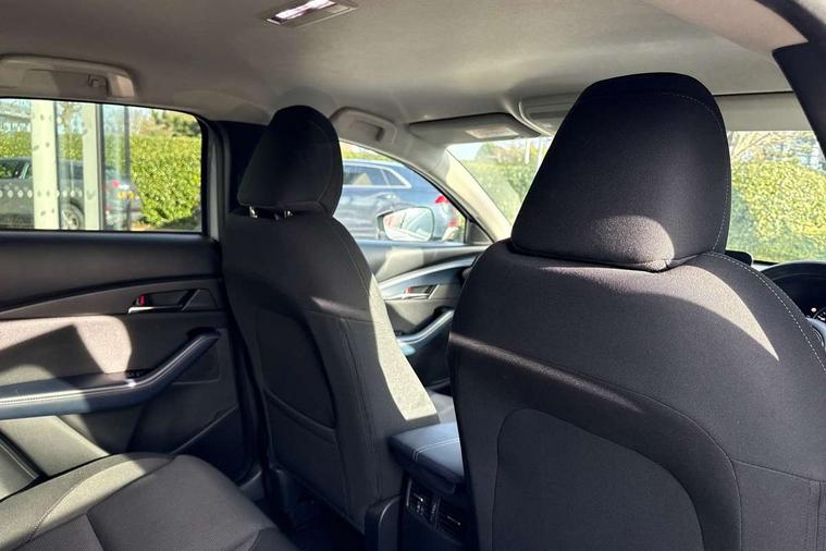 7" TFT Colour driver instrument panel display, 8.8" Colour centre touch screen display with Mazda Connect infotainment, Adaptive cruise control (Mazda radar cruise control) features stop and go, Apple car play/Android Auto, Blind spot monitoring with rear cross traffic alert, Driver attention alert system, E-call with GPS, Emergency stop signalling system, Engine start/stop button, Front and rear parking sensors, Integrated bluetooth, Integrated Mazda navigation system, Intelligent speed assist, Lane keep assist system (LAS) with Lane departure warning system (LDWS), PAS, Power lift gate, Reversing camera, Service indicator, Trip computer, Window projected colour active driving display (head up display) with traffic sign recognition, Cylinder Deactivation, i-stop, 2 USB charging ports, AM / FM / DAB radio with 8 speakers, CD player, Multimedia Commander including separate volume dial, Steering wheel mounted audio/bluetooth controls, Adaptive LED Headlights, Auto dimming driver's door mirror, B-pillar and C-pillar garnishes in gloss black finish, Body coloured, electrically adjustable, heated auto power folding door mirrors with integrated indicators, Coming/leaving home lighting function, Dual chrome exhaust, Dusk sensing headlights, Electric front/rear windows with one touch auto up/down, Frameless auto dimming interior rear view mirror, Front kodo turn signal, Gloss black front grille, Gloss black rear roof spoiler, High beam assist, LED headlamps with auto levelling, Privacy glass (rear side windows and rear screen), Rain sensing front wipers with adjustable speed and intermittent wipe, Rear fog lights, Rear wiper, Signature front LED daytime running lights, Signature LED rear combination lights with LED rear turn lights, 12V power outlet in centre console, 60/40 split fold down rear seats, Chrome horn pad ring, Cloth door panel inserts, Cloth upholstery with interior accents, Dashboard, door cards and front centre armrest in navy blue cloth, Driver and front passenger visors with covered vanity mirror and driver ticket holder, Driver seat manual slide, recline and height adjust, Driver, Front passenger and two rear grab handles with coathooks, Dual zone climate control air conditioning with rear air vents, Folding rear centre armrest with two cup holders, Front and rear (x3) head restraints, Front and rear door pockets, Front and rear LED lighting, Front armrest, Front centre storage with two cupholders, Front passengers seat manual slide, recline and height adjustment, Gear shift indicator, Glovebox illumination, Heated front seats with 3 stage setting, ISOFIX child seat anchorage points attached on outer rear seats, Leather wrapped gear shift knob, Leather wrapped steering wheel with telescopic and tilt adjustment, Luggage compartment light, Rear passenger seat map pockets, Roof mounted sunglasses holder, 3 point ELR front seat belts x2 with pretensioners, 3 point ELR rear seat belts, Anti-lock braking system (ABS), Driver/Front Passenger airbags, Drivers knee airbag, DSC - Dynamic Stability Control, Electronic parking brake with auto disengage function and auto hold function, Front and rear curtain airbags, Front passenger airbag cut-off switch, Front side airbags, Front smart city brake support, G-Vectoring control plus, Hill launch assist, Mild Hybrid system with regenerative braking, Seatbelt reminder for driver/front passenger and rear seats, Traction control system (TCS), Tyre pressure monitoring system (TPMS), Remote central locking with deadlocking and automatic door lock when driving, Smart keyless entry, Thatcham accredited alarm and immobiliser, 18" Silver metallic alloy wheels, Emergency tyre repair kit,