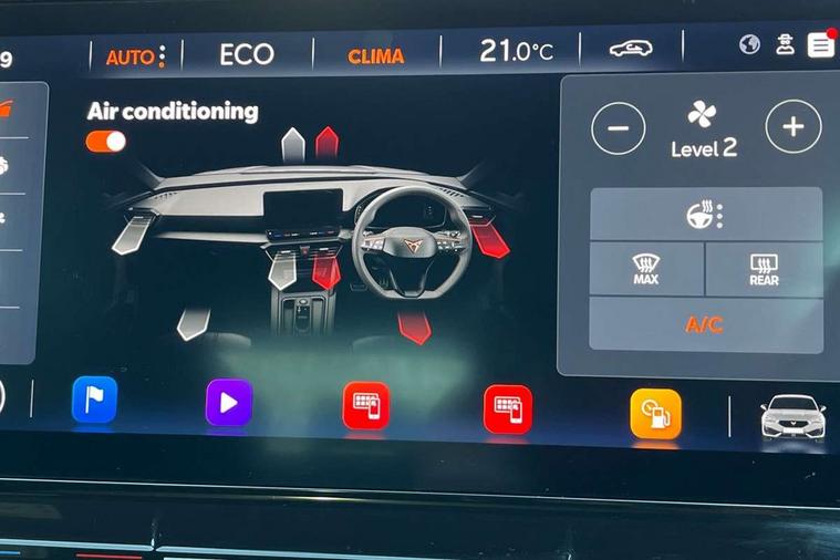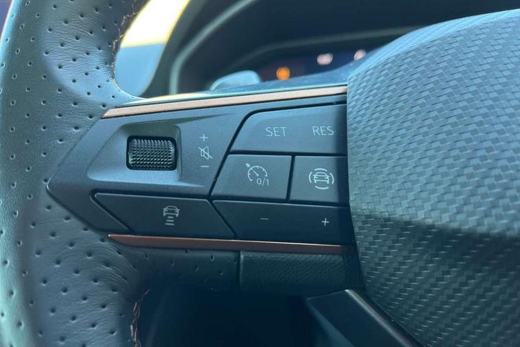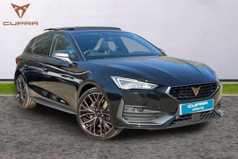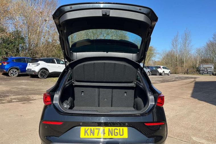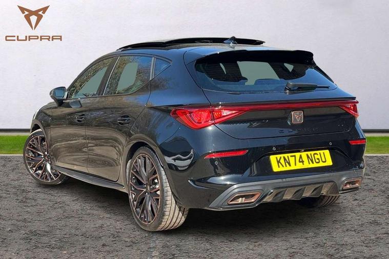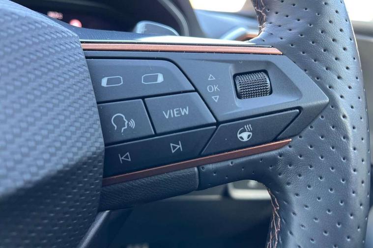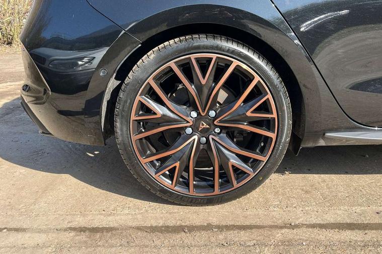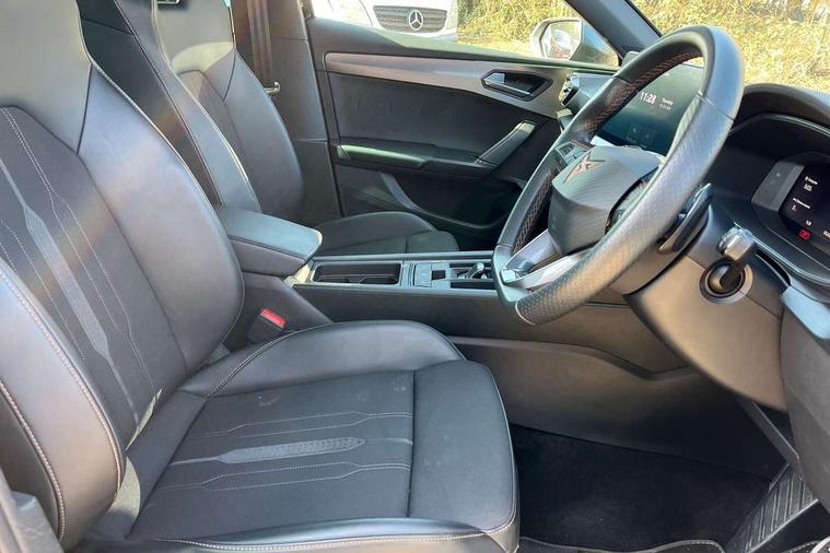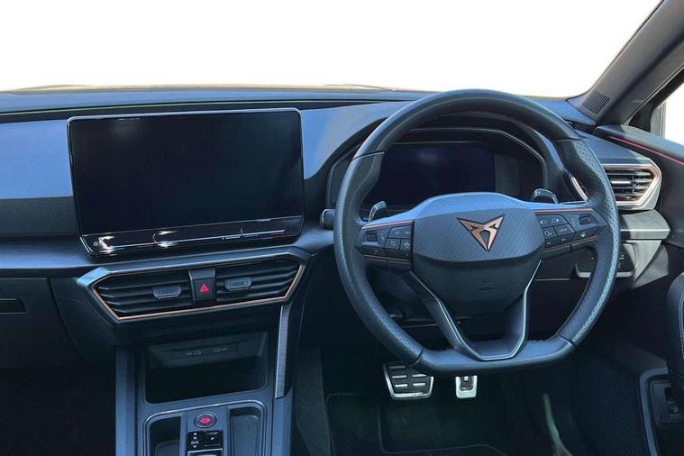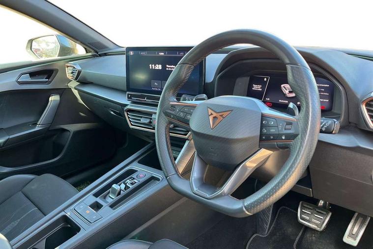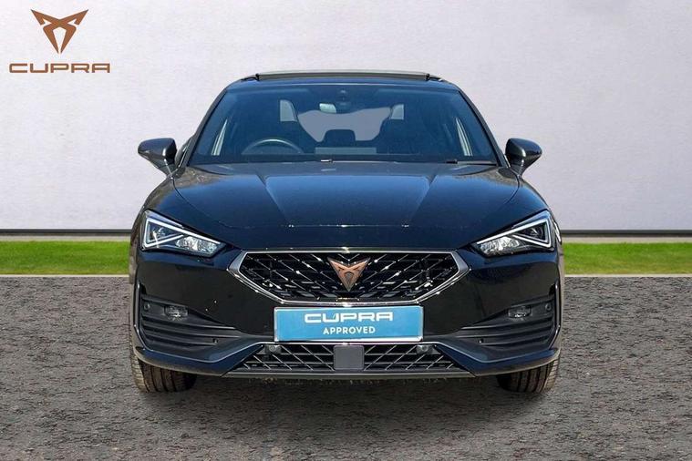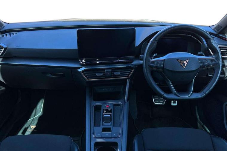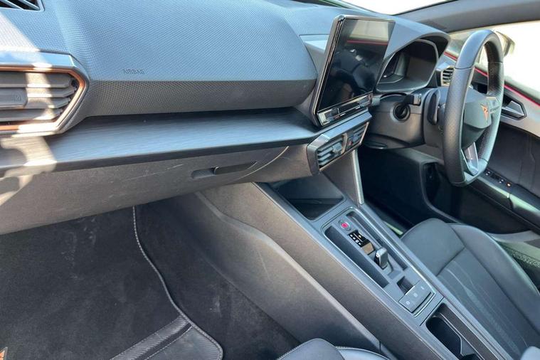 CUPRA drive profile selection with 4 modes (Comfort/Cupra/Sport/Individual), throttle response and gearshift mode, Digital cockpit, E-call, Front assist with forward collision warning braking reaction to vehicles, pedestrians and cyclists, Full link smartphone integration with Mirror Link, wireless Apple CarPlay and wired Google Android Auto, Lane assist, Lockable tailgate, Park assist (inc front/rear parking sensors), Rear view camera, RPM, trip computer, outside temp gauge, instrument light brightness, low fuel warning light, lights on reminder, gearshift indicator, Service interval indicator, Start/stop system with regenerative braking, Wireless phone charger, 10 amp mode 2 charging cable, 16 amp mode 3 charging cable, 3.6 kw On-board charger, Standard suspension, XDS electronic differential lock and dynamic traction support, Auxiliary input socket, Auto dimming rear view mirror, Body colour door handles, Body coloured bumpers, Cupra sports bumpers, Dark tinted rear windows, Electric front/rear windows, Electrically adjustable, heated and folding door mirrors, LED front fog lamps with cornering function, LED headlights with dynamic turn signals, tail lights, rear fog lights with rear coast to coast lighting, Panoramic sunroof, Rain sensing wipers, Rear diffuser with twin exhaust pipe on each side with simulated exhausts, Rear side wing doors, Rear wash/wipe, Separate daytime running light with automatic headlight control and coming home feature, Third brake light, 12v power supply in centre console, 3 seat bench in 2nd row, 5 headrests, 60/40 split rear bench seat with armrest, Ambient lighting (glovebox, footwell, ambient lighting multicoloured), Black headlining, CUPRA Leather flat bottomed, heated, perforated steering and gearshift paddles, Cupra sports pedals, Driver/passenger manual seat height adjustment, Dust/pollen filter, Folding boot cover, Four x USB Type C ports (2 in front and 2 in rear), Front and rear reading lights X 4, Front centre armrest, Front seats manual lumbar adjustment, Height/reach adjust steering wheel, Illuminated interior front door sills, Interior wraparound lighting, ISOFIX points in outer rear seats with top tether anchorage points, Luggage tie-down hooks, PVC/Cloth upholstery with copper stitching + Cupra embossed logo on headrest, Single front passenger seat, Sports bucket seats, Storage pockets on rear of front seats, Sunvisors with illuminated mirror, Three zone climate control, Design pack - Cupra Leon, Dynamic and comfort pack - Leon Cupra, Media system plus with navigation pack - Leon Cupra, 3 point seatbelts on all rear seats, ABS, Brake control system - ESC and brake booster, Child proof door locks, Cupra black brake calipers, Driver and front passenger airbags with front passenger airbag de-activation, front side and curtain airbags, Electronic parking brake, Extended safety system - seat belt tensioner, window closure and hazard lights, Hill hold control, Rear disc brakes, Seat belt reminder for front and rear seats, Tiredness recognition system, Tyre pressure monitoring system, Anti theft alarm system with interior monitoring in cab, backup horn and towing protection, KESSY Advanced - Keyless start, keyless entry, Locking wheel bolts, Chrome and copper interior detailing, 19" Performance satin black and copper alloy wheels with 91Y tyres, Breakdown kit, Tool kit,