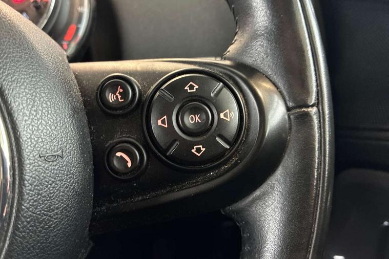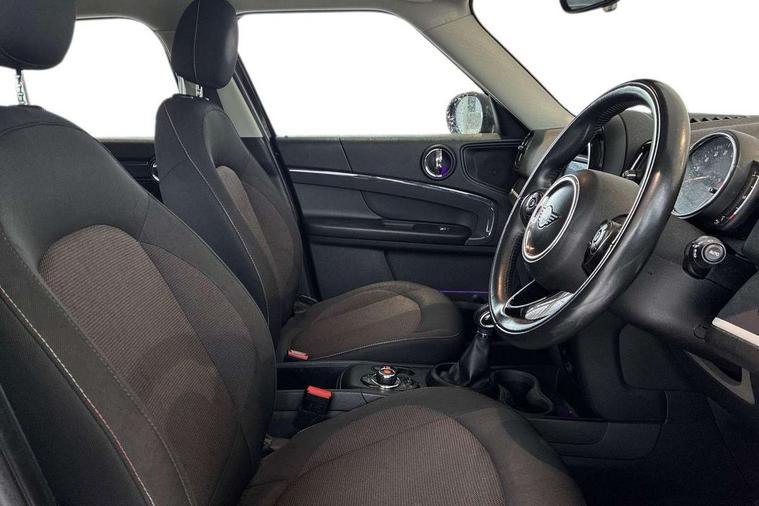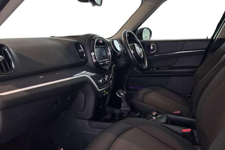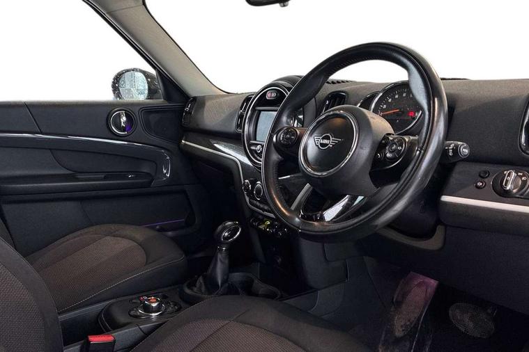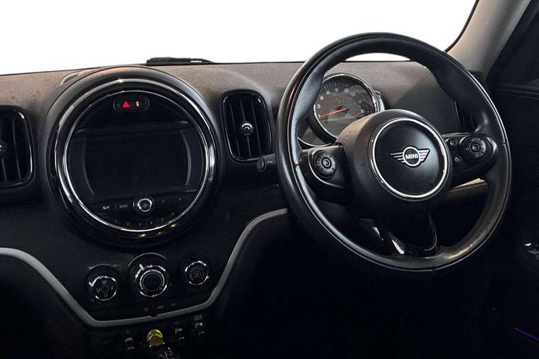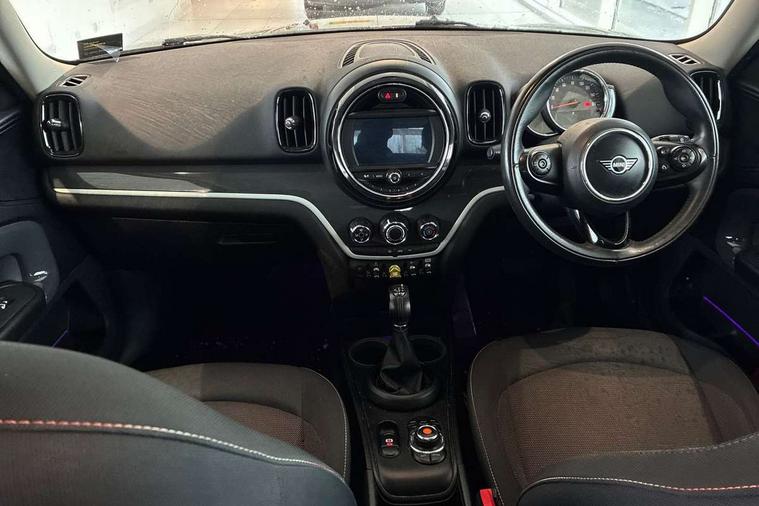 Apple CarPlay preparation, Brake pad wear indicator warning light, Central display with LED ring and 6.5" colour touch screen, Connected driver, DTC - Dynamic traction control, eDrive Services, Exterior temperature gauge, Intelligent emergency call, MINI Driving Modes - centre toggle switch to control driving setting (sport, mid and green), MINI remote services, MINI TeleServices, Navigation system, On board computer, Personal Profile, Real time traffic information, Service interval indicator, Servotronic speed sensitive power steering, Electronic differential lock, Performance Control, Auxiliary input socket, DAB digital radio module, MP3 compatible radio/single CD player, Radio visual boost, Anti dazzle rear view mirror, Body colour scoop integrated into engine- compartment lid, Chrome door handles, Chrome exhaust tailpipe, Chrome headlight surround, Chrome plated radiator grille, Chrome side scuttle, Chrome window surround, Electric front windows + one touch + anti-pinch, Electrically adjustable door mirrors, Follow me home headlights, Green tinted glass, Heated door mirrors/heated windscreen washers, Heated rear window with automatic switch off, Metal look door sill finishers, Rain sensor including auto headlights activation, Rear wiper, Roof spoiler, White indicator lights, 12V power point front, 2 cupholders in front centre console, 4 lashing points to secure luggage, 40:20:40 split folding rear seats, Centre console storage box, Charging cable, Chrome interior door handles, Driver/passenger sunvisors, Front and rear headrests, Front interior light, Front passenger grab handle, Front seat backrest storage nets, Heater with recirculation function, Height/reach adjust steering wheel, Isofix rear child seat preparation, Luggage compartment lighting, Multifunction steering wheel, Rear grab handles, Sensatec gearshift and handbrake, Storage compartments in doors, Toolkit in luggage compartment, Under floor storage in luggage area, Interior lights pack - Countryman, MINI Excitement Pack - Countryman, 3 point automatic seatbelts, 3 point seatbelts on all rear seats, ABS, Cornering brake control (CBC), Crash Sensor - activates hazard/interior lighting + unlocks doors, Driver and passenger airbags, Driver and passenger side airbags, DSC - Dynamic Stability Control, Electronic brake force distribution, Electronic parking brake, Front curtain airbags, Front passenger airbag deactivation, Fuel cut off safety device, Hill start assist, Pyrotechnically pre-tensioned front seatbelts, Tyre pressure warning, Automatic door locking, Keyless start, Locking wheel bolts, RF remote control central locking, Second remote key, Thatcham category 1 alarm + immobiliser,
