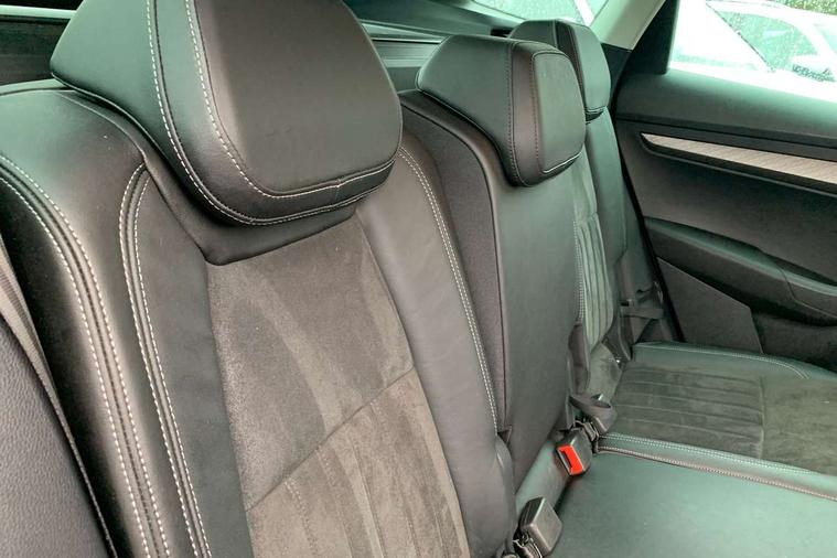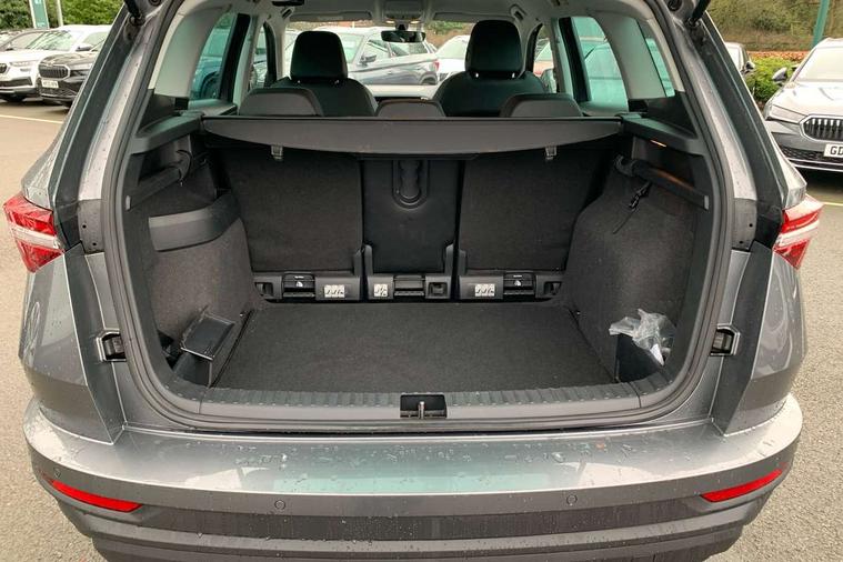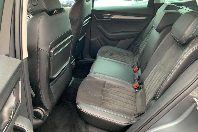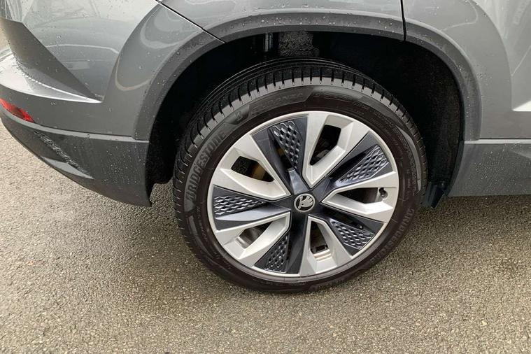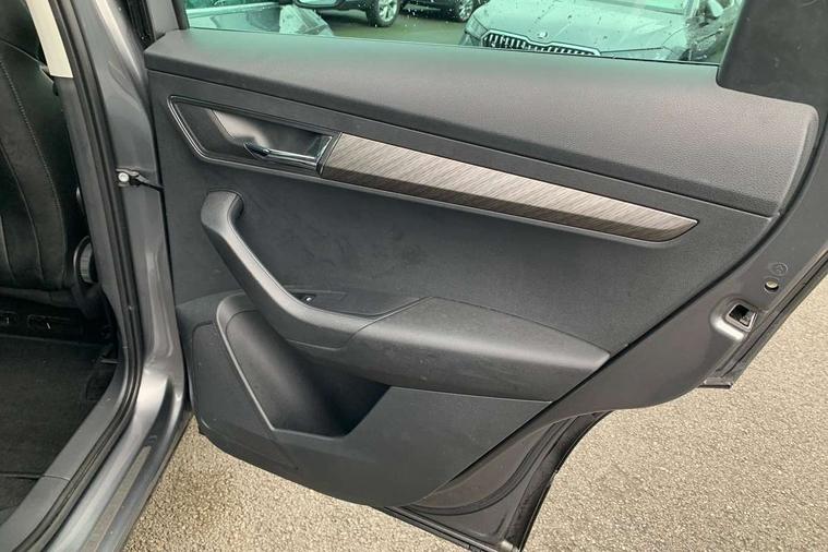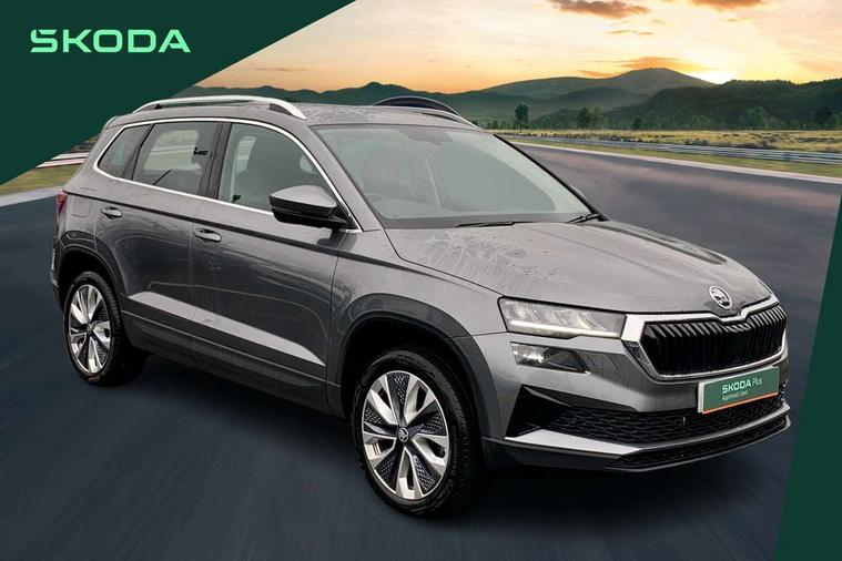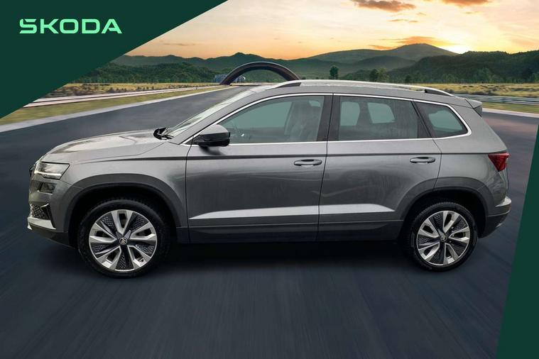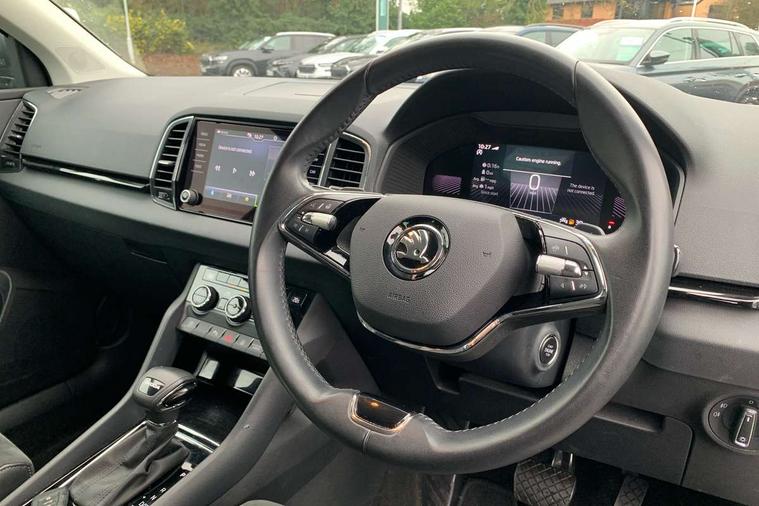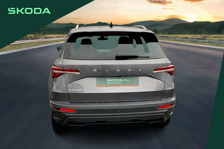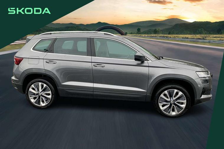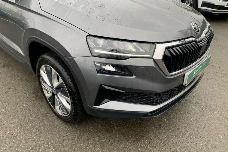 8" Digital display, Care connect, Driver fatigue sensor, Emergency services call system, Outside temperature gauge, Service interval indicator, SmartLink wireless for Apple and wired for Android, Start/stop system with regenerative braking, USB C Port x 2 in front centre console, 8 Speakers, DAB radio with Bluetooth, USB connection, Acoustic glass, Aero front windscreen wipers with intermittent function, Auto dimming rear view mirror with light and rain sensors, Black electric window control buttons, Body colour door mirrors and handles, Dynamic headlight range control with cornering light function, Electric front and rear windows with child proof lock, Heated rear windscreen, LED daytime running lights, LED rear lights with high functionality welcome effect and dynamic indicators, Light assistant (coming/leaving home/tunnel light), Plastic scuff plates, Privacy glass, Rear side wing doors, Rear spoiler, Rear window wiper with washer system and intermittent control, Safety reflectors on front doors, 1.5 litre bottle holders in driver and front passenger door panels, 12V socket in boot, 12v socket in front centre armrest with storage compartment and rear air vents, 2 Folding hooks and nets in boot, 2 spoke leather heated multifunction steering wheel with DSG paddles, 2 x Tablet holder, 3 rear height adjustable headrests, 3 seat bench in 2nd row, 4 foldable roof handles with rear coat hooks, Black floor carpet, Chrome inner door handles, Decorative door sills with KAROQ badging, Double sided boot floor, Foldable hooks in the boot, Front head restraints, Height adjustable front three point seats belts with tensioners, Height/reach adjust steering wheel, Ice scraper, Illuminated glovebox, Illuminated luggage compartment, Isofix child seat preparation for front passenger seat, Isofix child seat preparation outer rear, Manual lumbar support for front seats, Pen holder, Pollen filter, Rear boot cover, Rear reading lights, Rubbish bin door, Safety vest holder, Single front passenger seat, Storage box in upper central dashboard closed, Sunvisors with illuminated vanity mirrors, Textile floor mats, Ticket holder, VarioFlex seats with standard rear seat release, Chrome roof rails + chrome pack - Karoq, Parking pack - Karoq, Automatic door unlocking in case of crash, Automatic fuel cut off in case of crash, Child locks on rear doors, Driver airbag, Electronic parking brake with auto hold function, Emergency rear braking signal, ESC including ABS, MSR, ASR, EDS, HBA, DSR, RBS, MKB and traction control, Front side airbags, Hill hold control, Knee airbags, Passenger airbag with switch-off function, Pedestrian monitor, Seatbelt reminder signalisation and pretensioner for all seats, Three point seatbelts rear, Two tone horn, Tyre pressure display, Tyre pressure monitor, Alarm with interior monitoring, back up horn and tilt sensor with safe function, Electronic engine immobiliser, Keyless entry and start/stop, Remote central locking with 2 remote folding keys, Chrome framed air vents, 18" Procyon silver alloy wheels with anthracite aero inserts, Anti-theft wheel bolts protection, Storage on wheel cover, Tool kit,